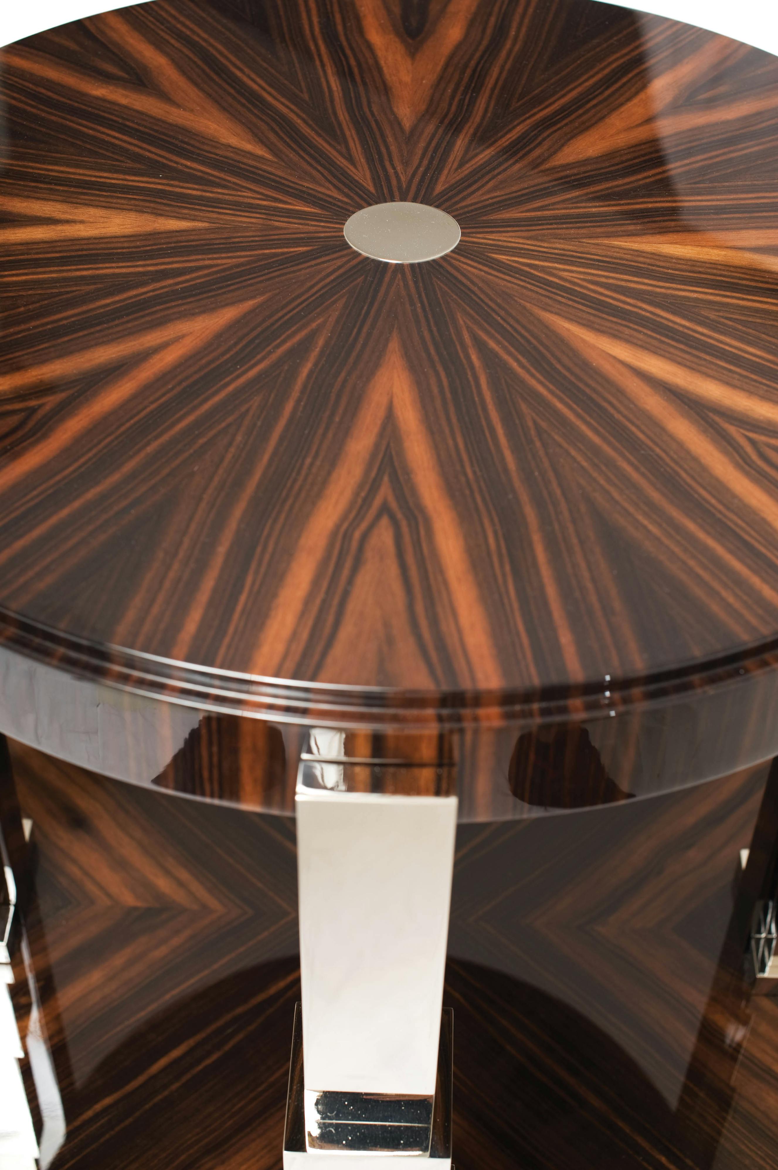 End table in sunburn Macassar ebony veneer, polished nickel and varnish finishing.