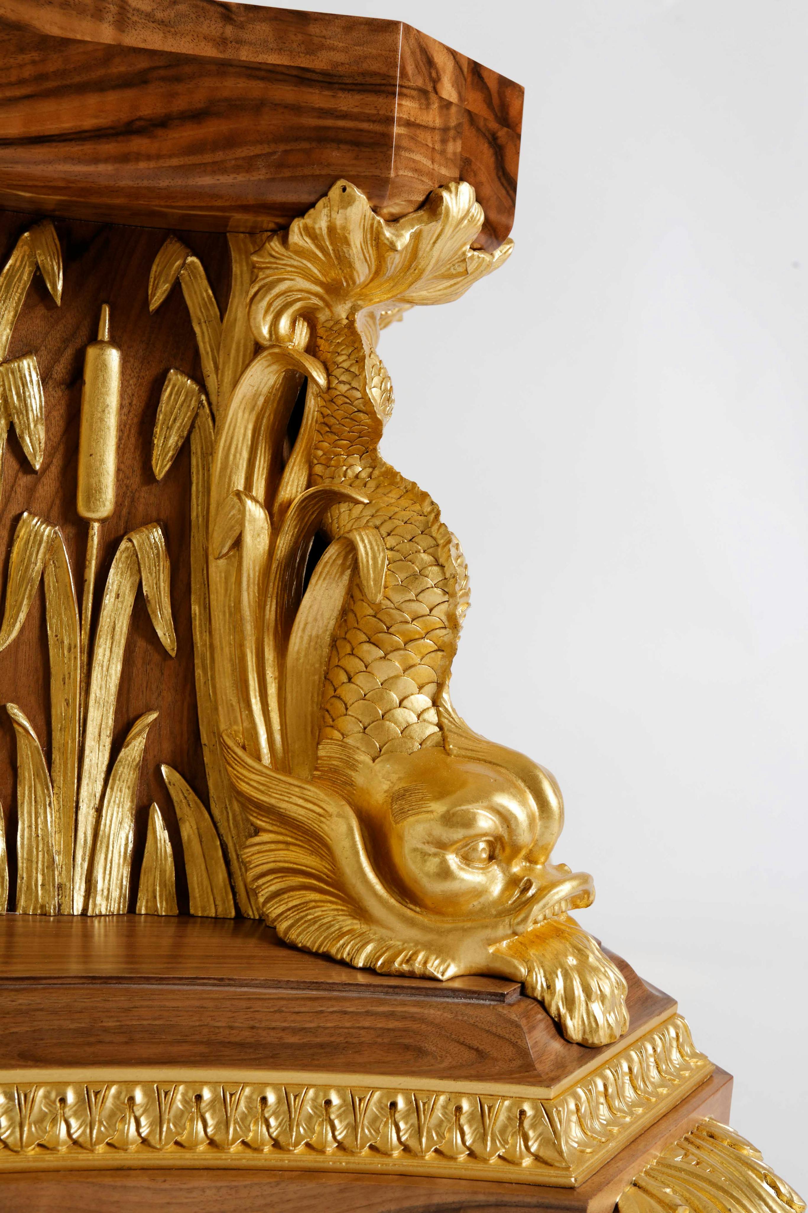 Table in solid walnut, gold leaf finishing and marquetry top inspired by 17th and 18th century French and Flemish paintings.