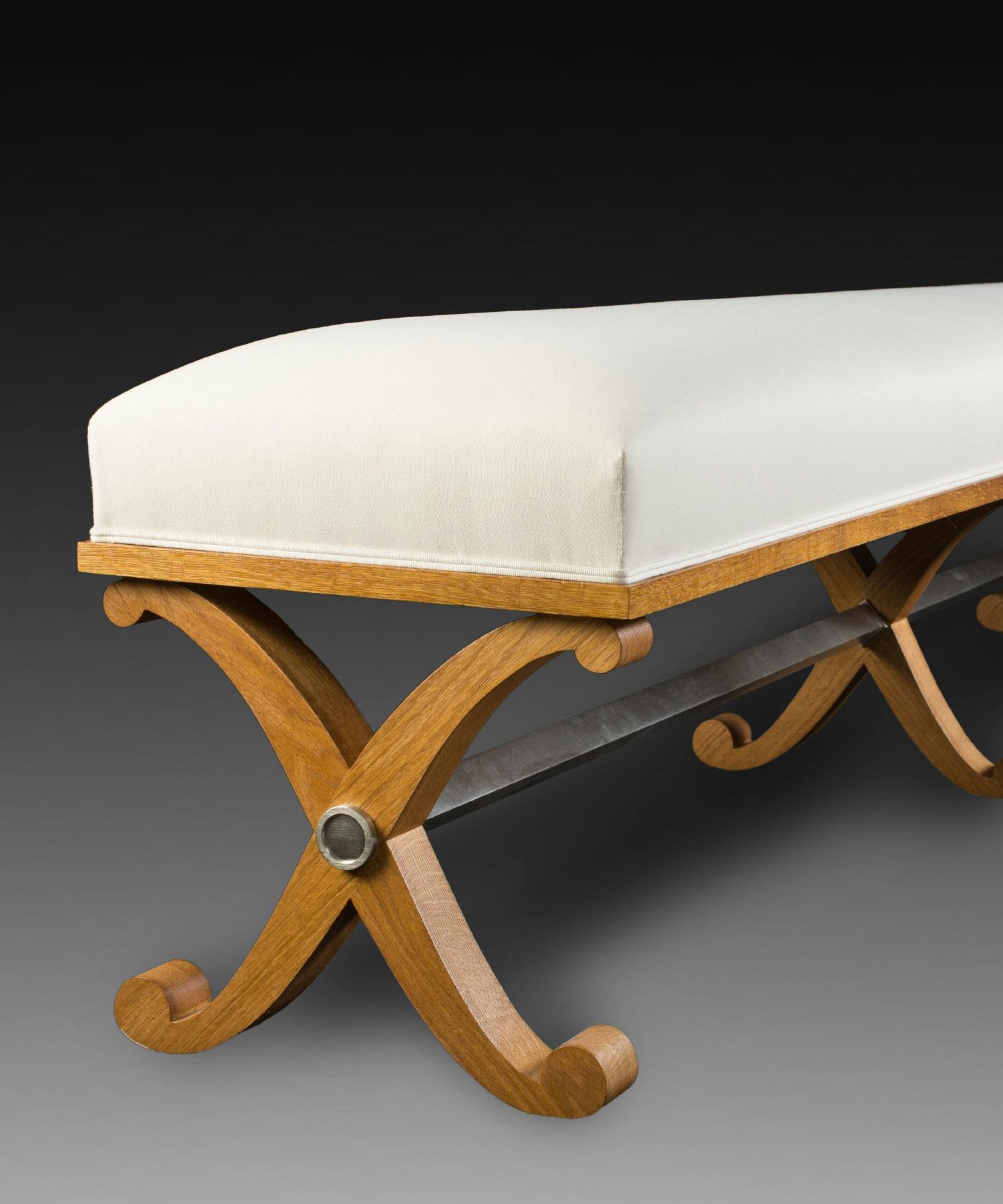 Fully ulpholsetered large bench with turned oak feet and matt nickel sabot.