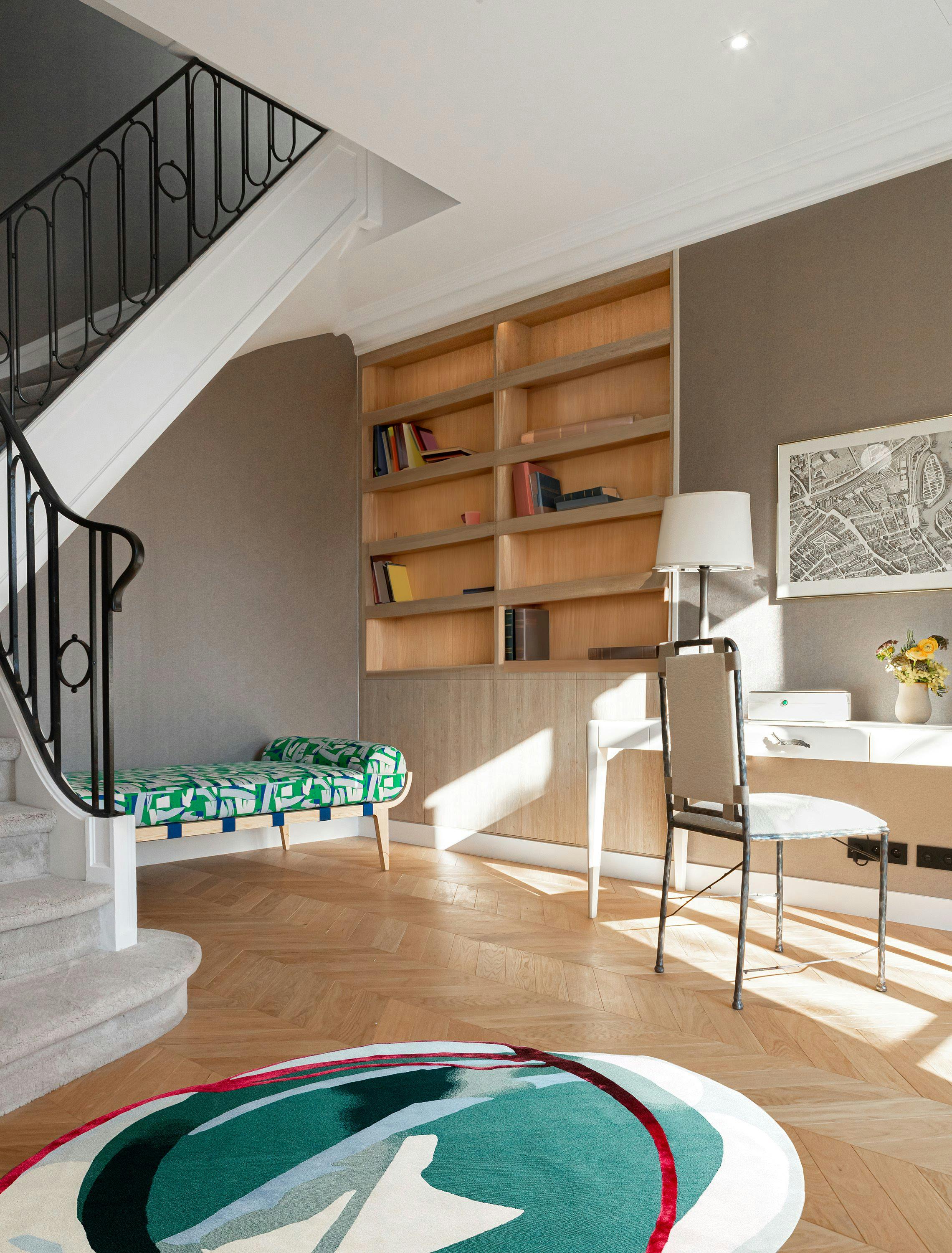 Imagined as an ensemble for a home office, Amarante includes a desk, a chair, a rug, an ottoman, a daybed, a bookcase and two columns.