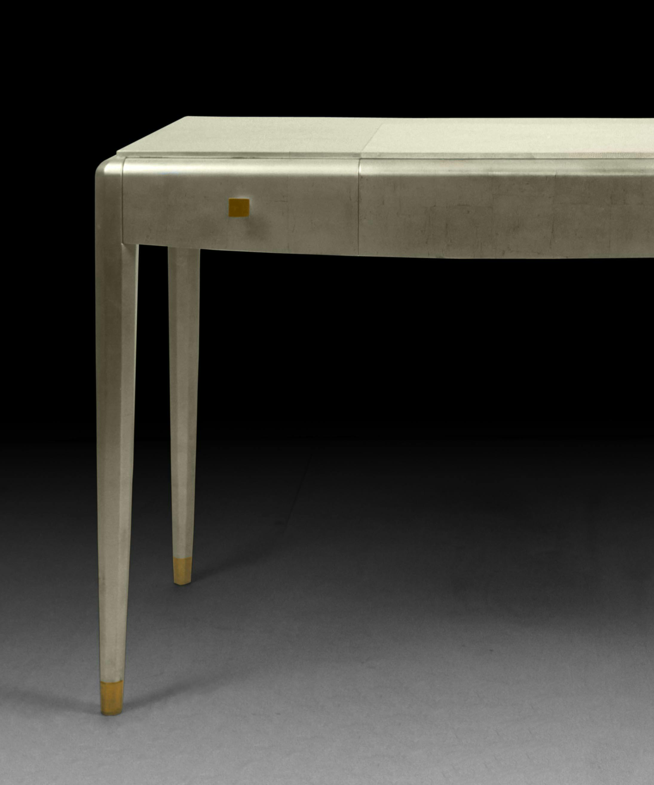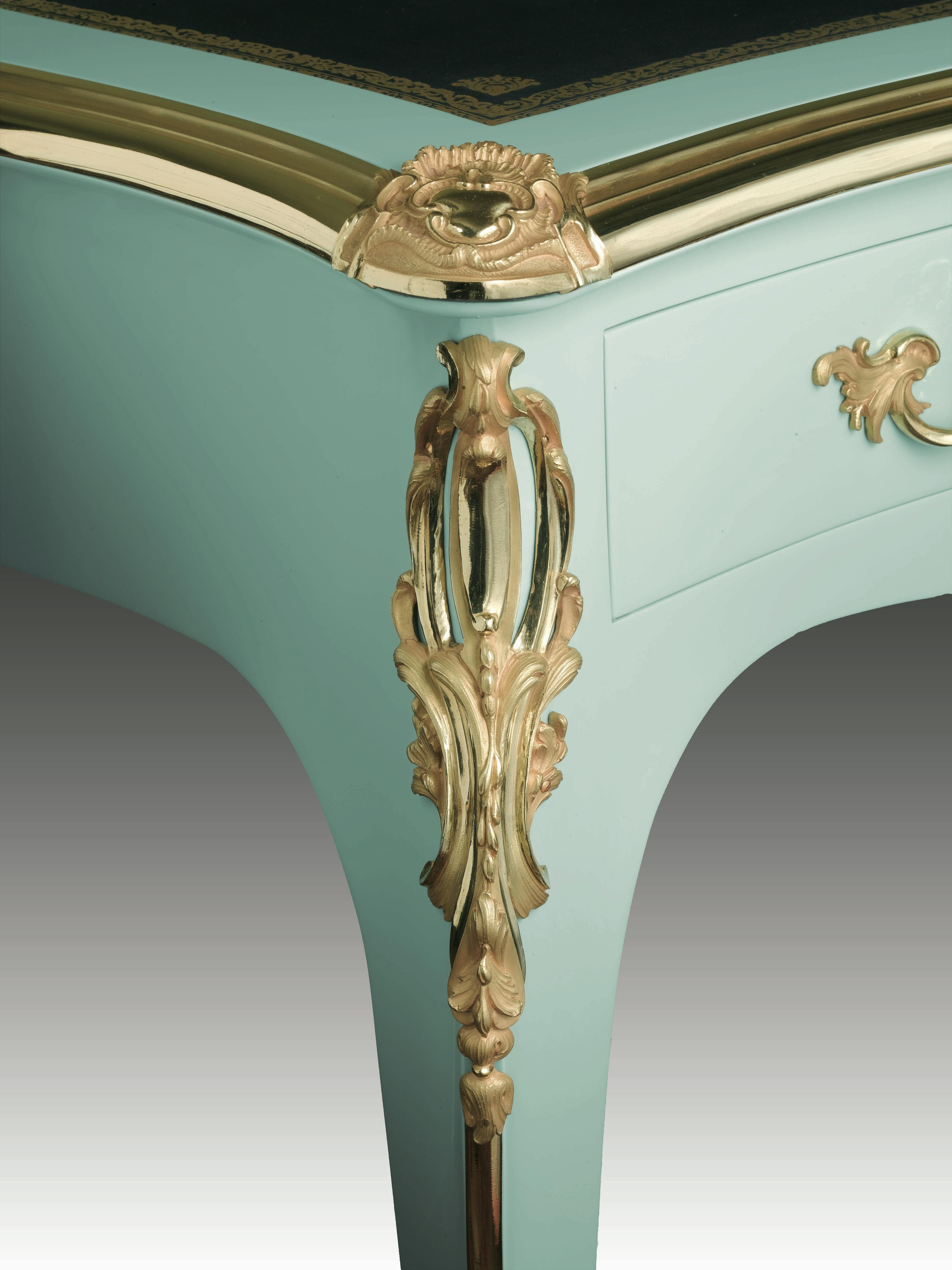 Desk in water gilding with white gold leaf, shagreen desk blotter and gilded bronzes set.