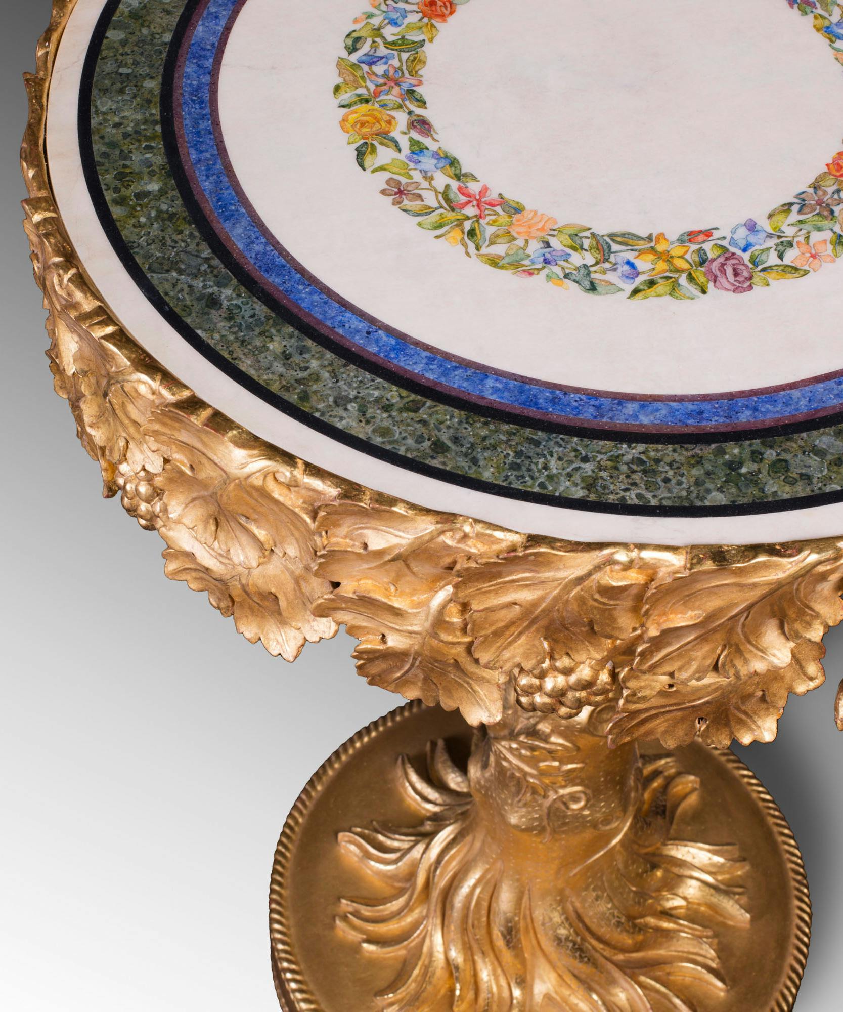 Italian style pedestal table in carved gilded wood and hand painted in faux "pietra dura".