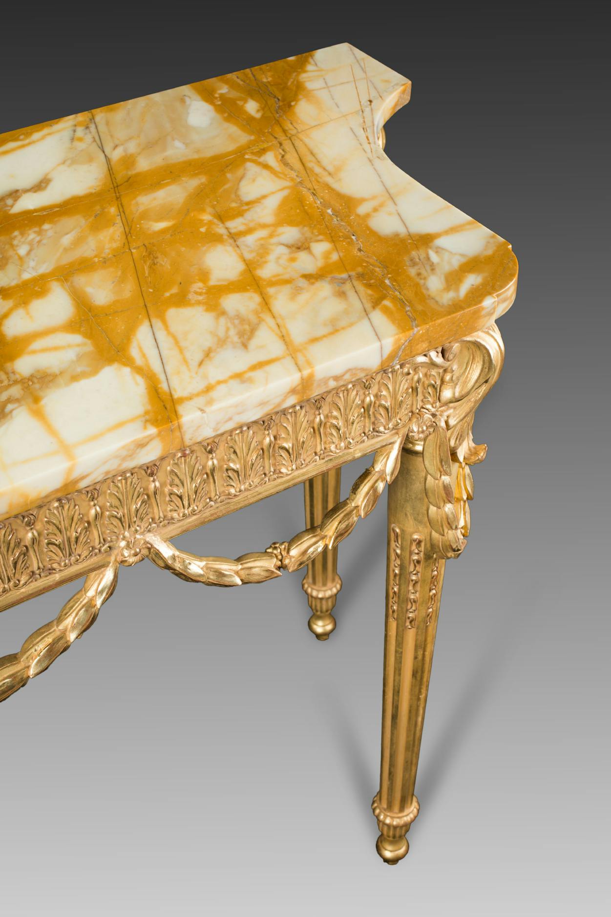 Louis XVI style console table in carved and gilded wood and Sienna yellow marble.