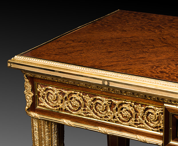 Louis XVI style Table in carved wood, mahogany pommele and gilt bronze.