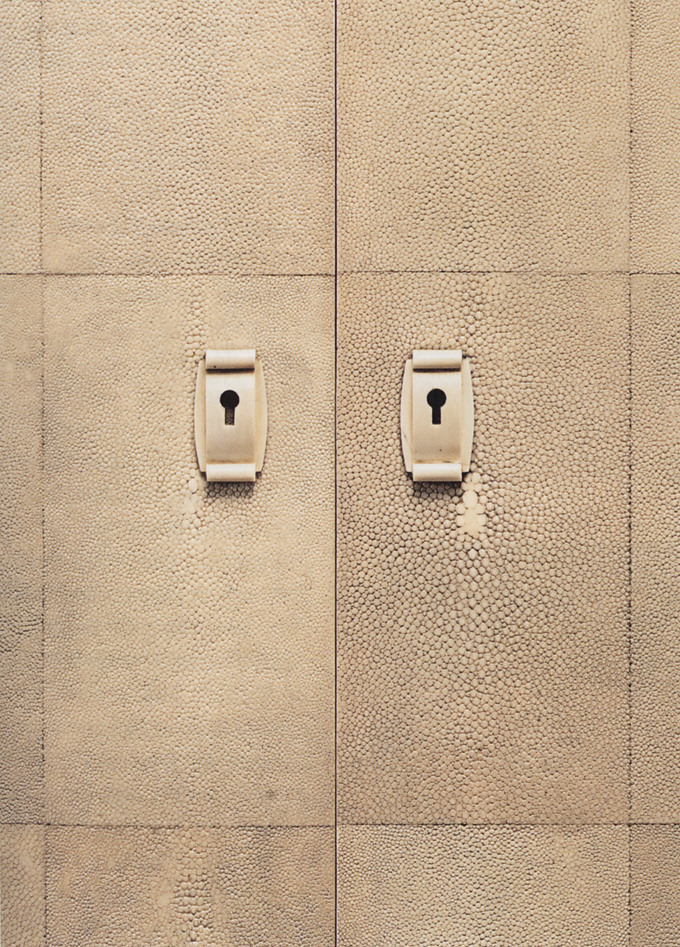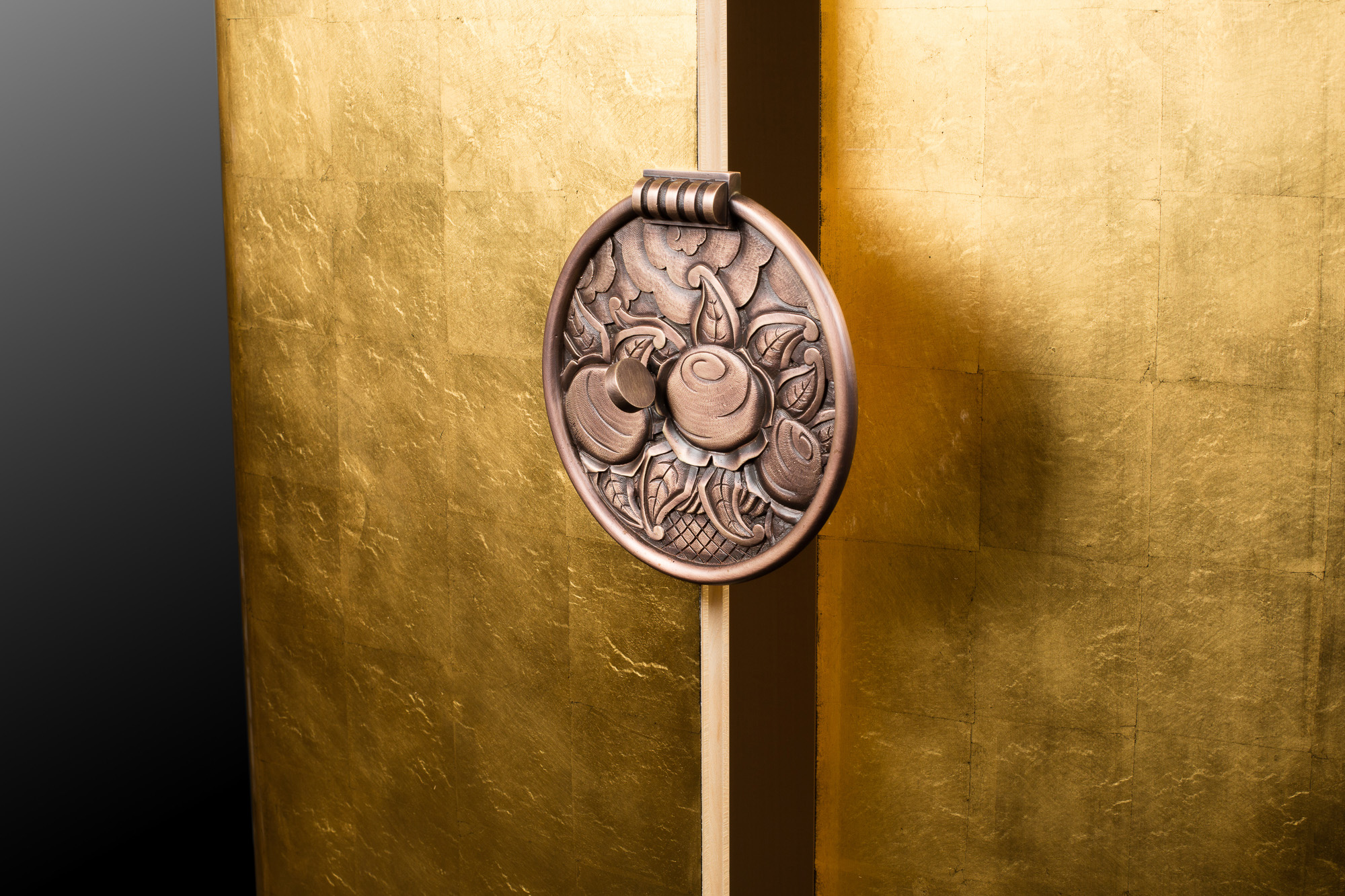 Cabinet in rosewood veneers, square gold leaves pattern and sand casted patina keyhole.