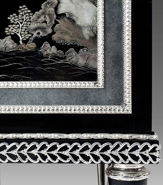 Louis XVI style sideboard in black lacquered, Chinese silver lacquer and silver-plated bronze hardware.