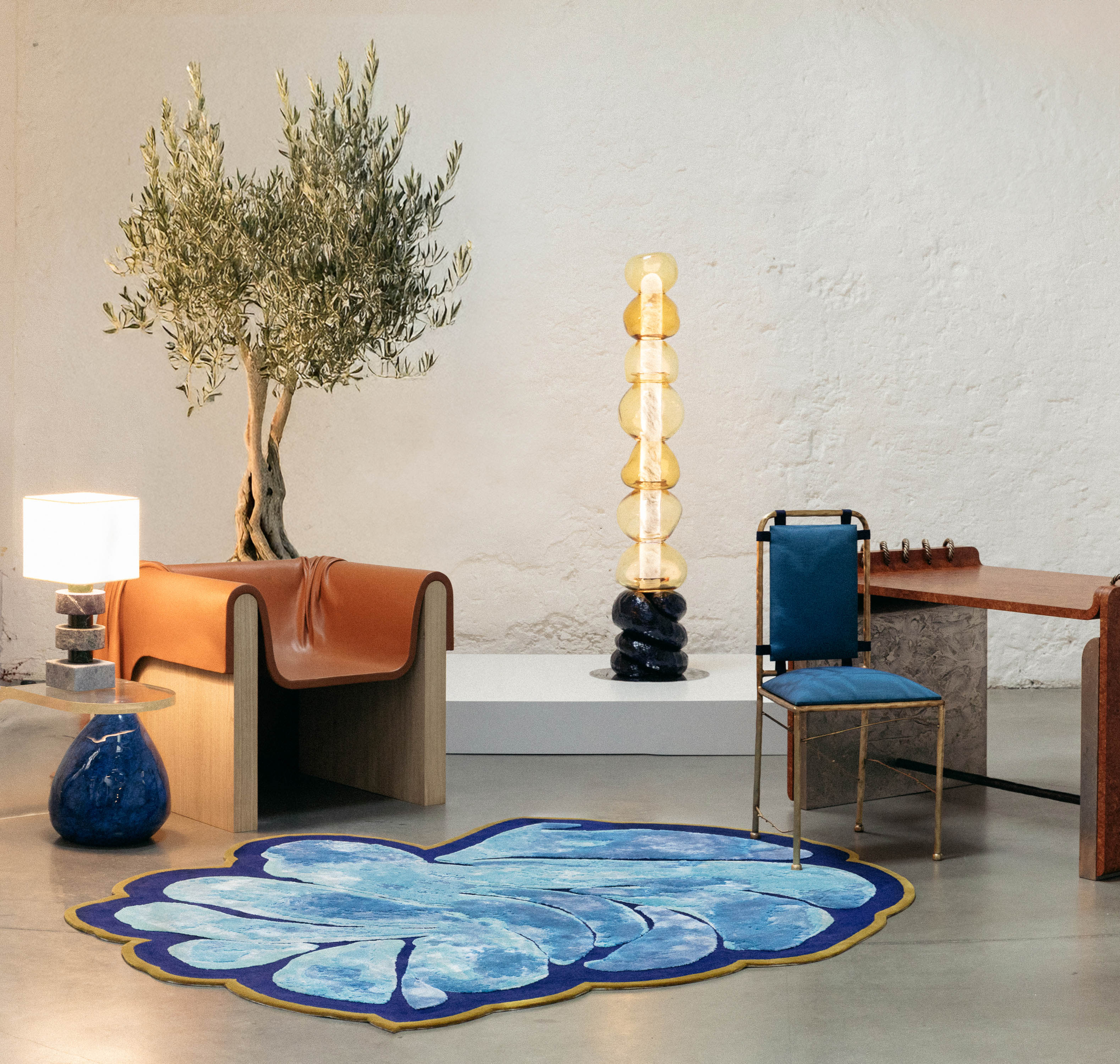 Imagined as an ensemble for a home office, Amarante includes a desk, a chair, a rug, an ottoman, a daybed, a bookcase and two columns.