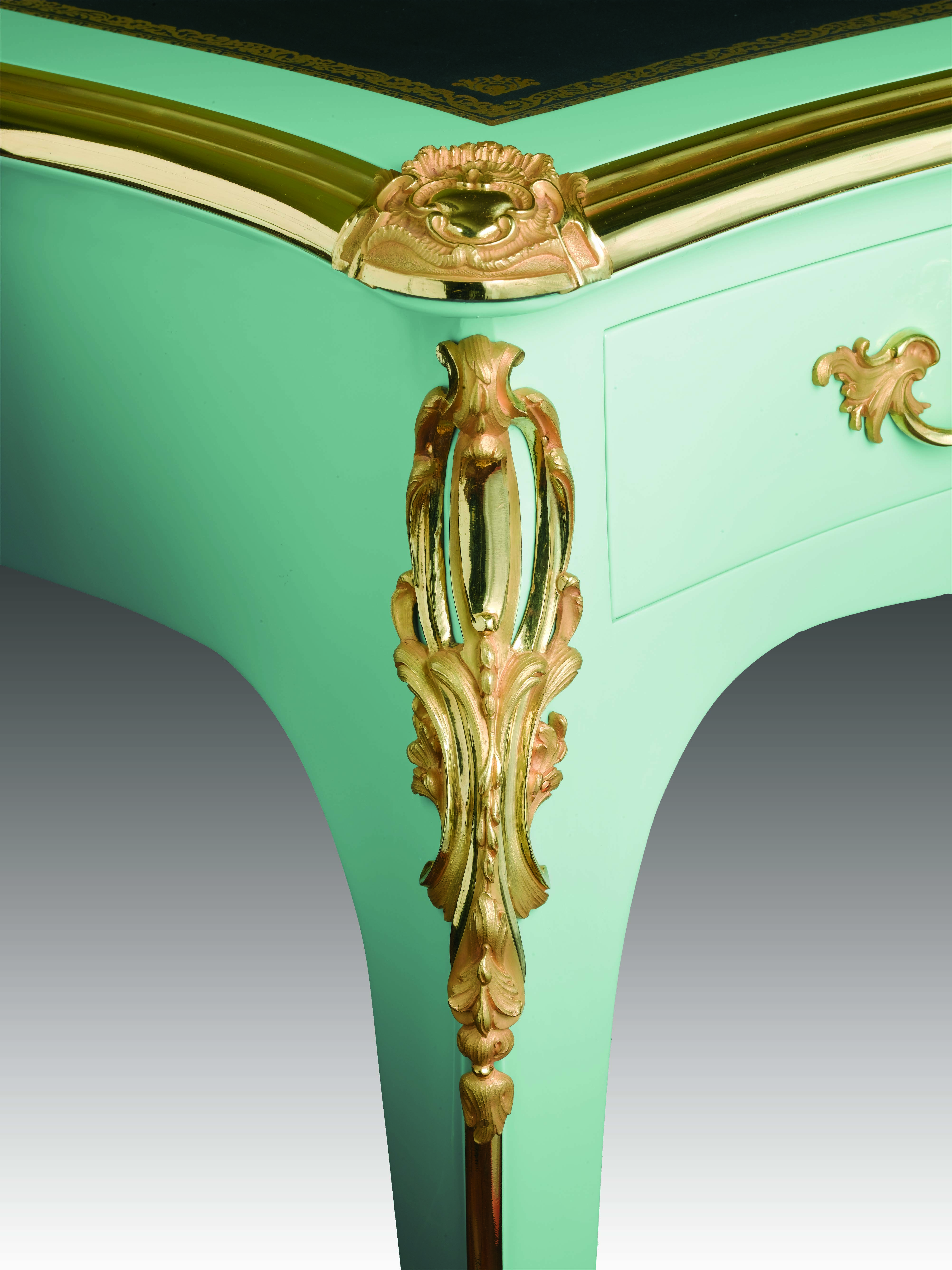 Desk in water gilding with white gold leaf, shagreen desk blotter and gilded bronzes set.