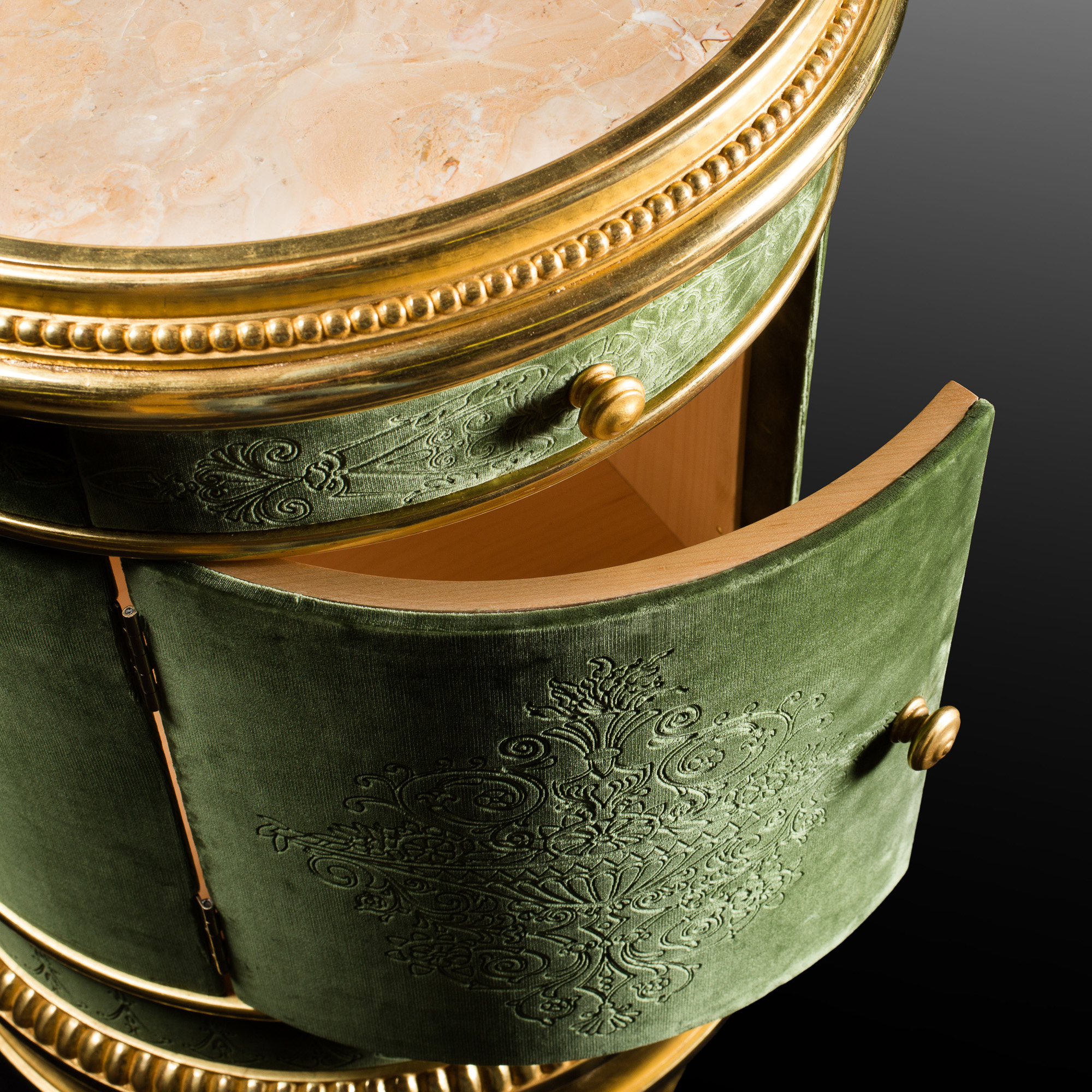 Charles X style bedside table in carved gilded wood, embossed silk velvet and marble.