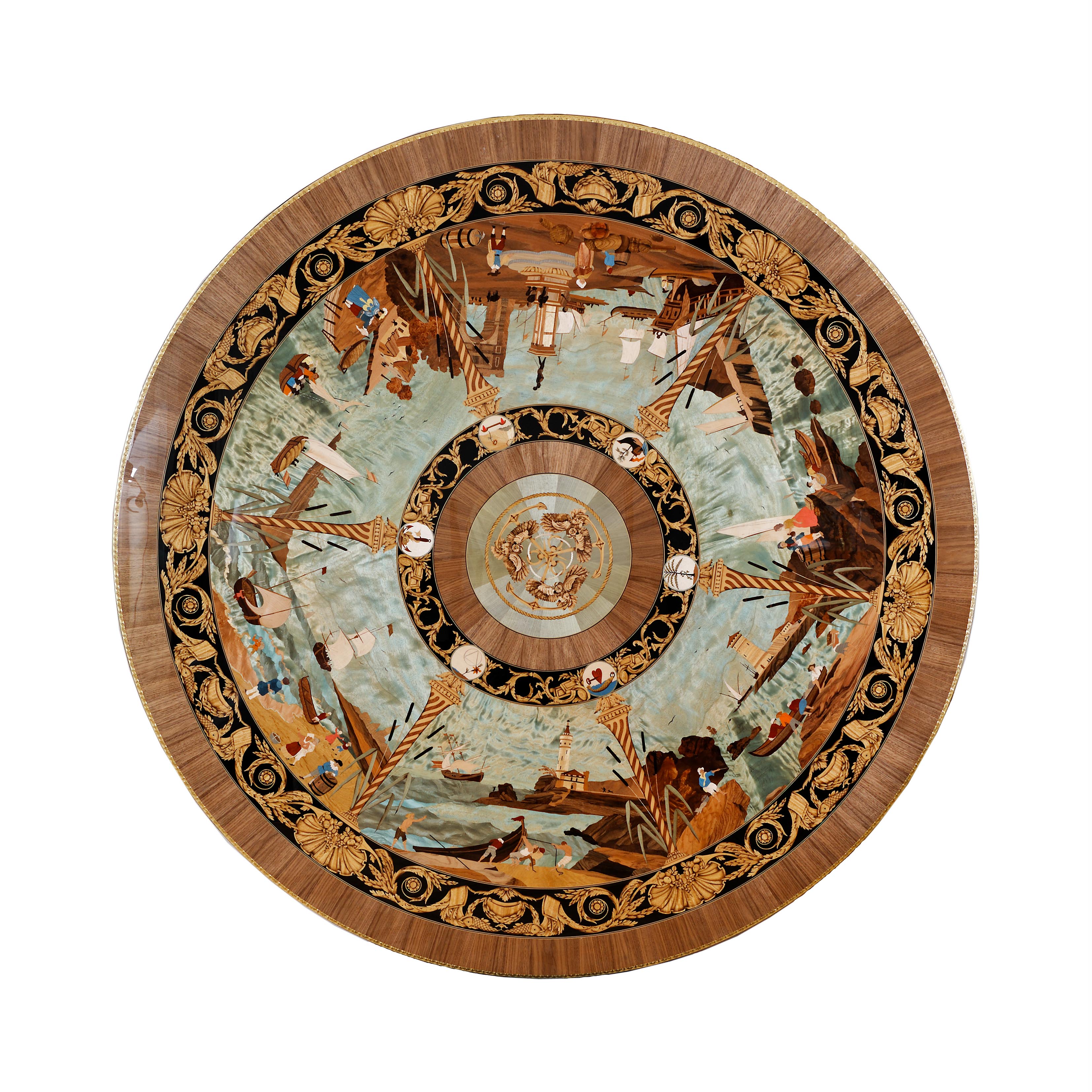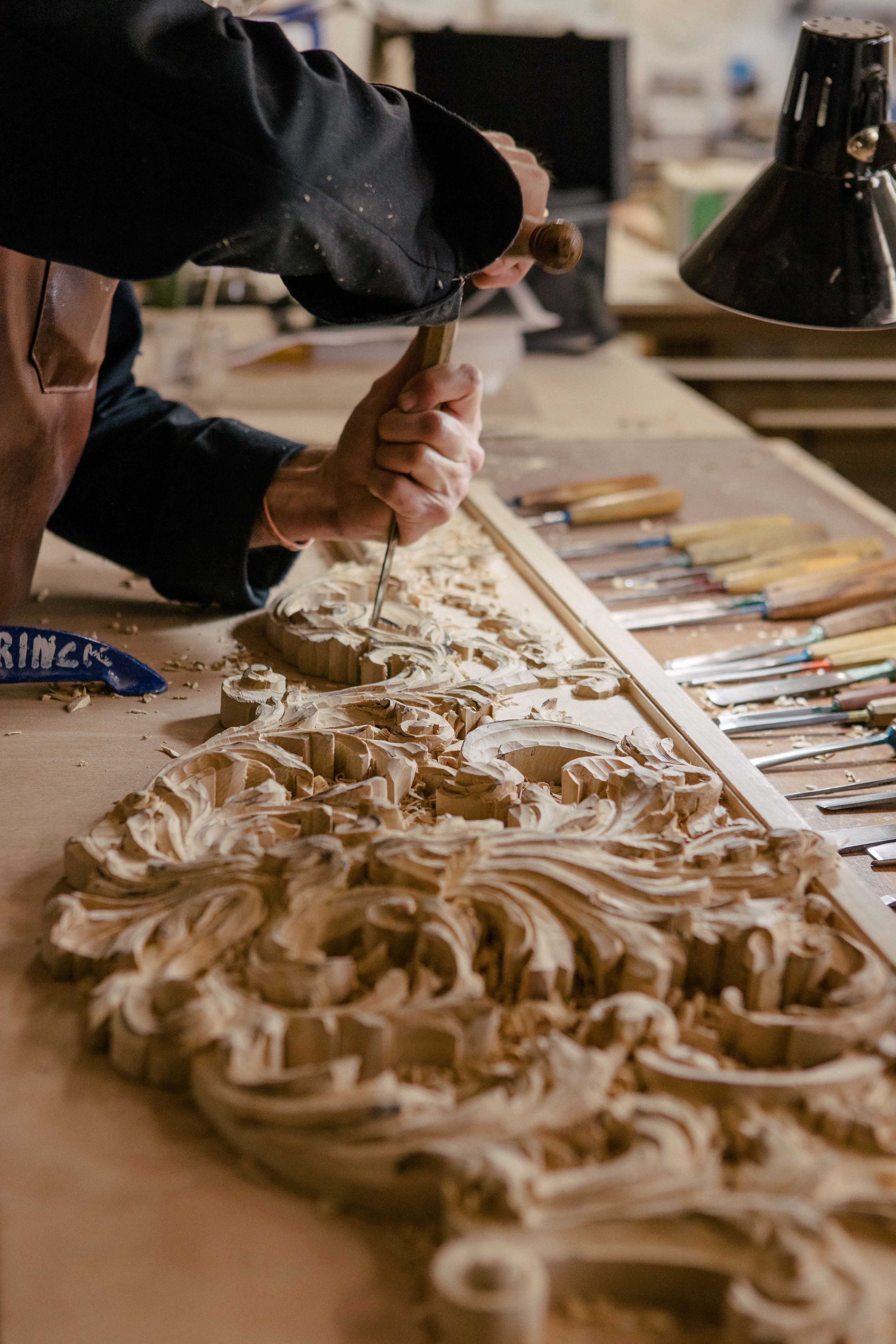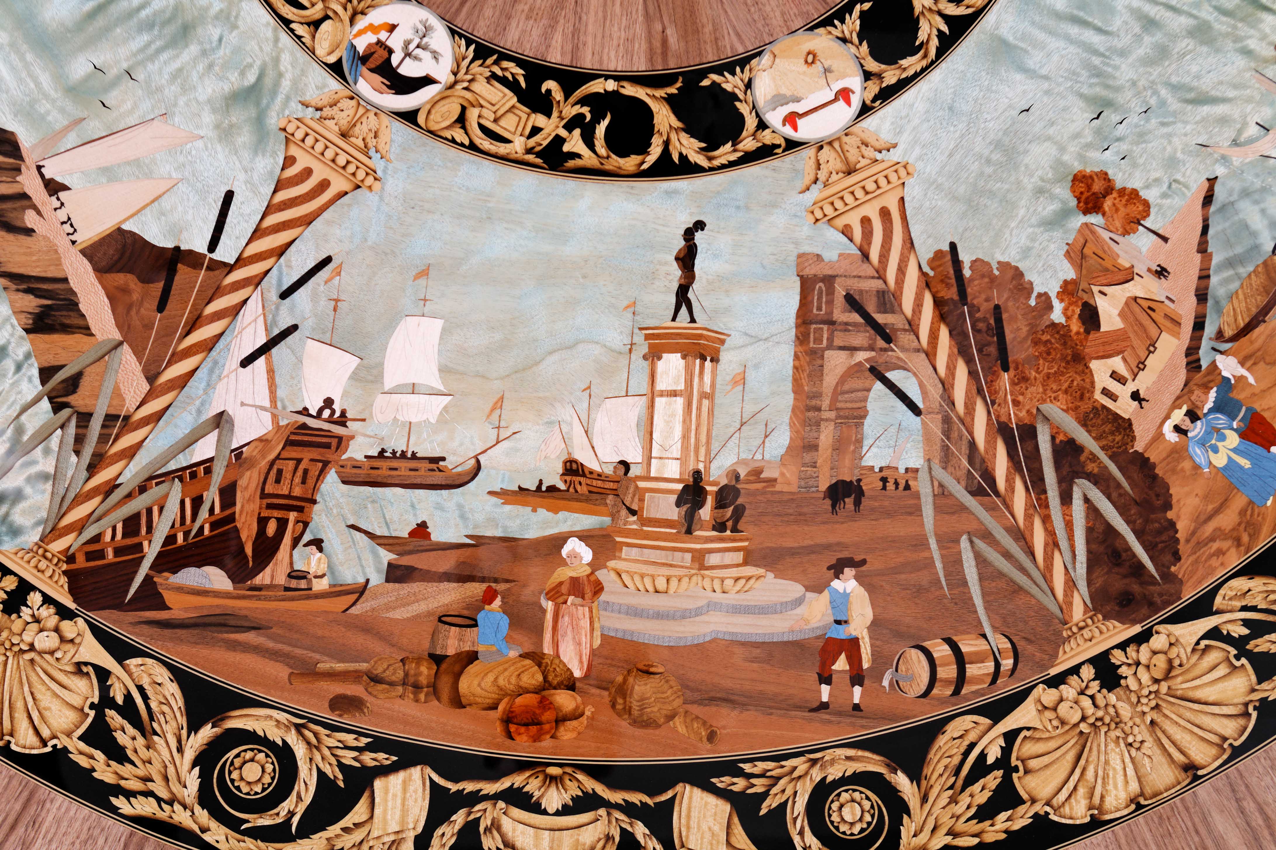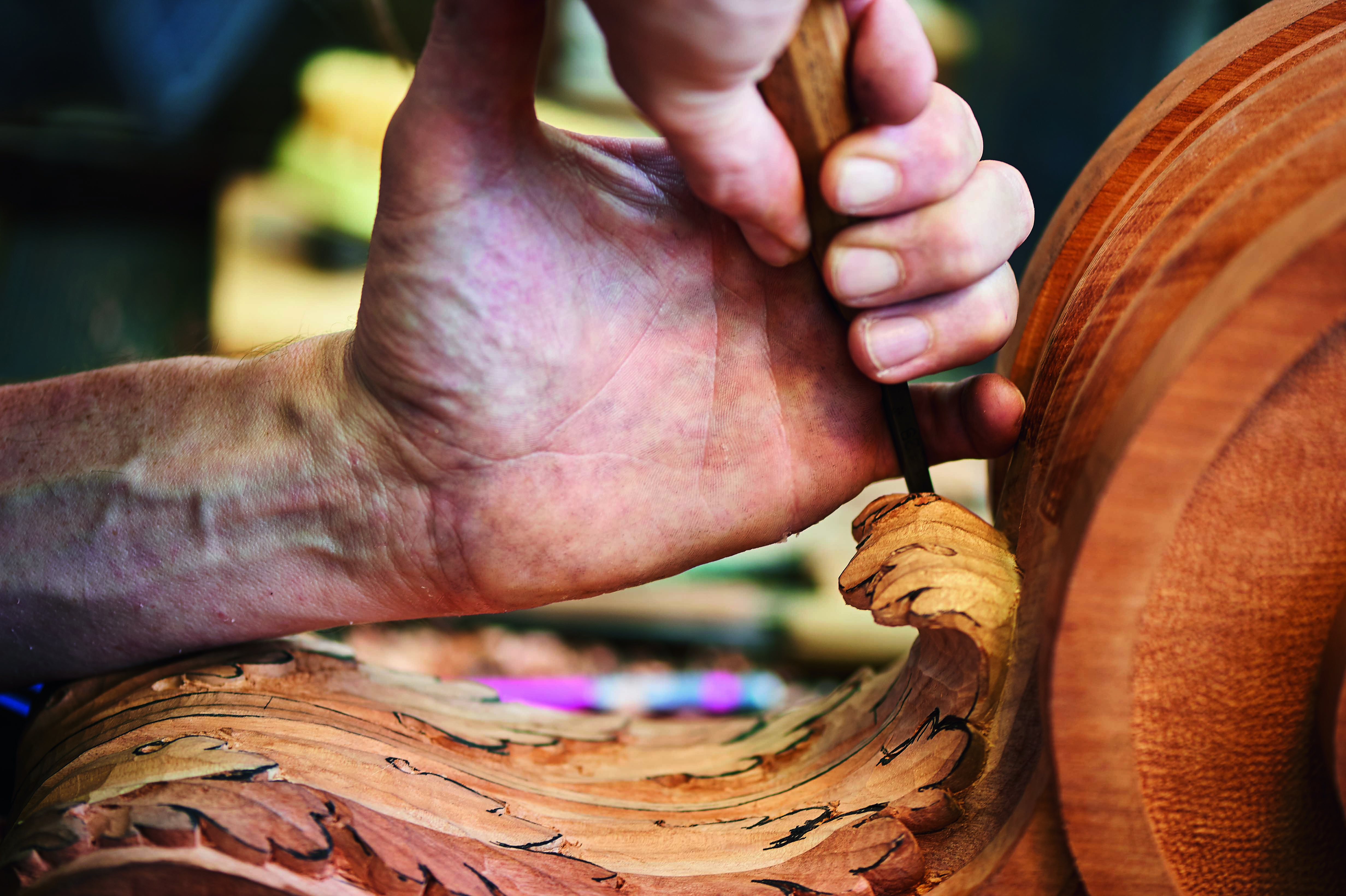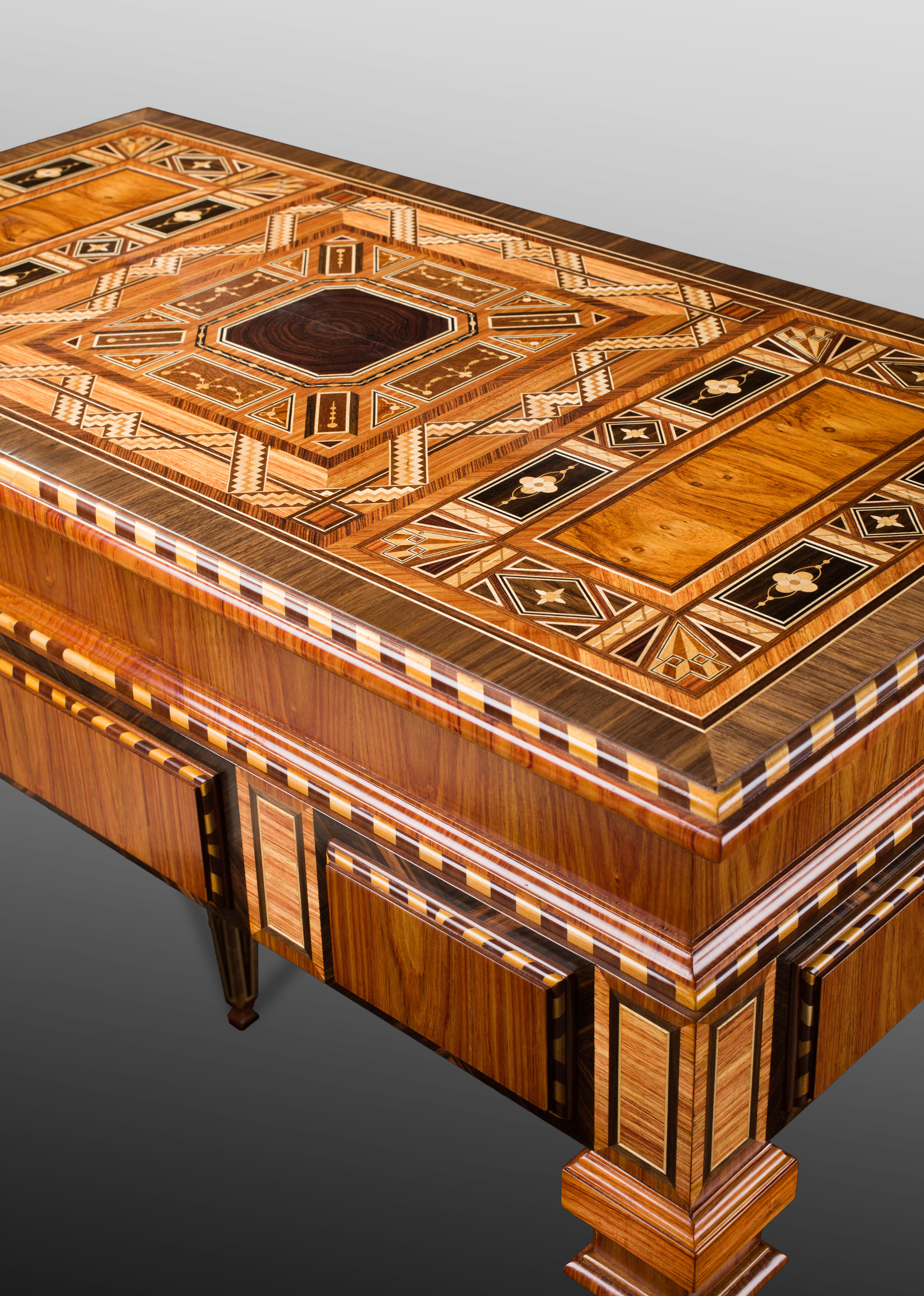 Marquetry is a process of composing an ornamental decoration with sheets of wood and any number and type of additional materials: from mineral to organic, from sedimentary to metallic. Geometric, floral, abstract, or figurative, embellishing and ennobling with stone, bone, or metal, marquetry is a craft that requires a creative mind and flawless knowledge of the characteristics of the countless wood species. For this art form that requires meticulousness, manual skill, finesse, and dexterity, the academic knowledge possessed by our craftspeople allows them great freedom of creative expression. Used for making parquet as well as furniture, marquetry has a vast spectrum of applications.
