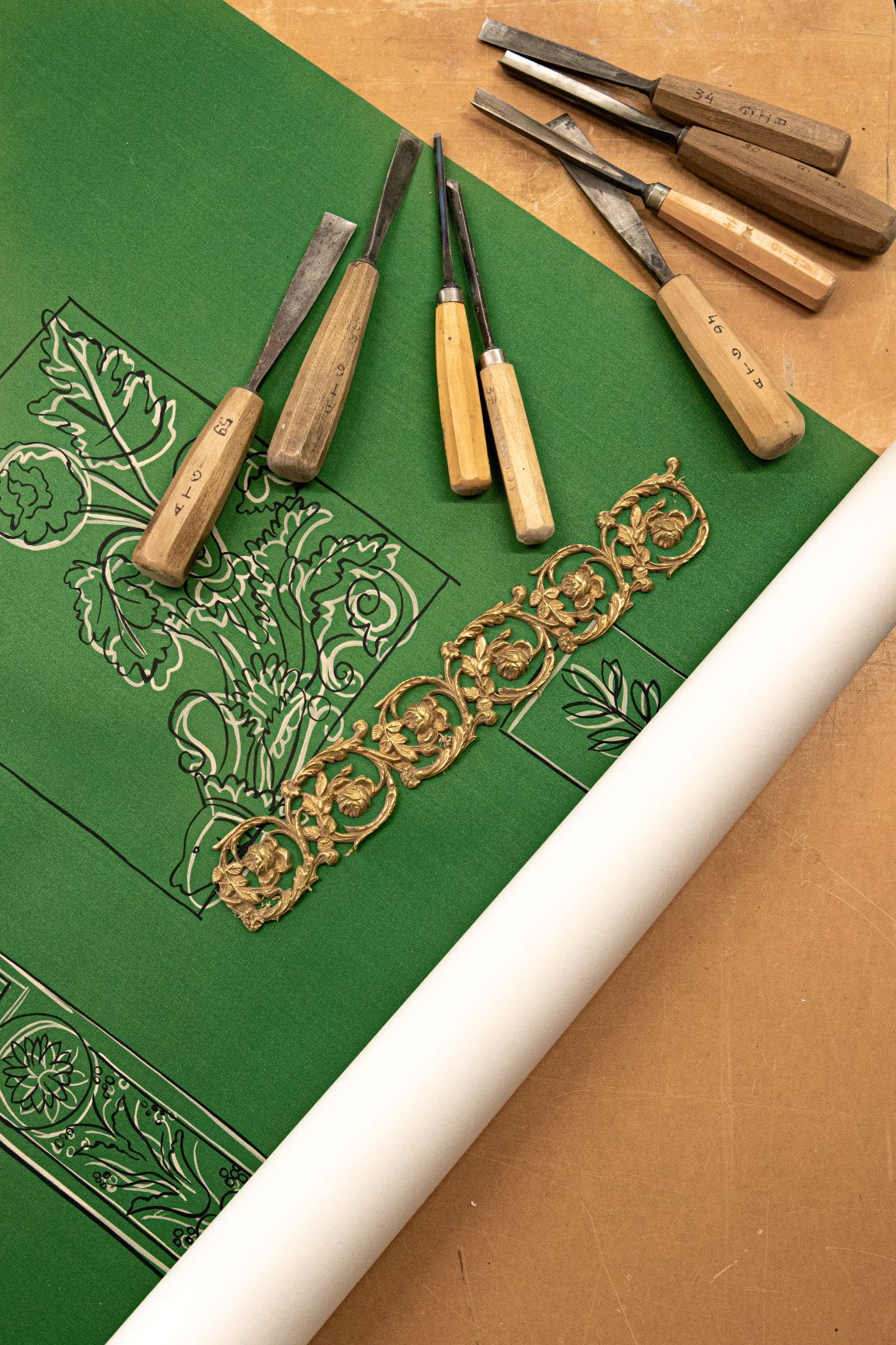 Understanding that historic references bring depth and longevity to a design, Rinck’s president Valentin Goux drew inspiration from the company’s woodcarving studio and the large-scale draftsman’s sketches of decorative molds used in their interior projects.