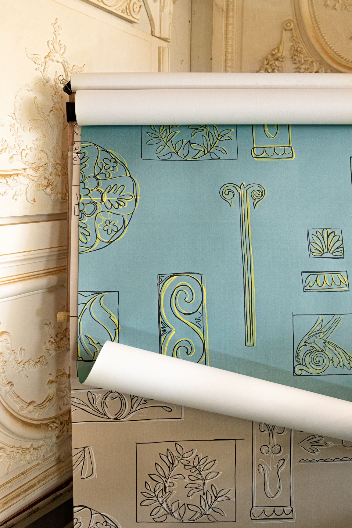 “The Classicist Sketchbook” is available in six colors : Almond, Safran, Cobalt, Vanilla, Ciel, and Thyme. Rendered with two different-colored lines to illustrate the depth of the mold, the sketches express the size, depth, and detailing of ornamentation in the carved wood and in bronze. The original sketches were redrawn by Rinck textile designer and then placed across a repeat of three panels, creating the appearance of a page from a designer’s sketchbook.