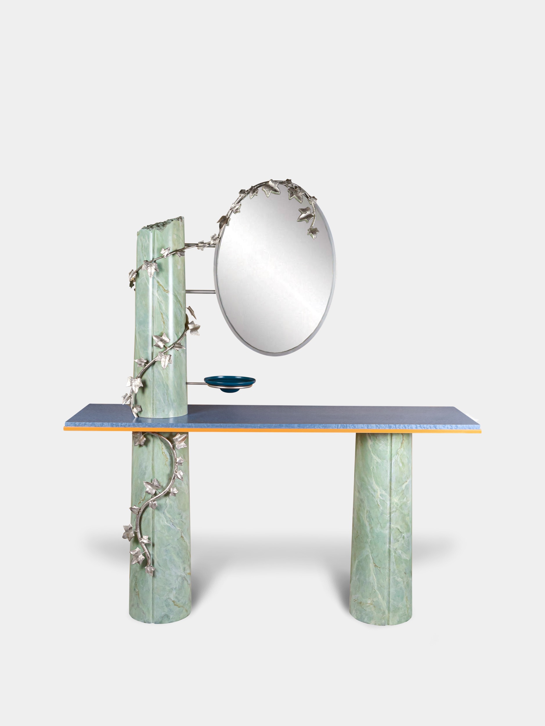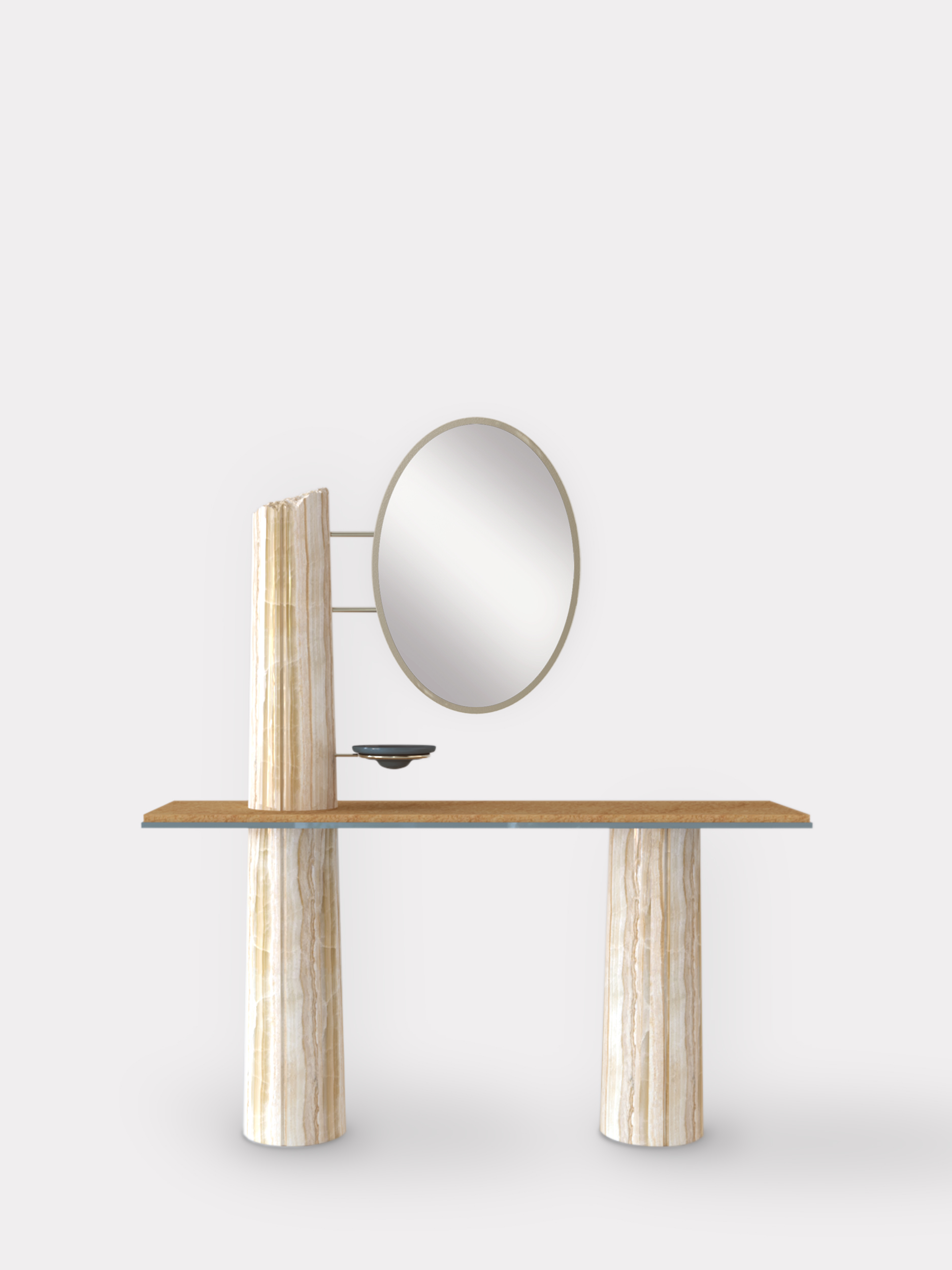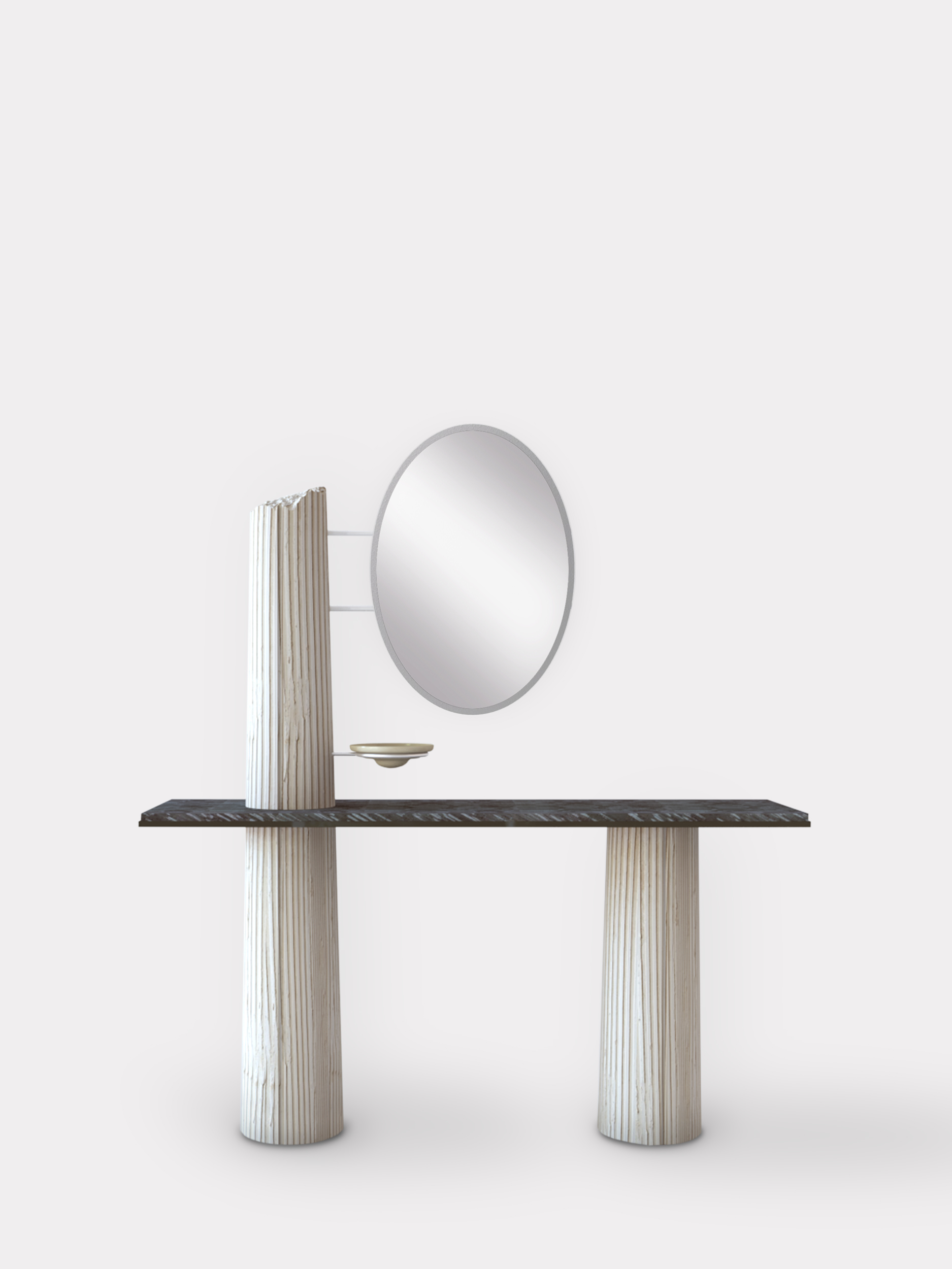 By featuring raw wood, or by imitating nature with trompe-l'oeil painting recalling onyx, the collection’s elements tease and intrigue the observer. Vegetation is invited to reclaim its rightful place, making this entrance to the home, this transition between two worlds, an embodiment of our uncertainty about our planet’s future, as questions of ecological disaster and climate crisis loom on the horizon.