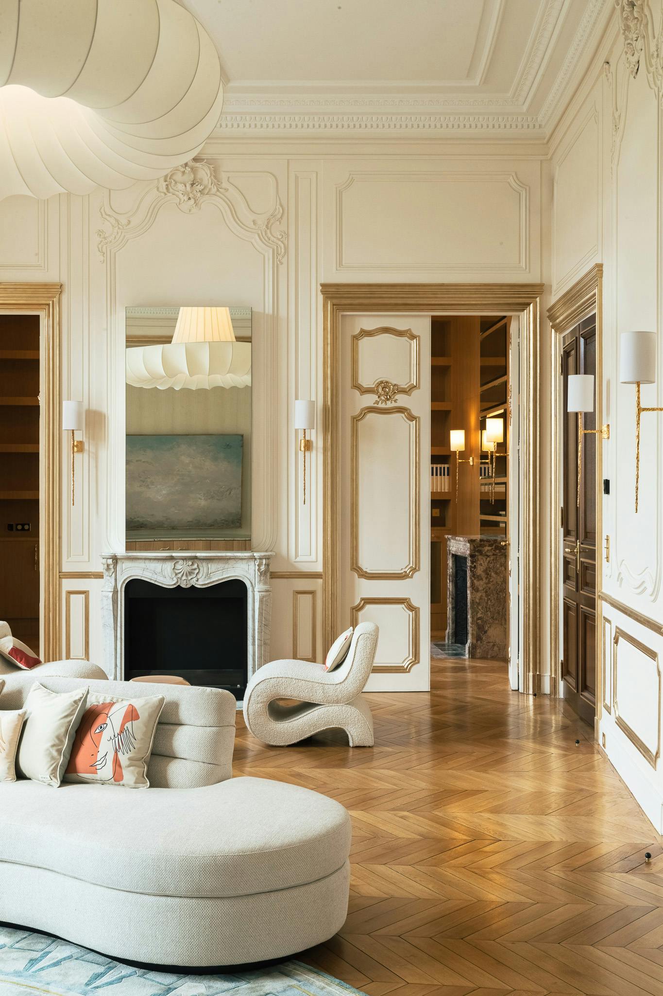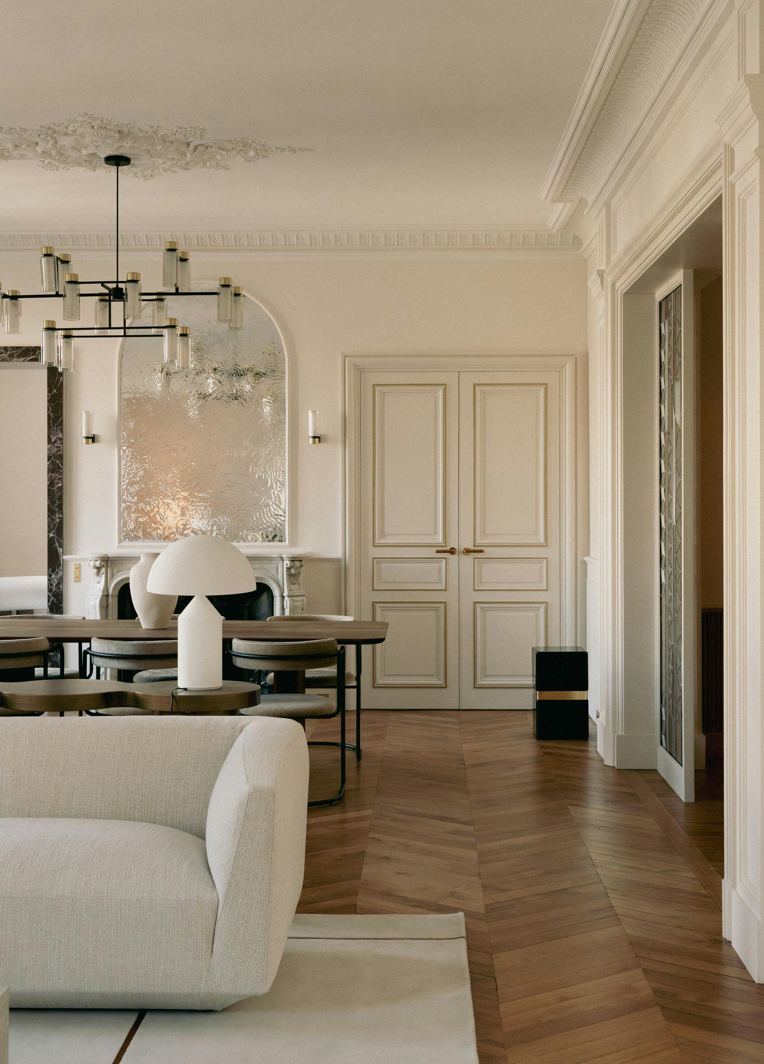 Located in the heart of Paris, in the Faubourg Saint-Honoré district, this apartment, nestled within a Haussmannian building, embodies the timeless elegance of Parisian architecture.