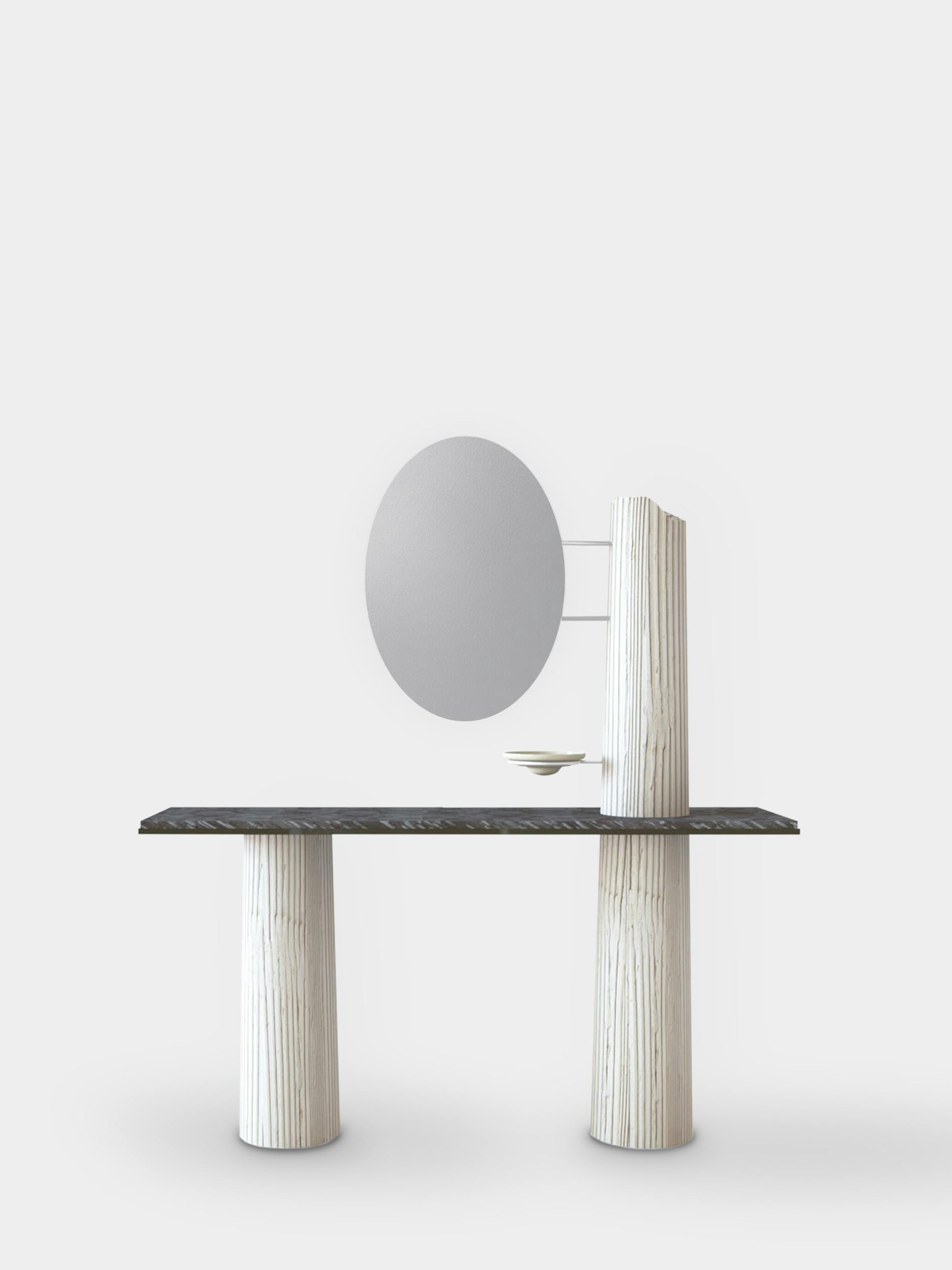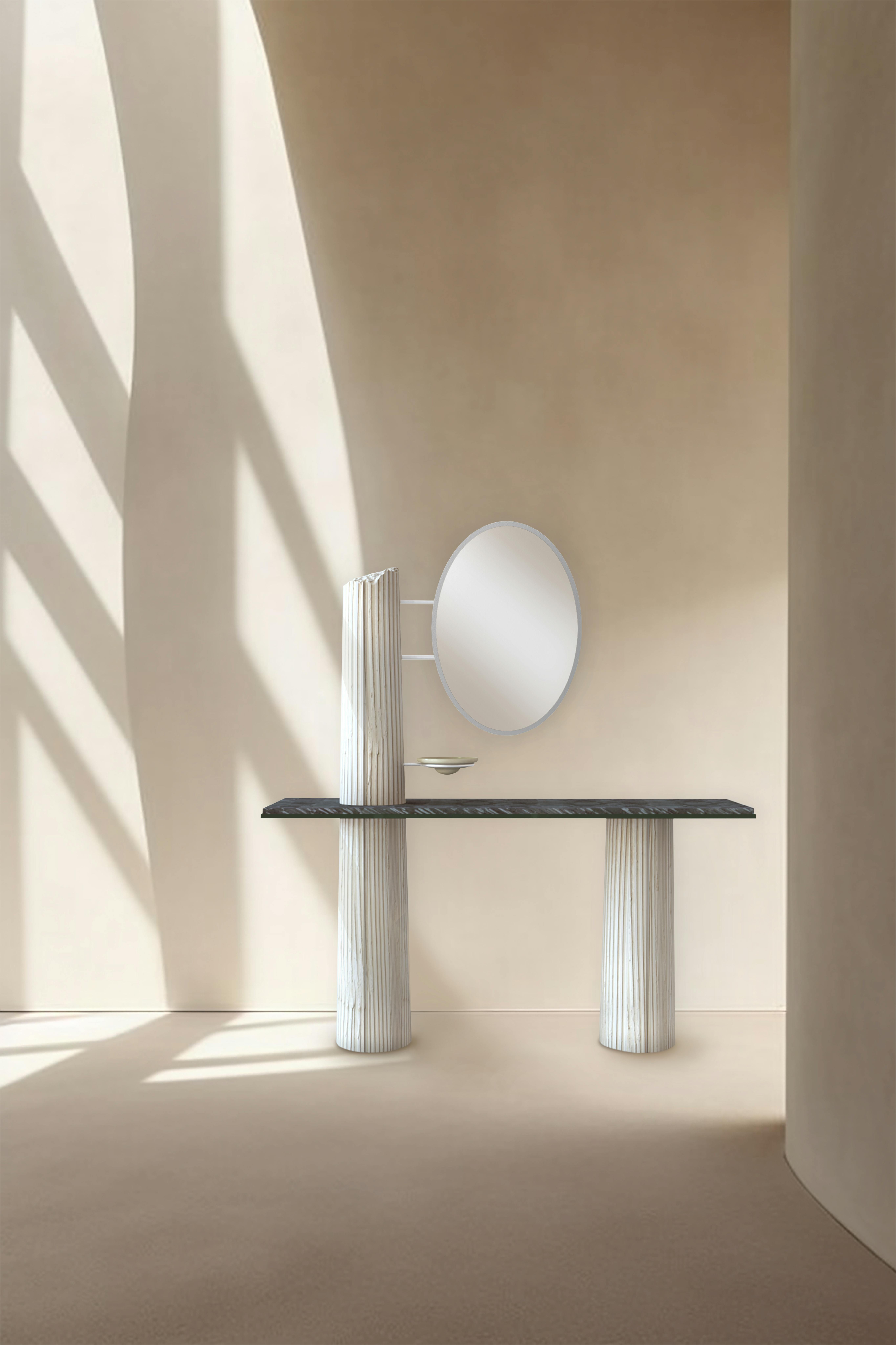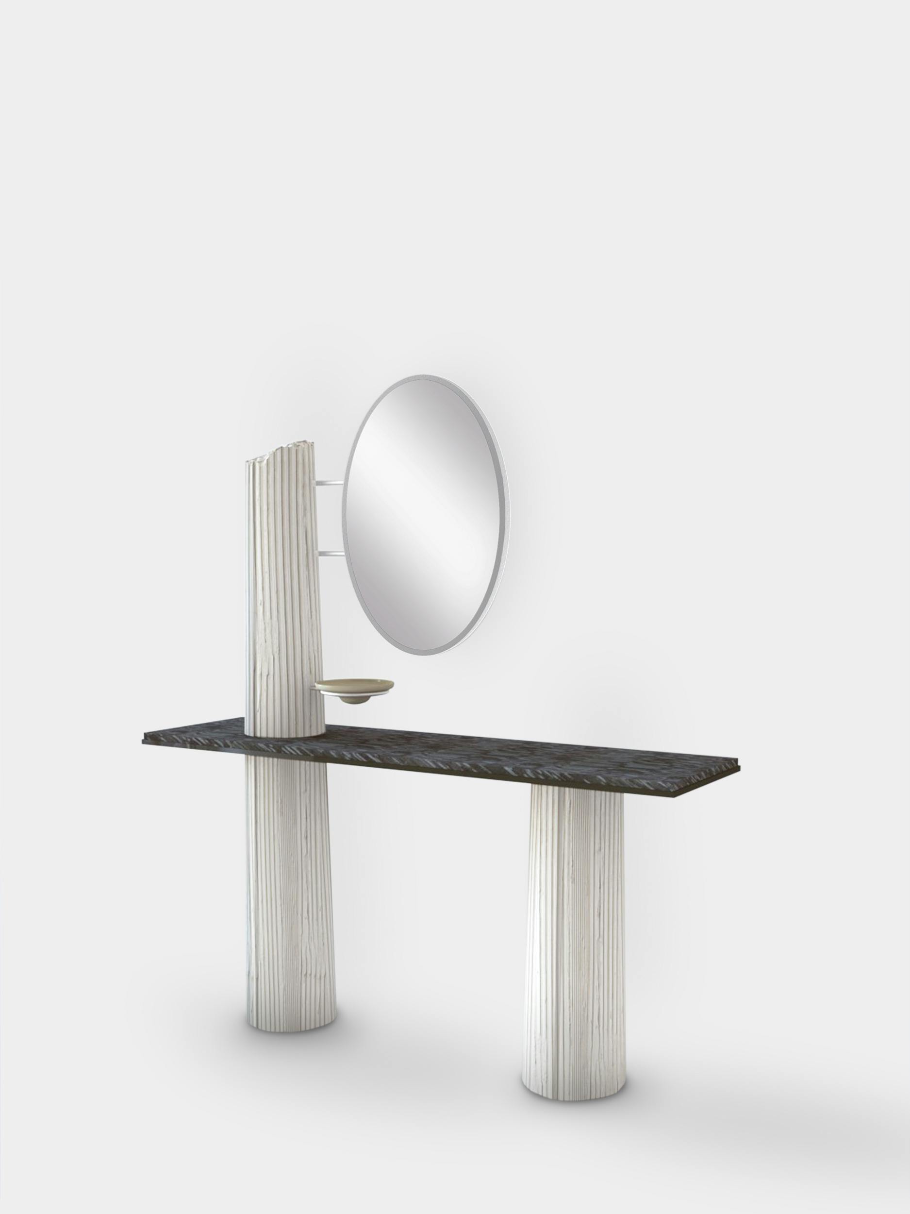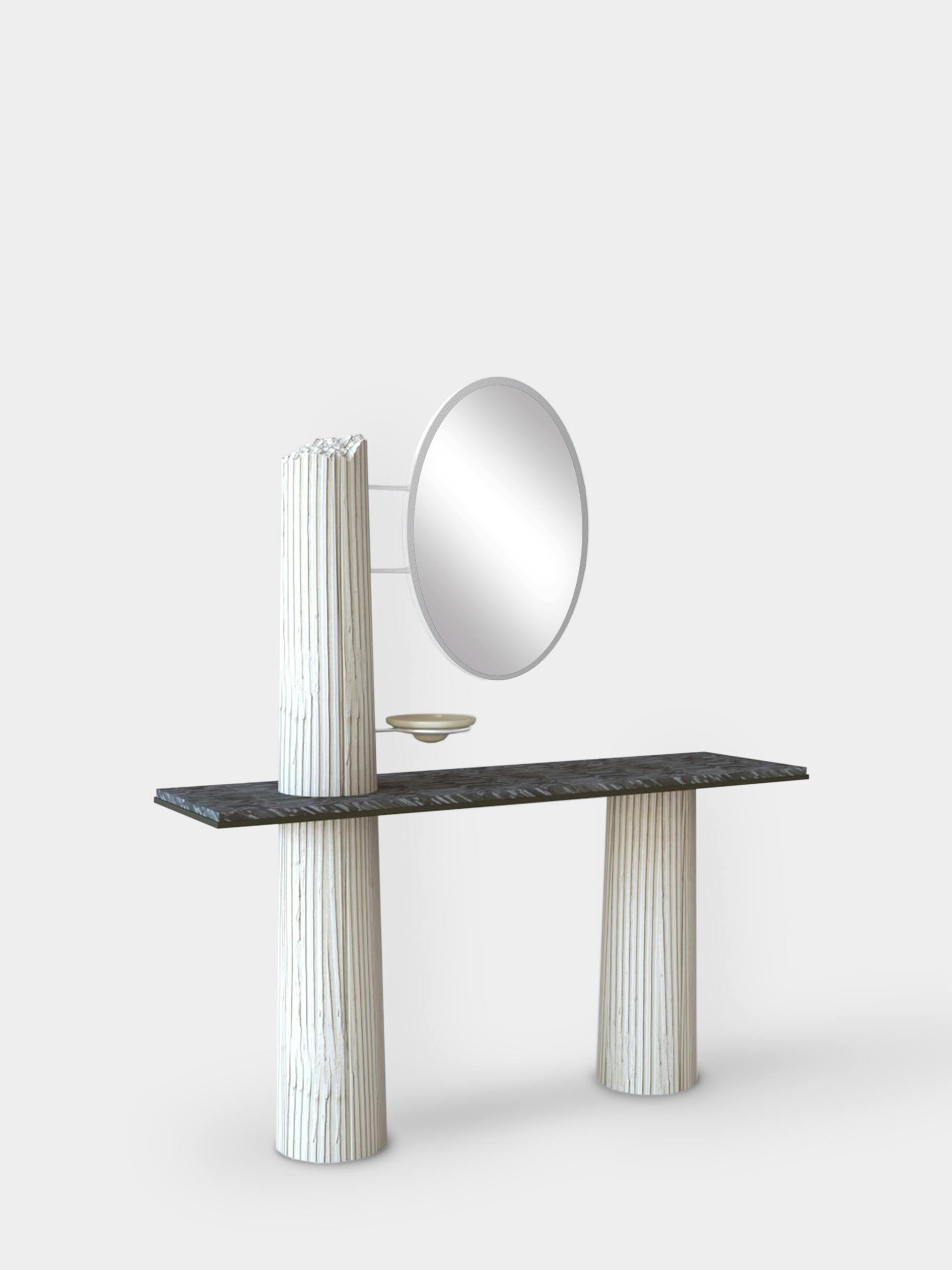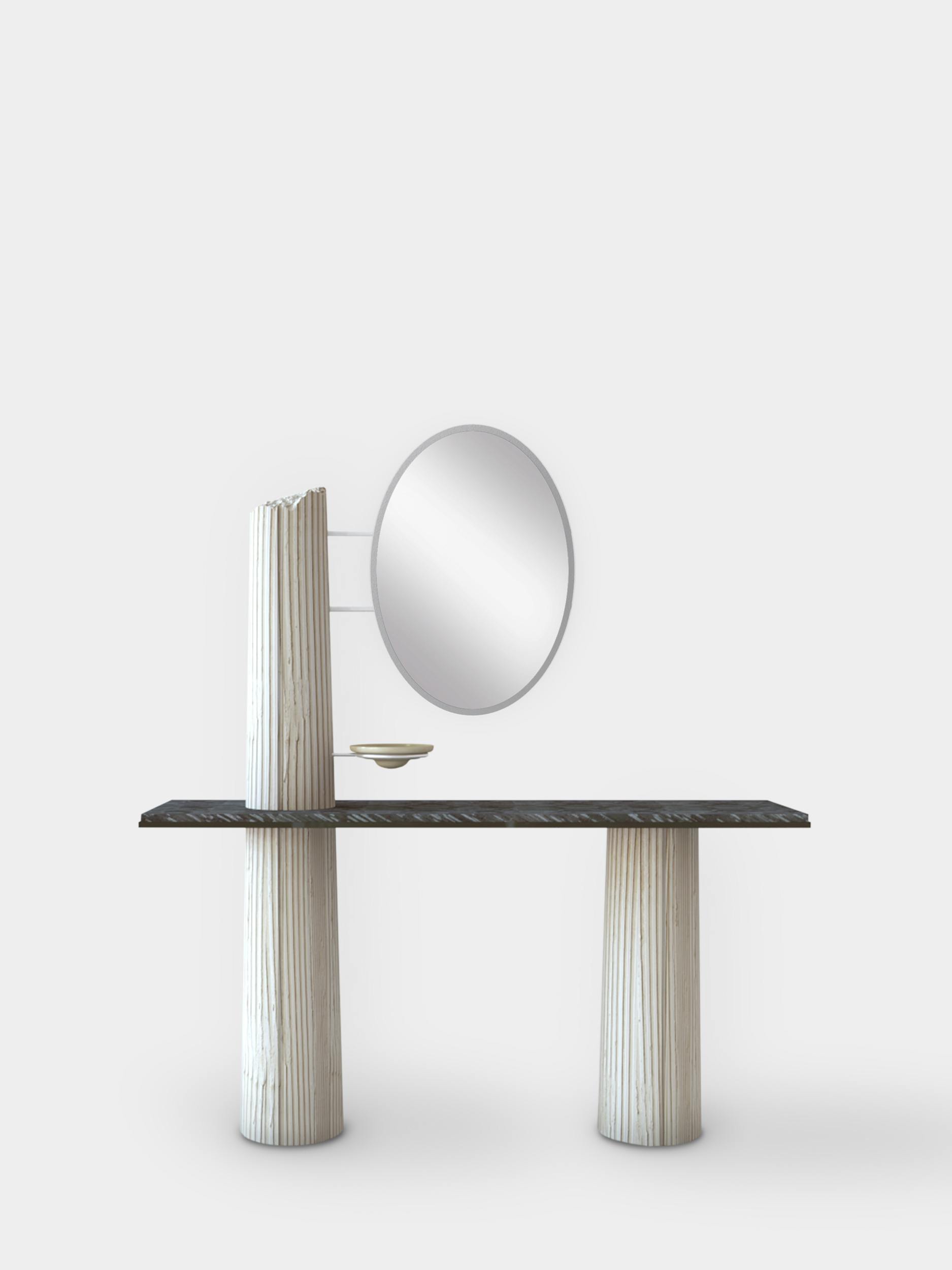 The Passage collection’s console table, as imagined by Rinck’s design experts, is an uncommon interpretation of the ravages of time as seen in a pair of antique-inspired columns that are made to appear aged and worn. With its two-tone tabletop in colored lacquers, this piece serves a dual purpose, functioning as both furniture for everyday use, such as in an entrance or a bedroom, and a work of art in its own right.