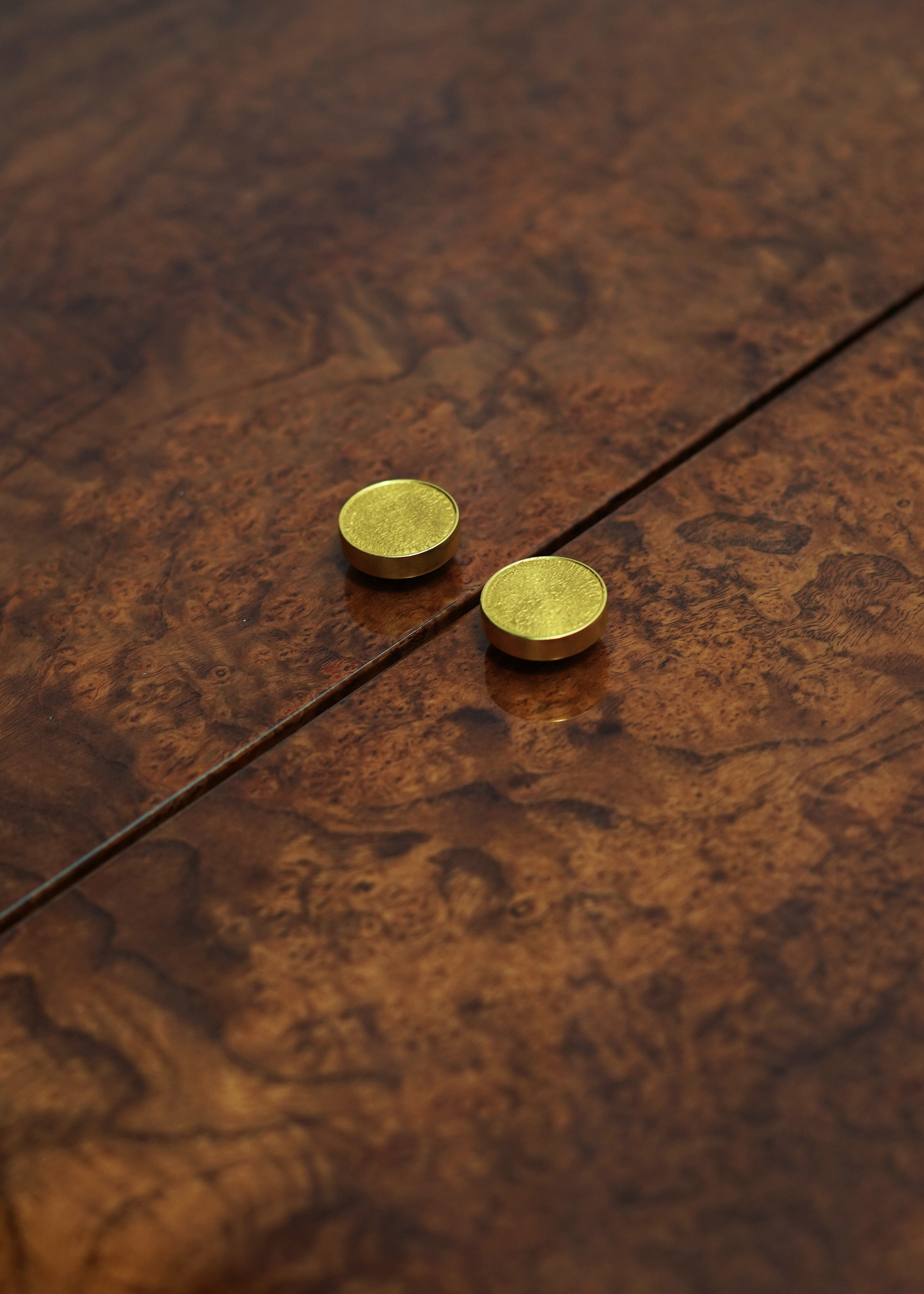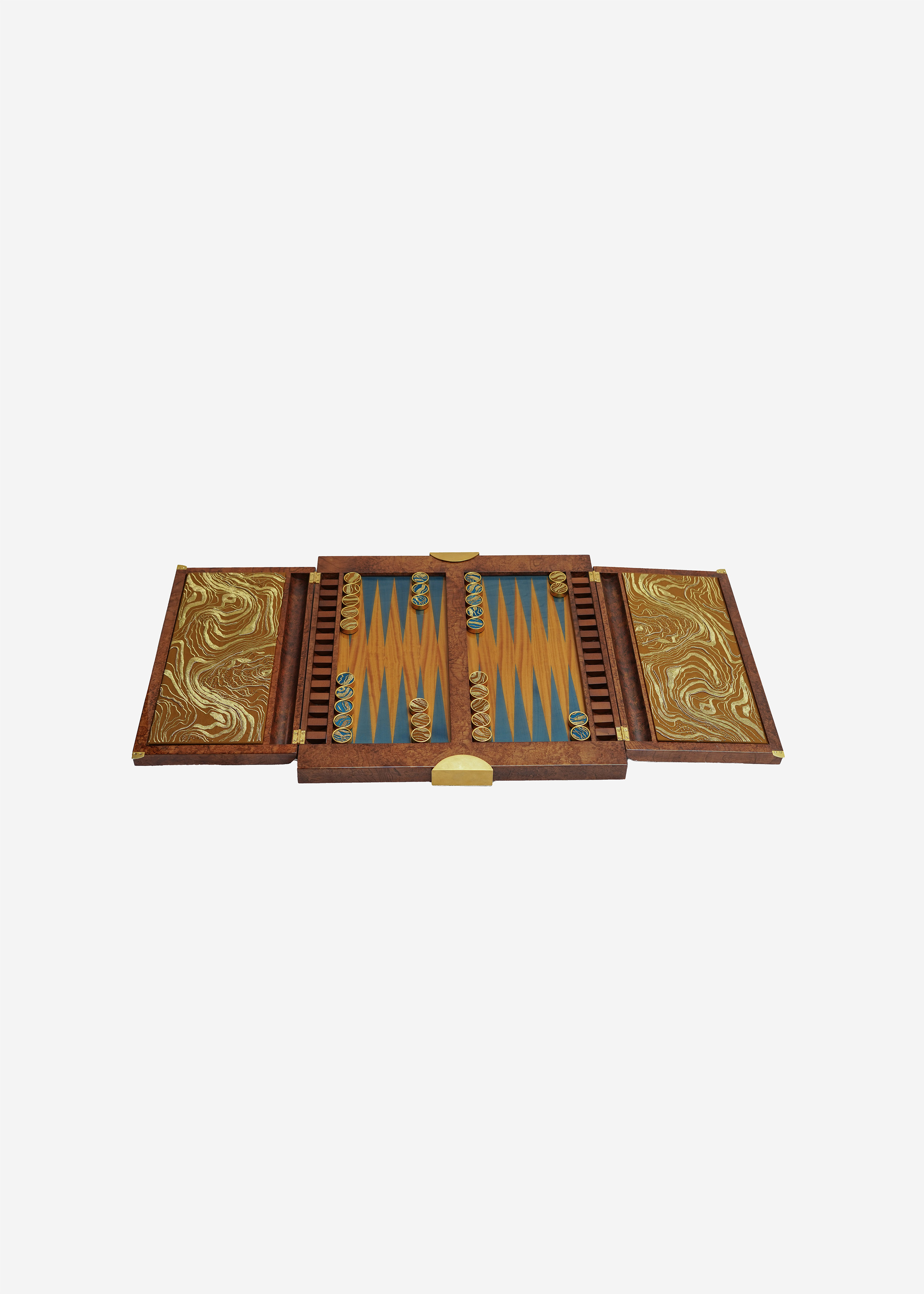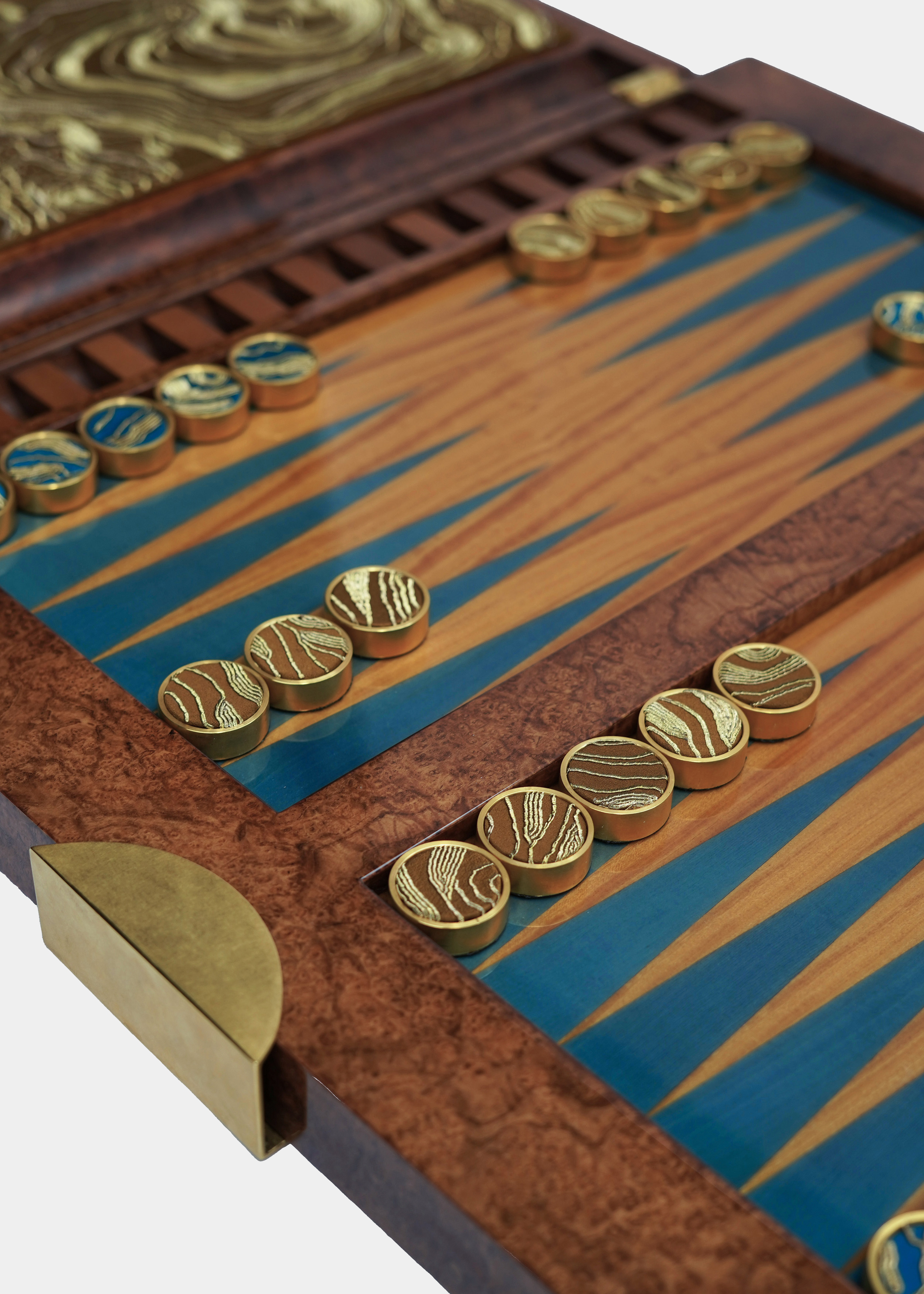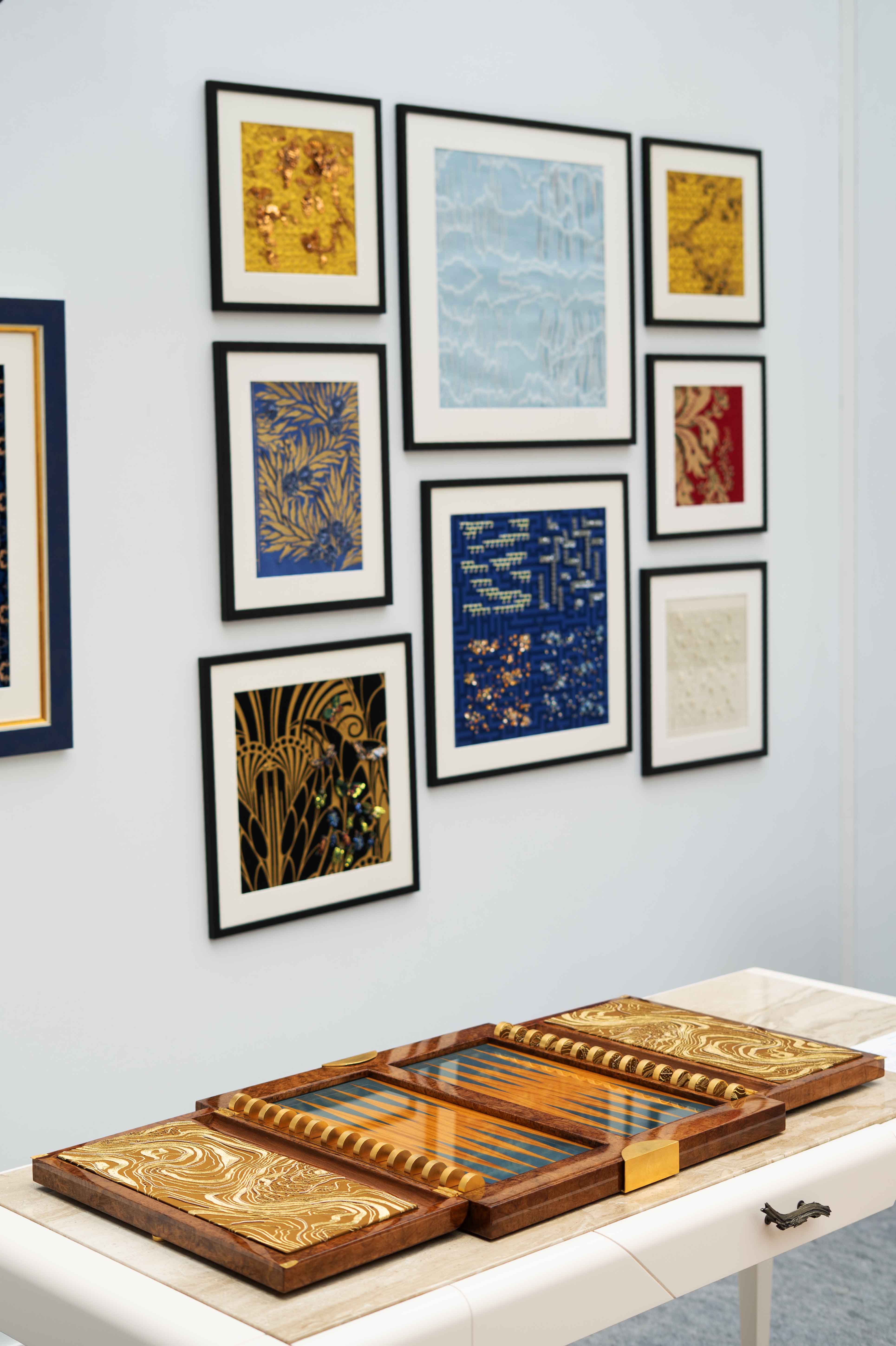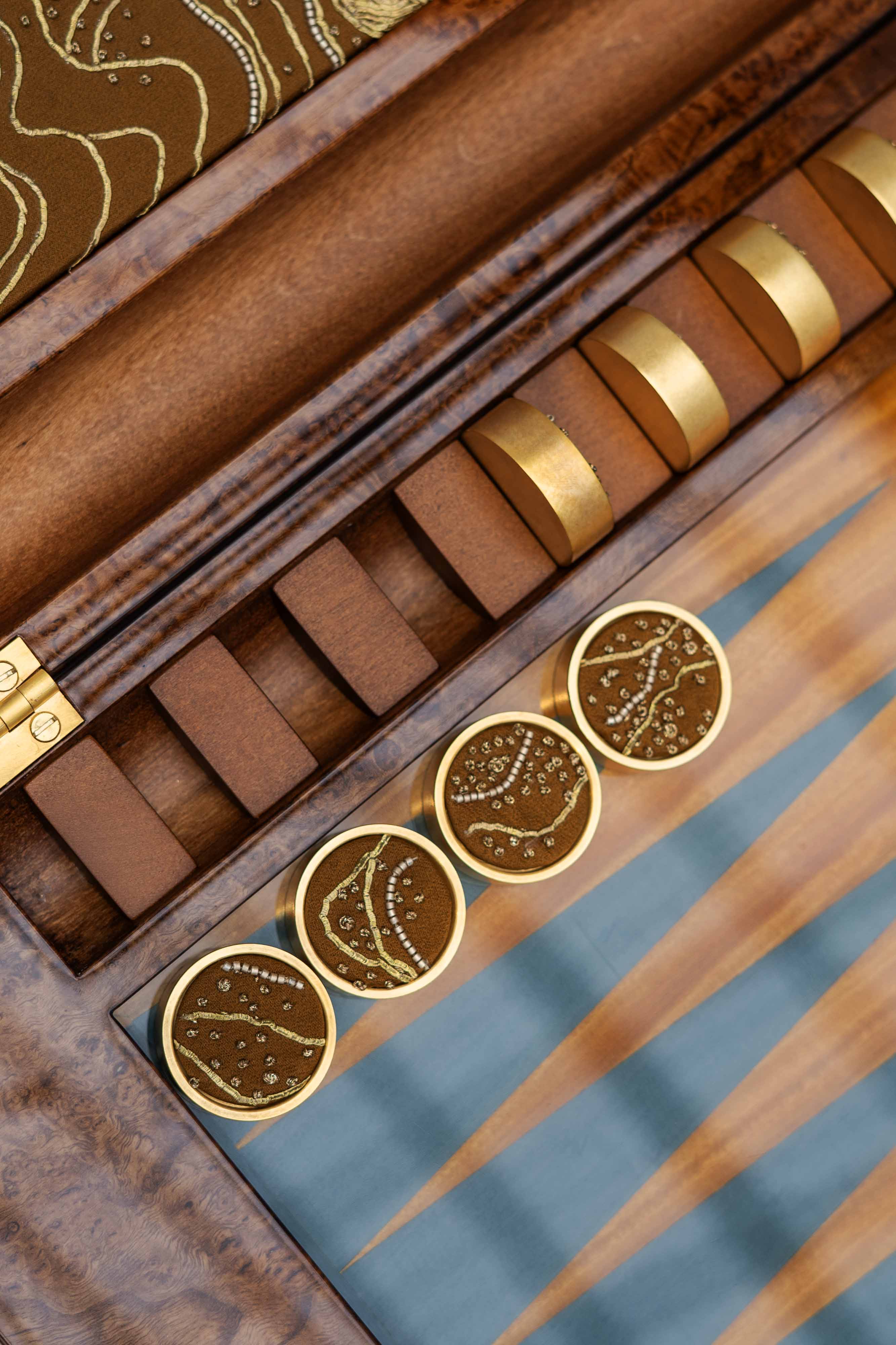 The backgammon set designed by Rinck opens like a precious case: Madrona burl, geometric marquetry in lemonwood and blue-stained sycamore, bronze buttons, and gold needle embroidery inspired by the wood’s natural veins. Each token is a unique miniature, blending technical precision with the poetry of craftsmanship.