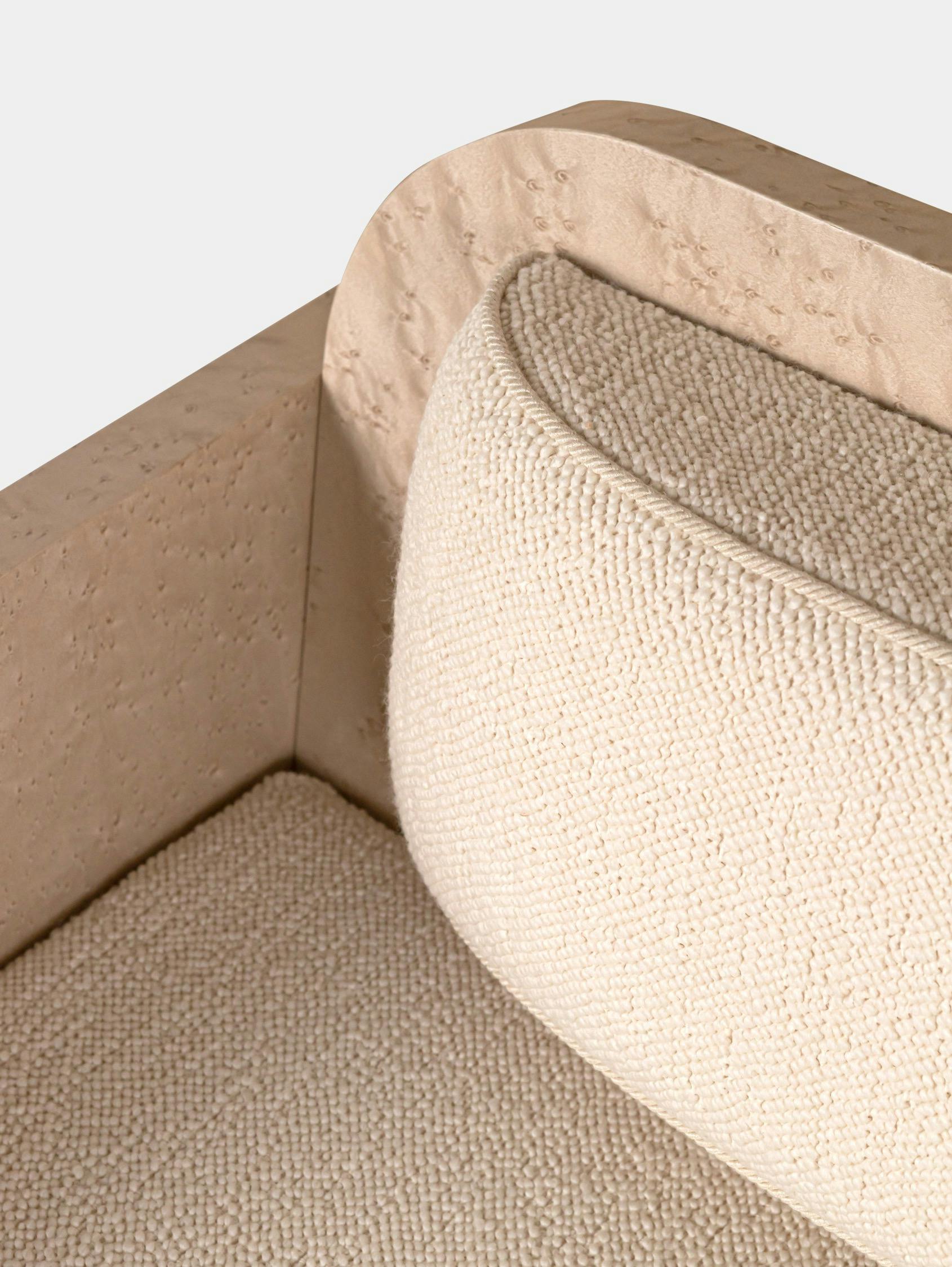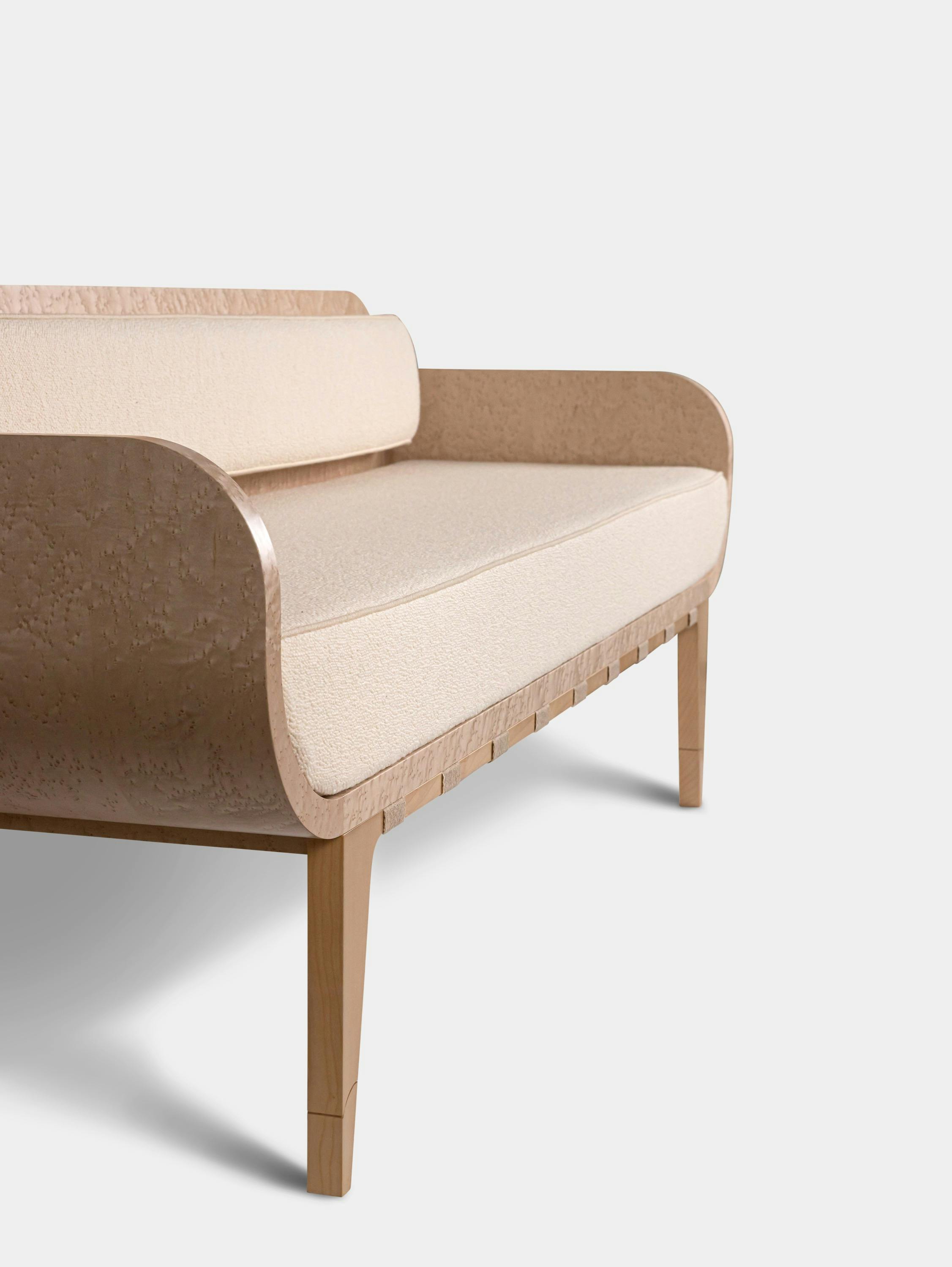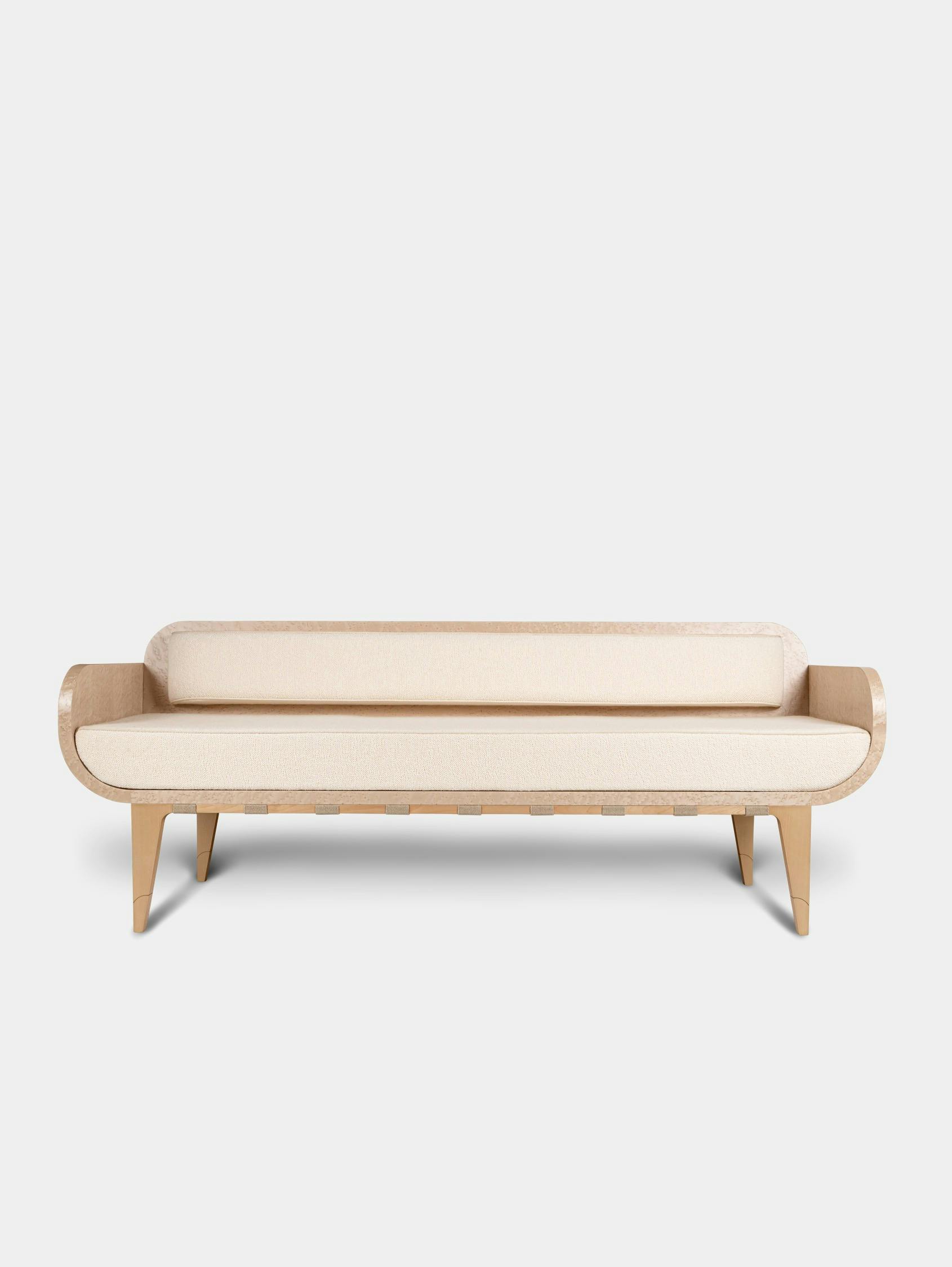 The bench from the Passage collection is the quintessence of lightness, with lines of minimalist inspiration and delicate finishes. The combination of solid maple and bird’s eye maple veneers is rendered subtler still by the textile from the Rinck collection designed for Thévenon. This elegant piece is perfect for gracing a mudroom, entrance, or foyer, fitting neatly into small spaces and working equally well alone or in pairs.