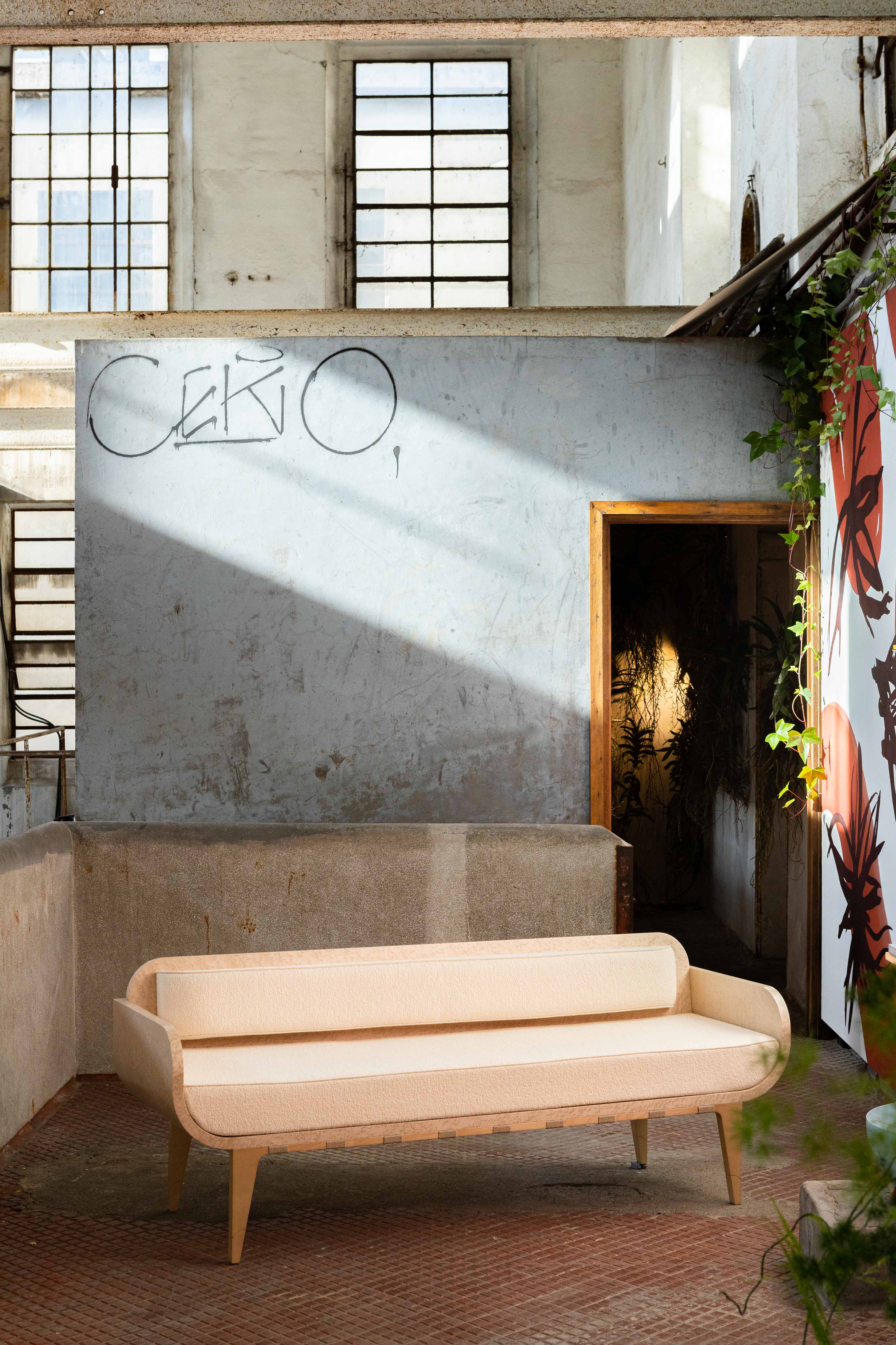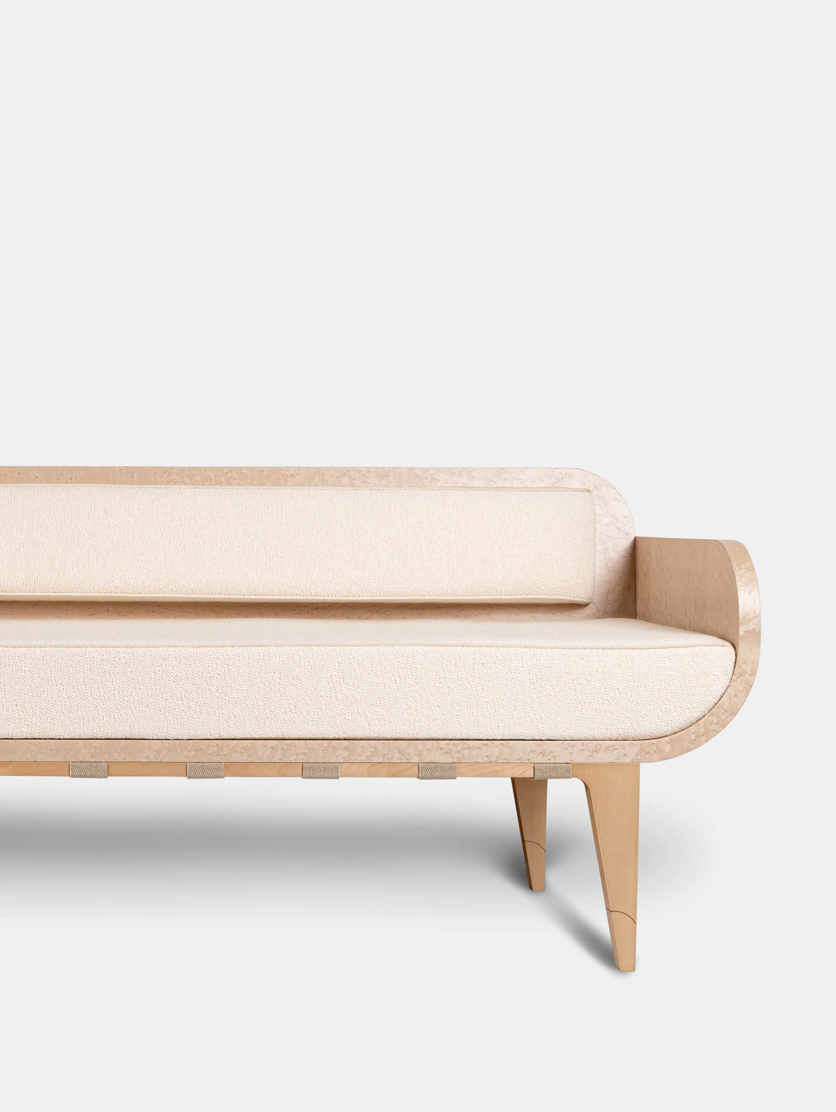 The bench from the Passage collection is the quintessence of lightness, with lines of minimalist inspiration and delicate finishes. The combination of solid maple and bird’s eye maple veneers is rendered subtler still by the textile from the Rinck collection designed for Thévenon. This elegant piece is perfect for gracing a mudroom, entrance, or foyer, fitting neatly into small spaces and working equally well alone or in pairs.