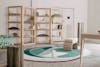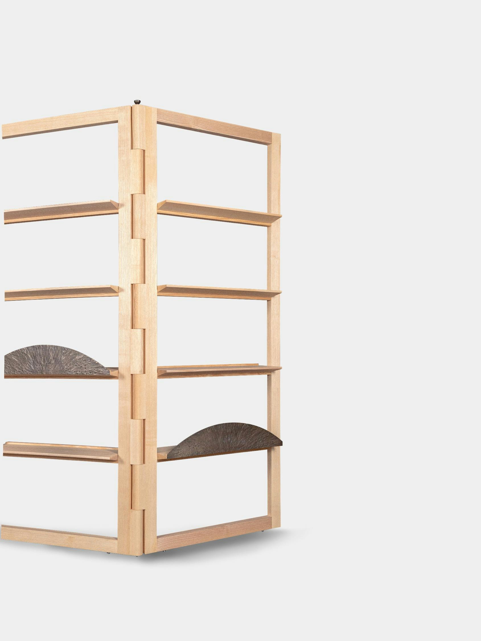 The Amarante bookcase was designed to be fully modular : the number of articulated shelf sections and the placement of the bronze book supports can be tailored to your preferences and space, so that everyone can compose its own ideal bookcase. To this end, Rinck designed and developed a special hinge system. Other than a light oiling, the solid wood is untreated, a sign of Rinck’s profound respect for raw materials. The bronze is hammered and sculpted by hand by the craftspeople at the Rinck furniture workshop.