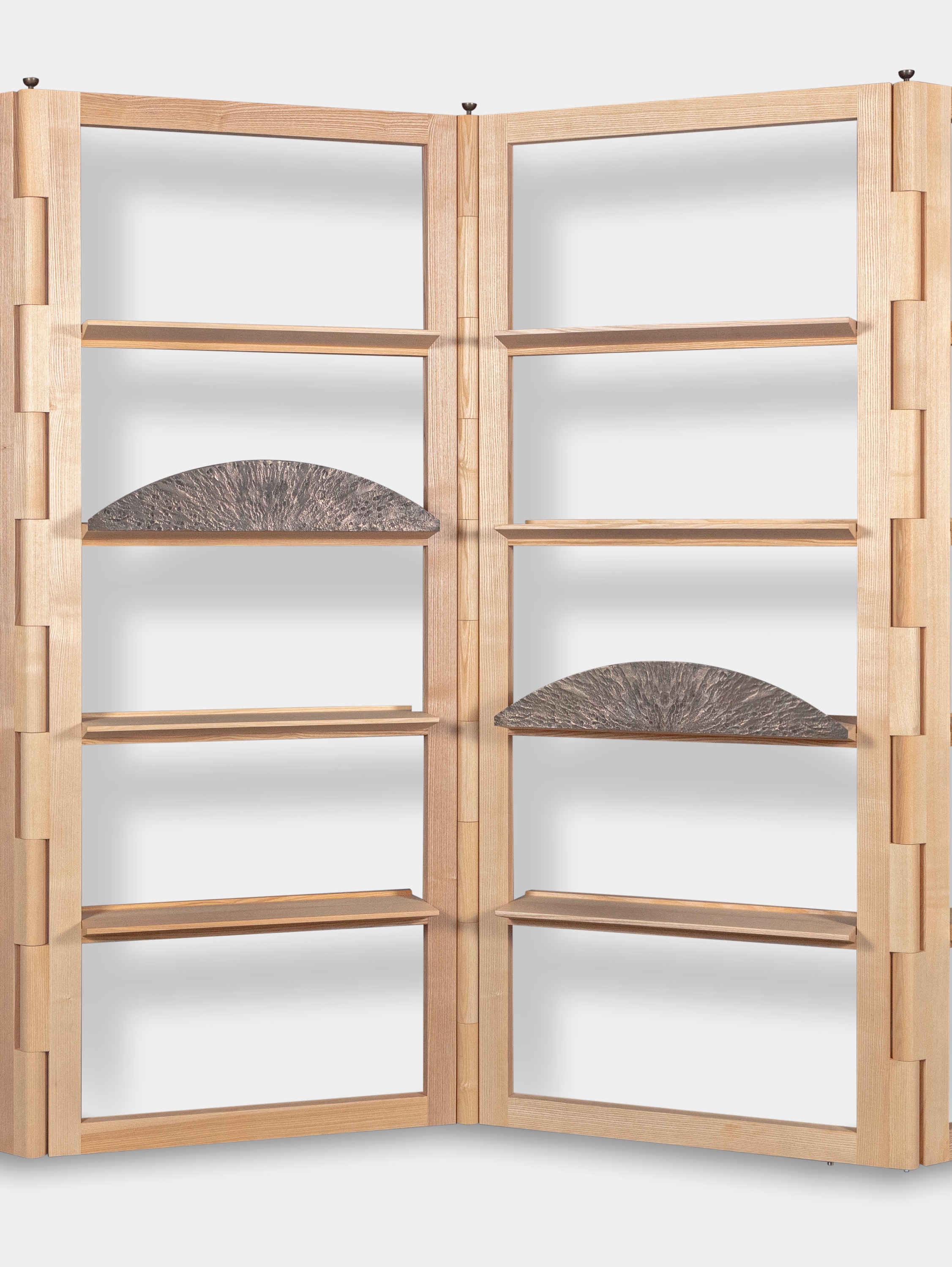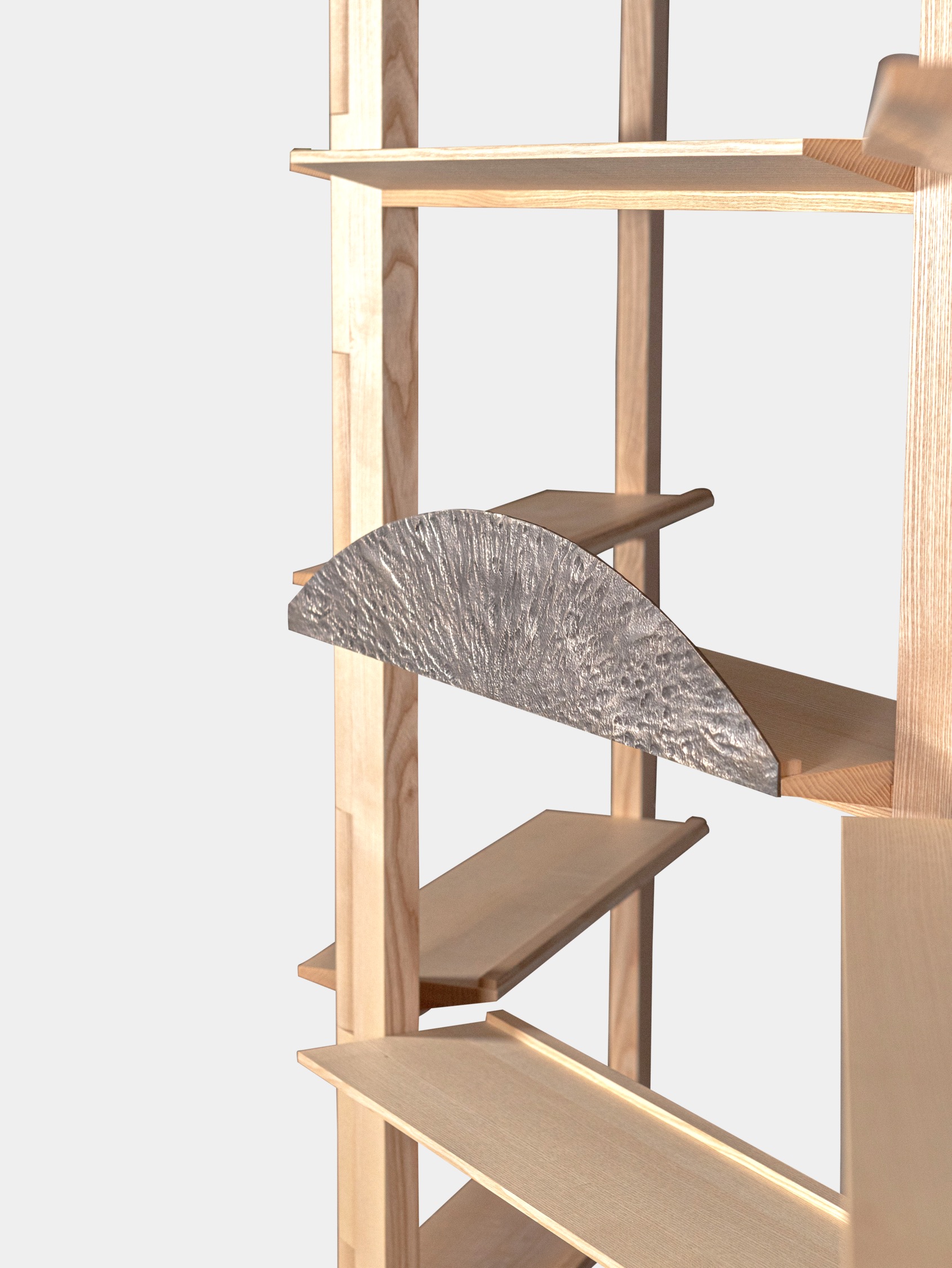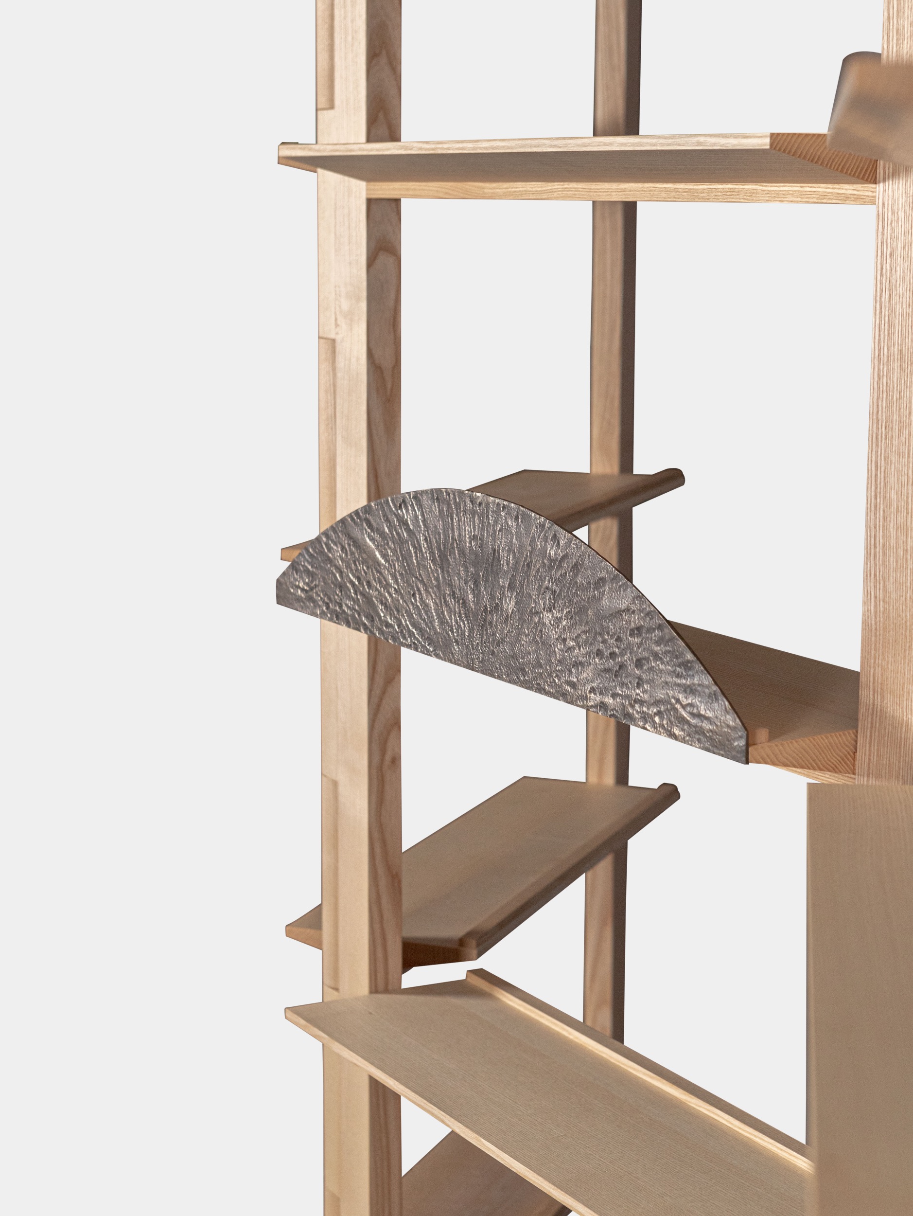 The Amarante bookcase was designed to be fully modular : the number of articulated shelf sections and the placement of the bronze book supports can be tailored to your preferences and space, so that everyone can compose its own ideal bookcase. To this end, Rinck designed and developed a special hinge system. Other than a light oiling, the solid wood is untreated, a sign of Rinck’s profound respect for raw materials. The bronze is hammered and sculpted by hand by the craftspeople at the Rinck furniture workshop.