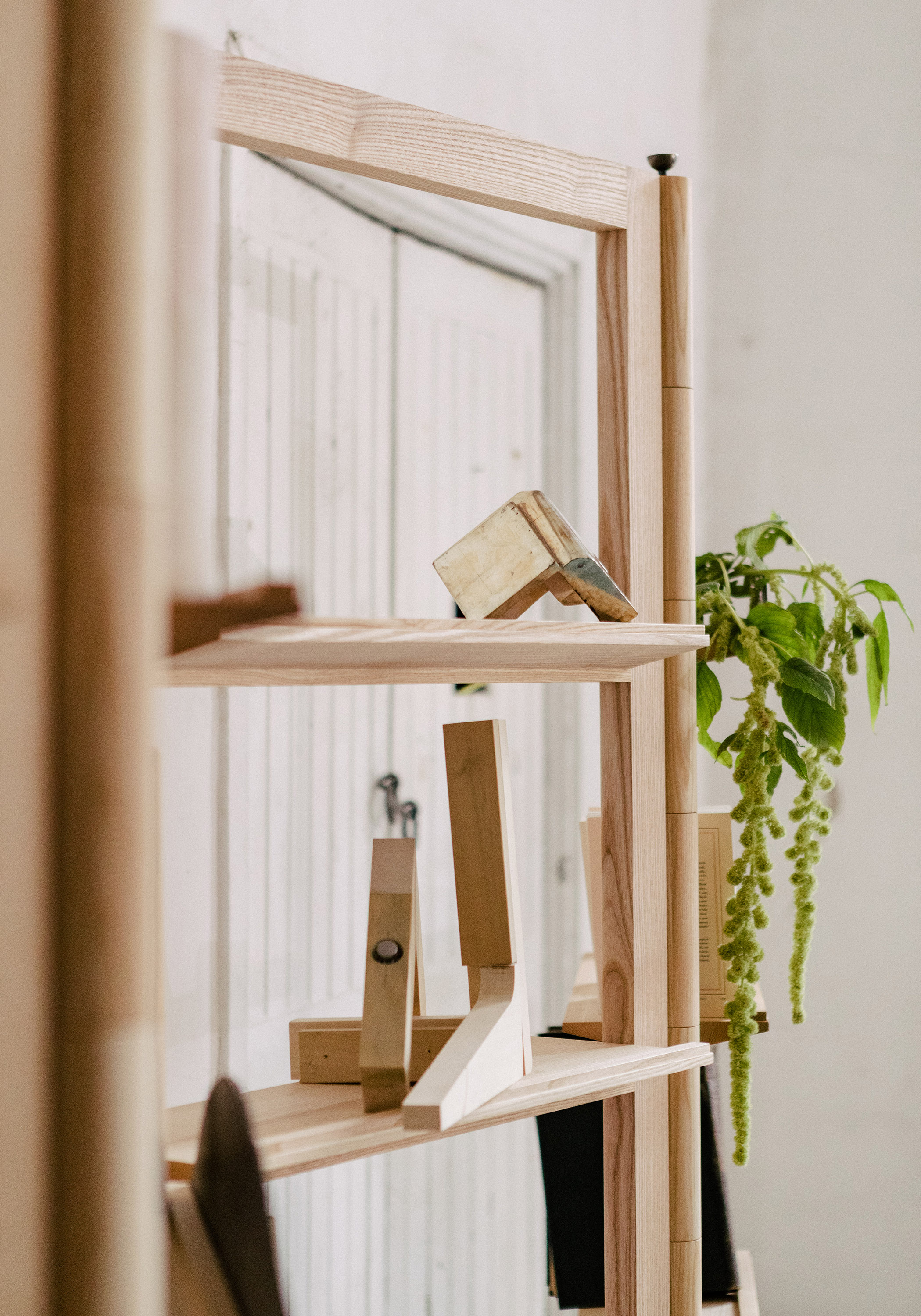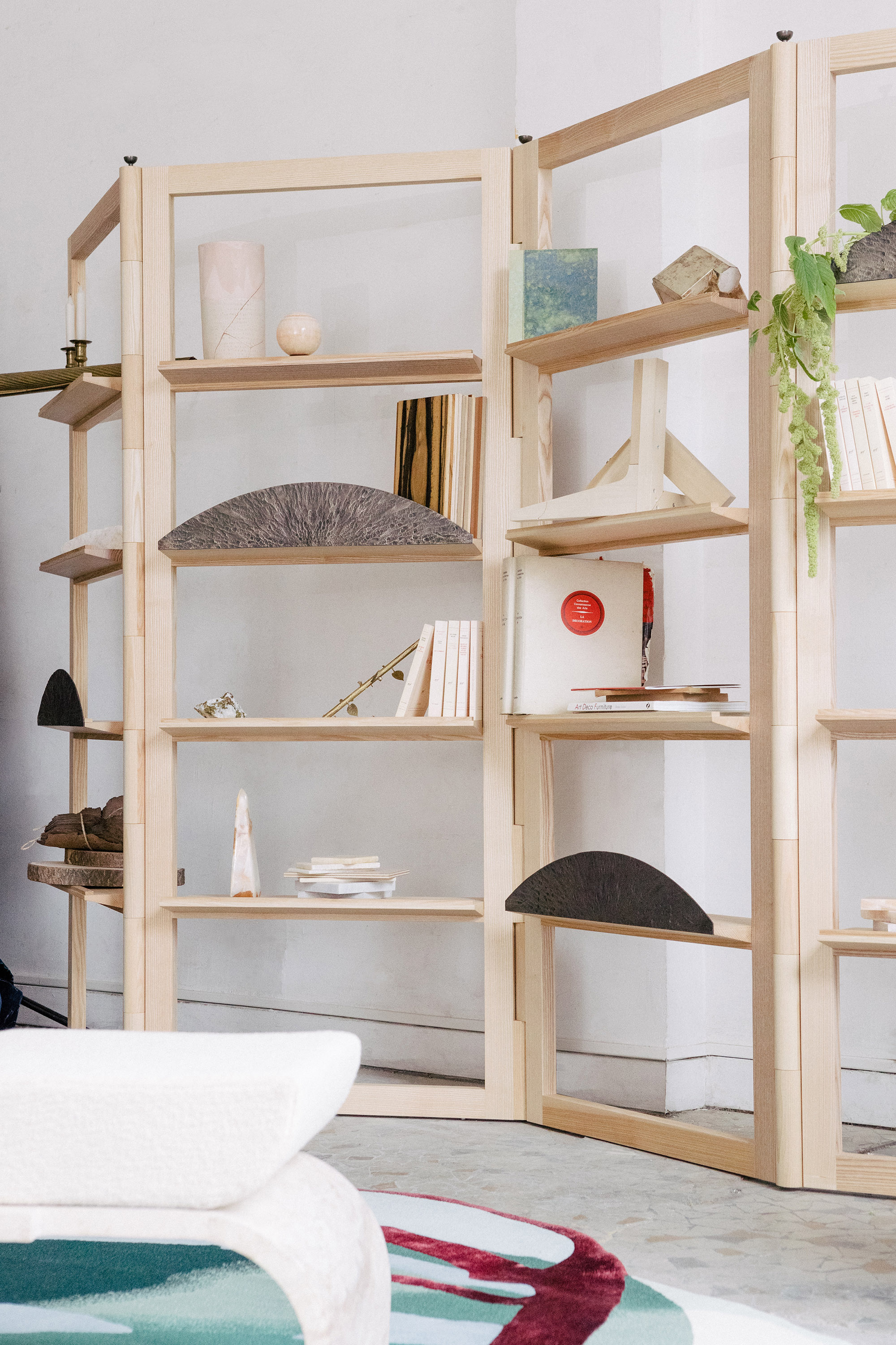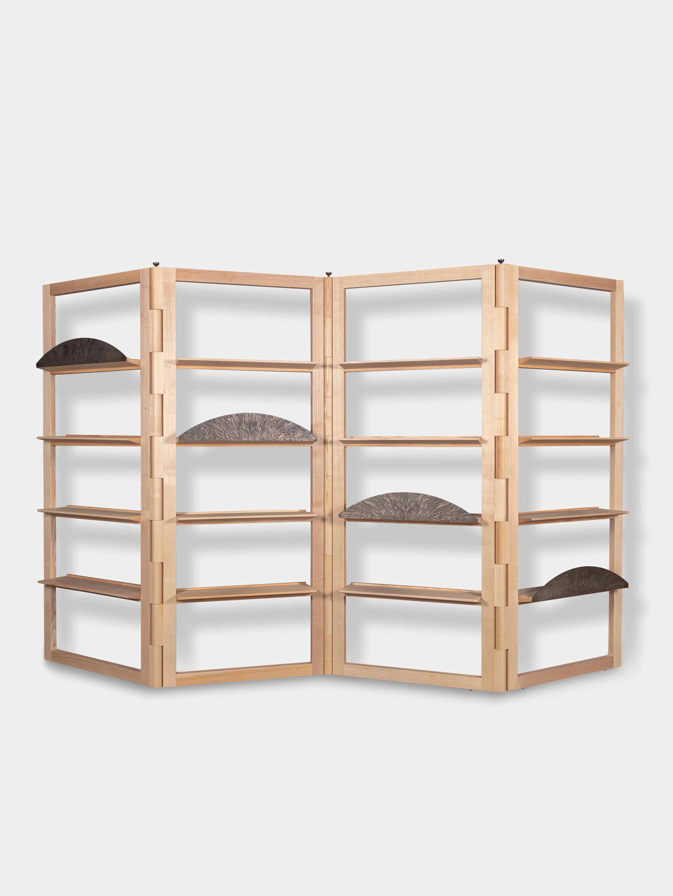 The Amarante bookcase was designed to be fully modular : the number of articulated shelf sections and the placement of the bronze book supports can be tailored to your preferences and space, so that everyone can compose its own ideal bookcase. To this end, Rinck designed and developed a special hinge system. Other than a light oiling, the solid wood is untreated, a sign of Rinck’s profound respect for raw materials. The bronze is hammered and sculpted by hand by the craftspeople at the Rinck furniture workshop.