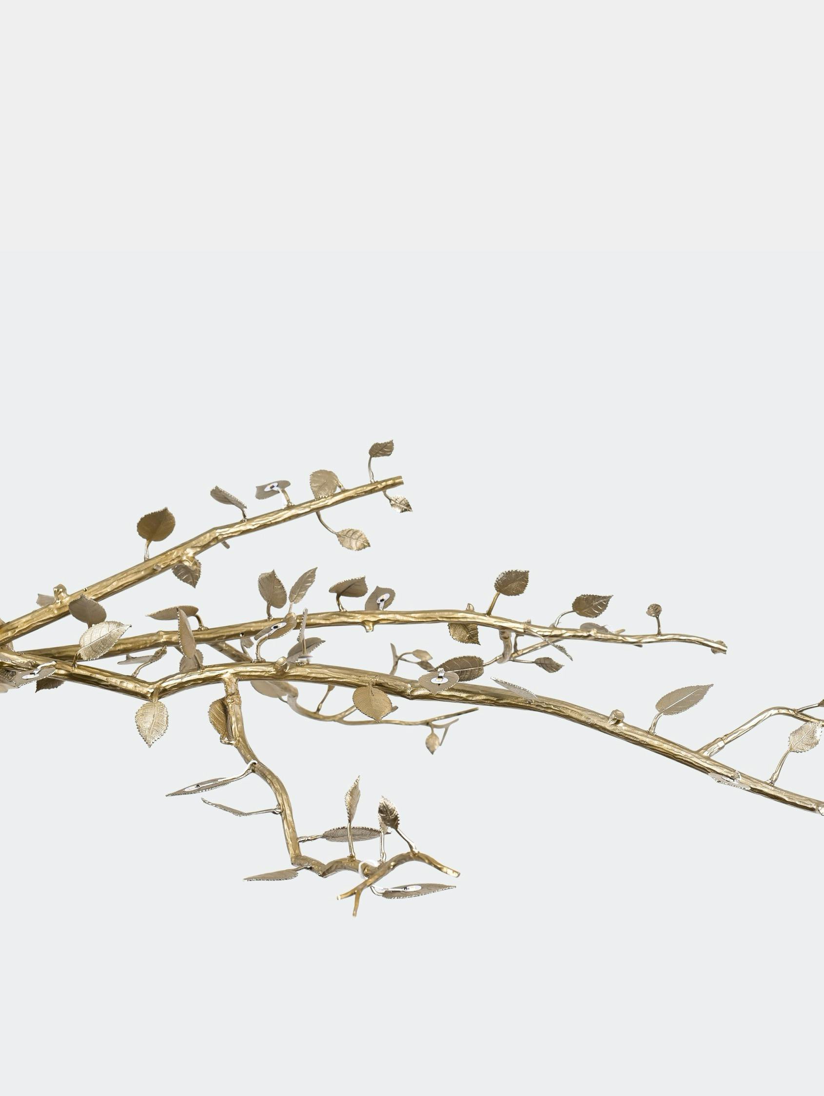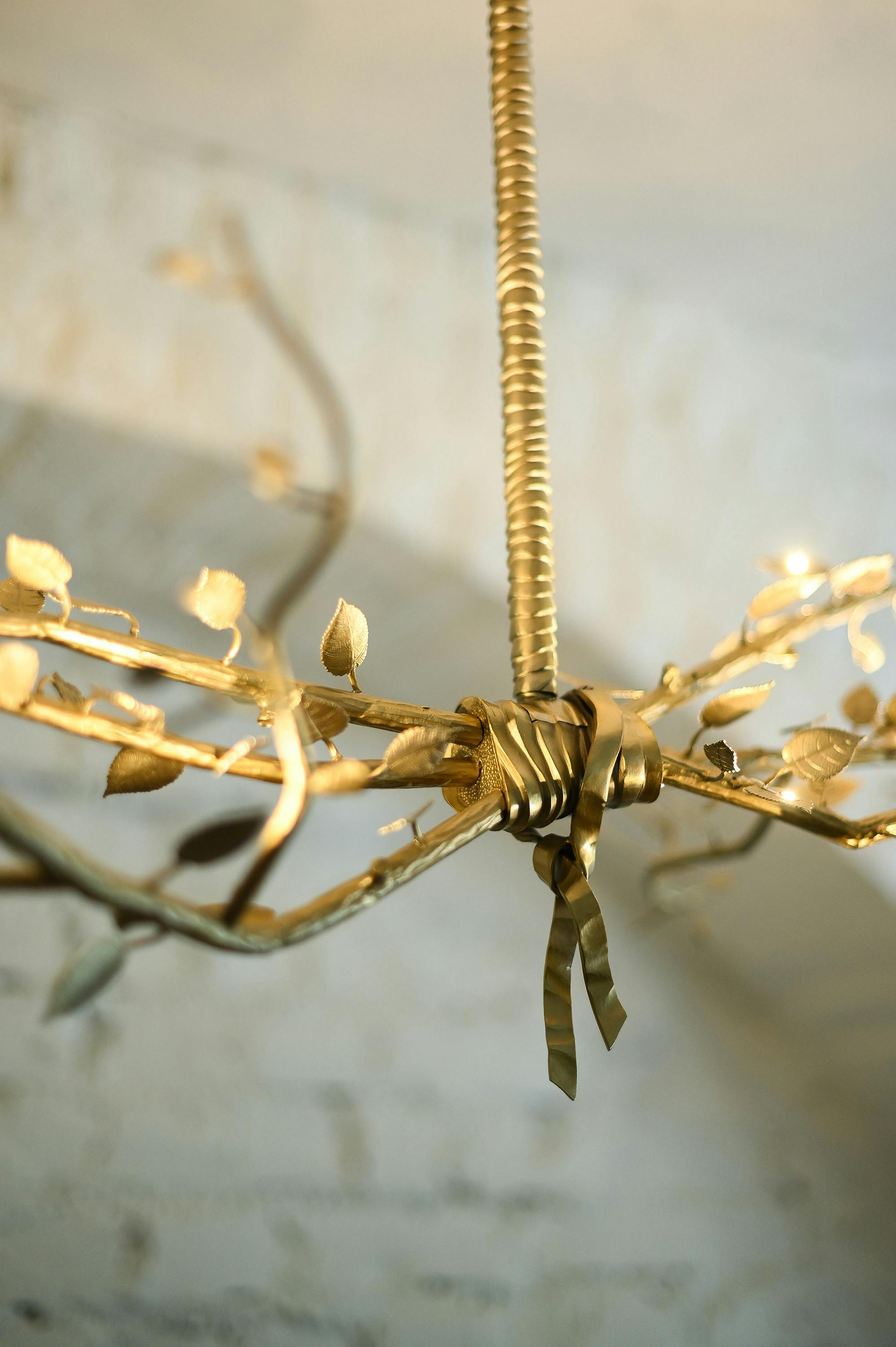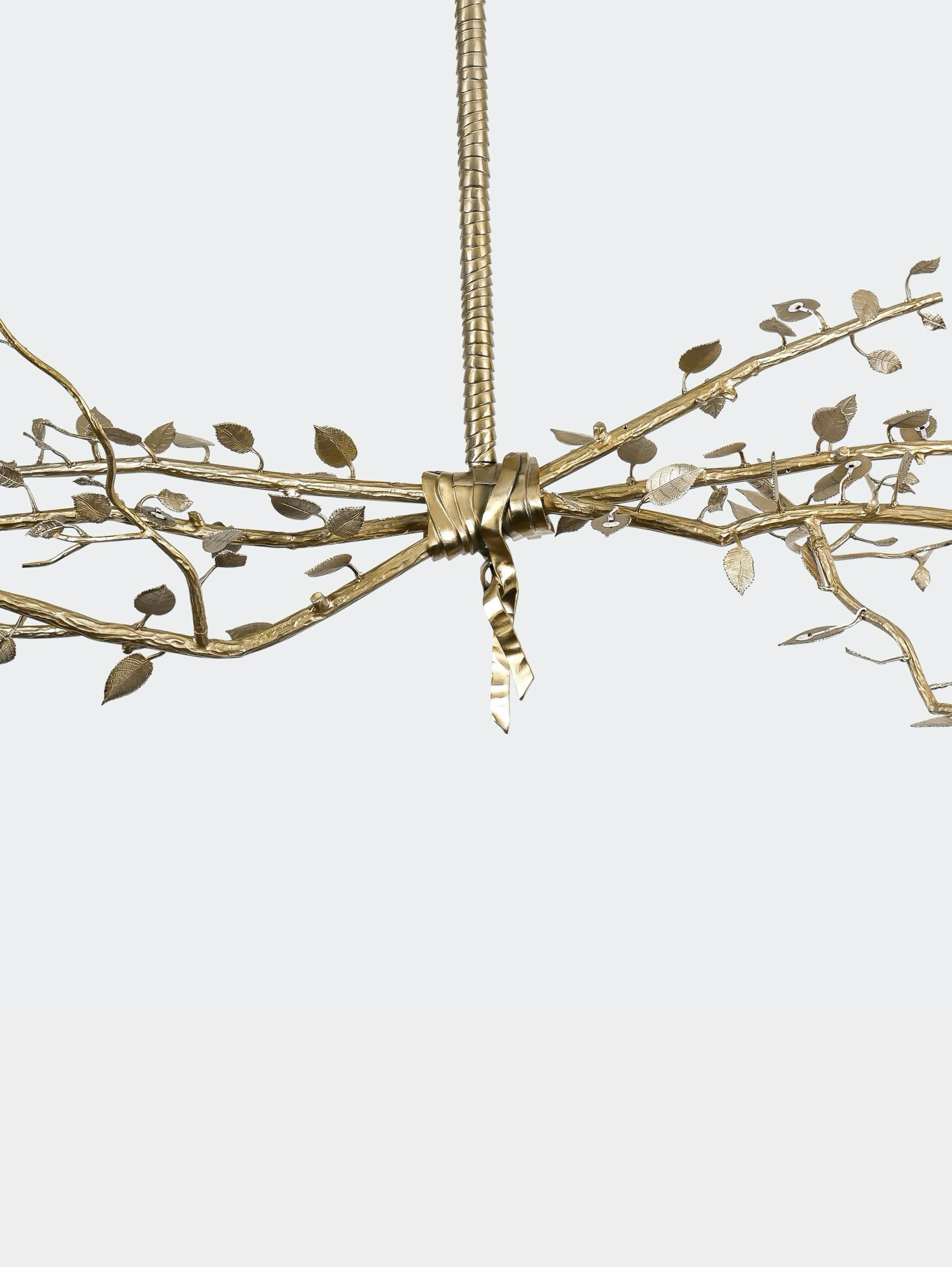Designed as a bundle of branches fastened by a simple ribbon, the Félicité collection’s chandelier features truly exceptional work in chiseled bronze, graced with dainty lights hidden behind each leaf. The result is purely sculptural, with no sign of electrical banality. A technical feat and a nod to the Louis XVI style, as well as to post-war French bronze work. This piece is handcrafted in the Rinck workshops in France.