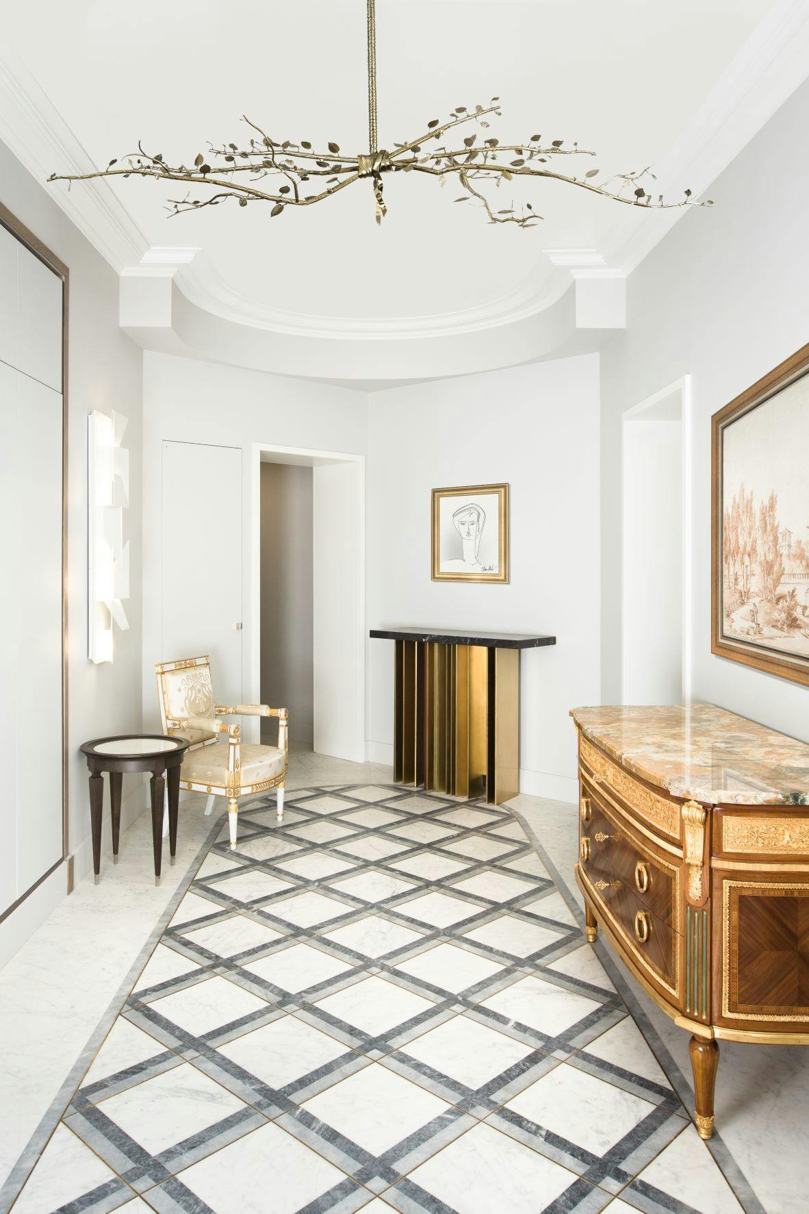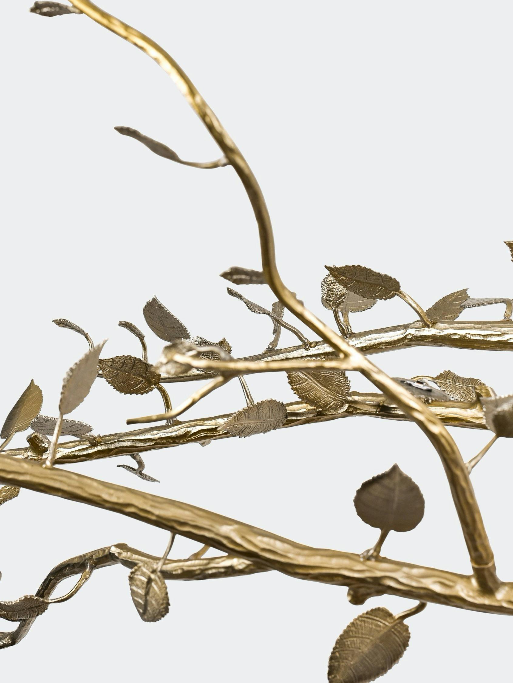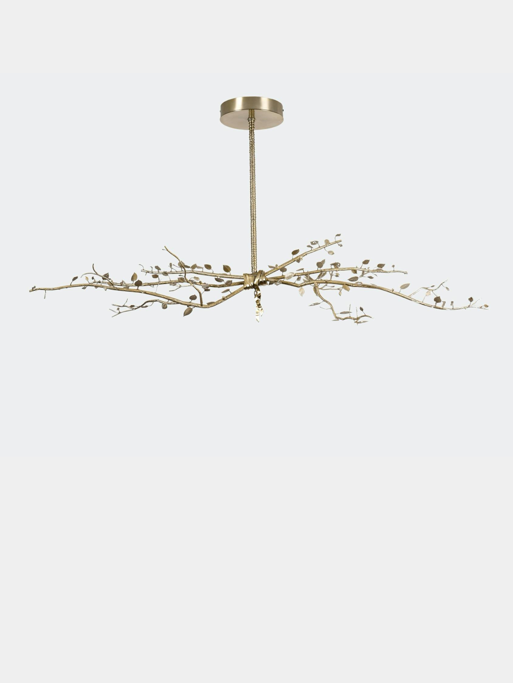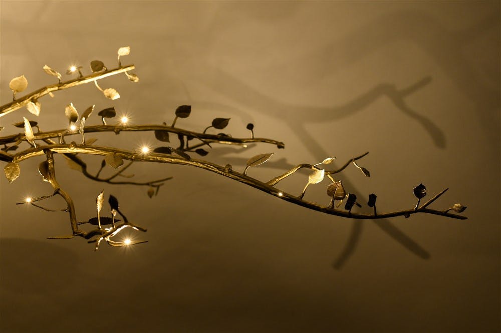 Designed as a bundle of branches fastened by a simple ribbon, the Félicité collection’s chandelier features truly exceptional work in chiseled bronze, graced with dainty lights hidden behind each leaf. The result is purely sculptural, with no sign of electrical banality. A technical feat and a nod to the Louis XVI style, as well as to post-war French bronze work. This piece is handcrafted in the Rinck workshops in France.