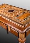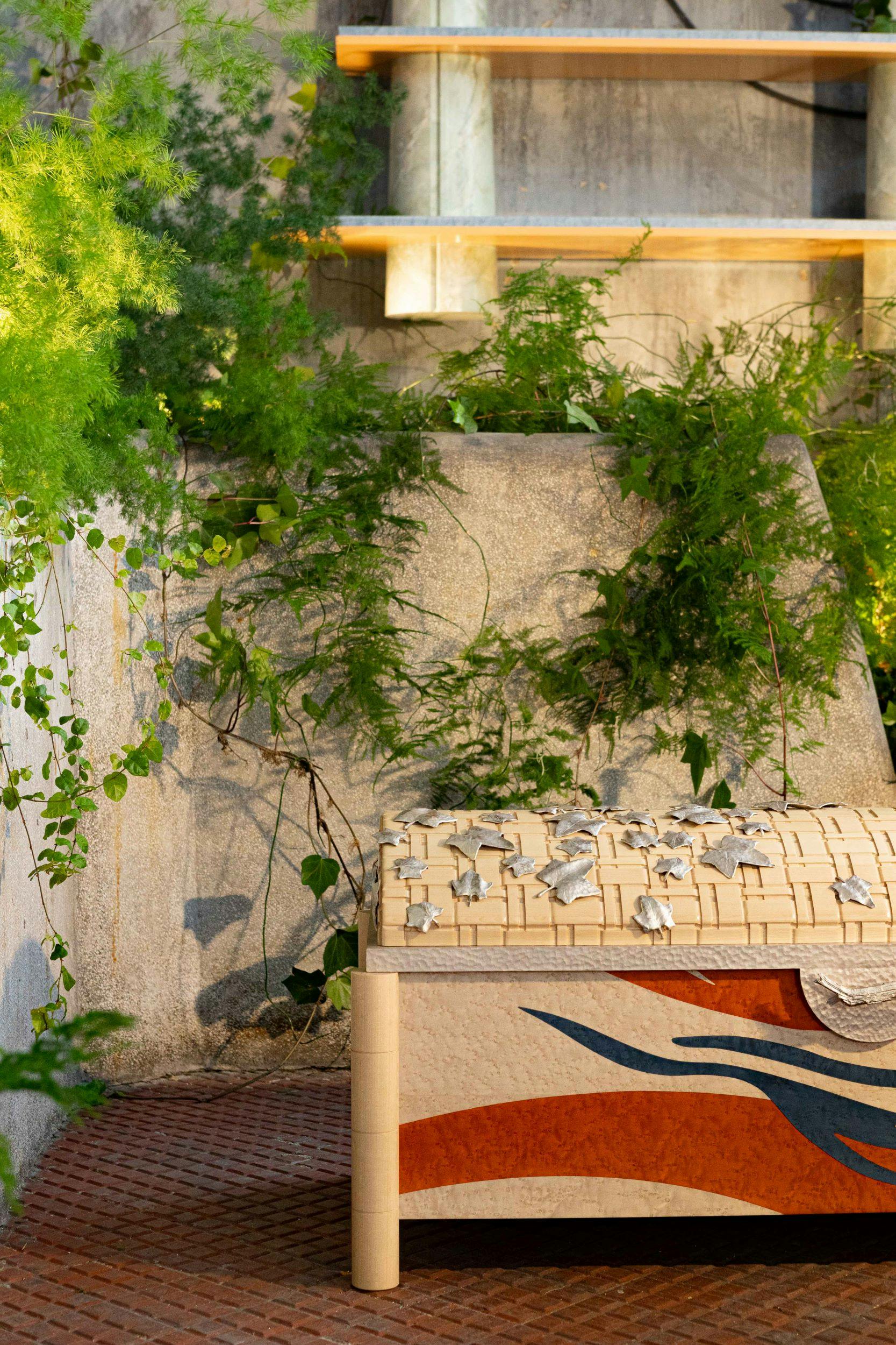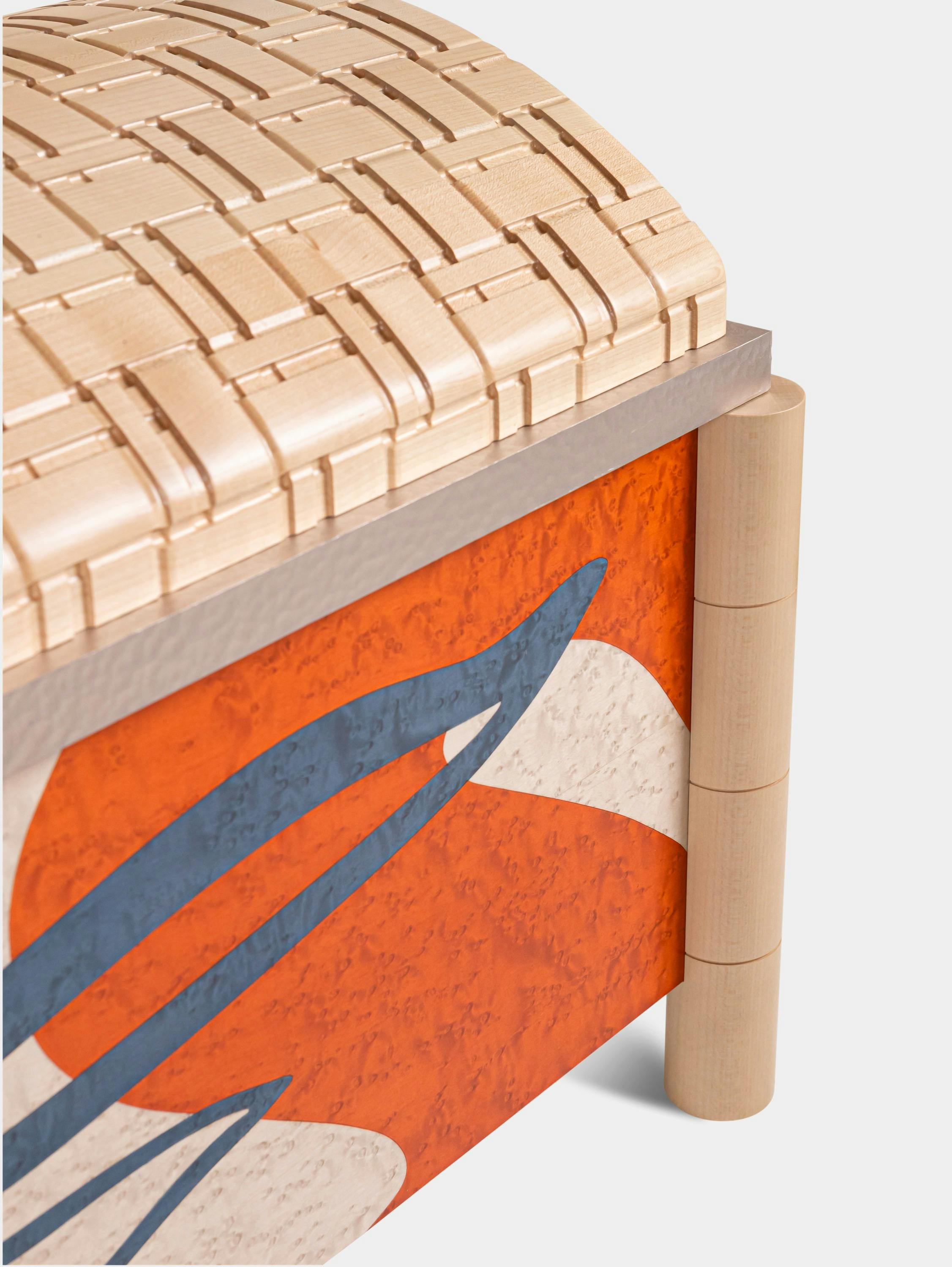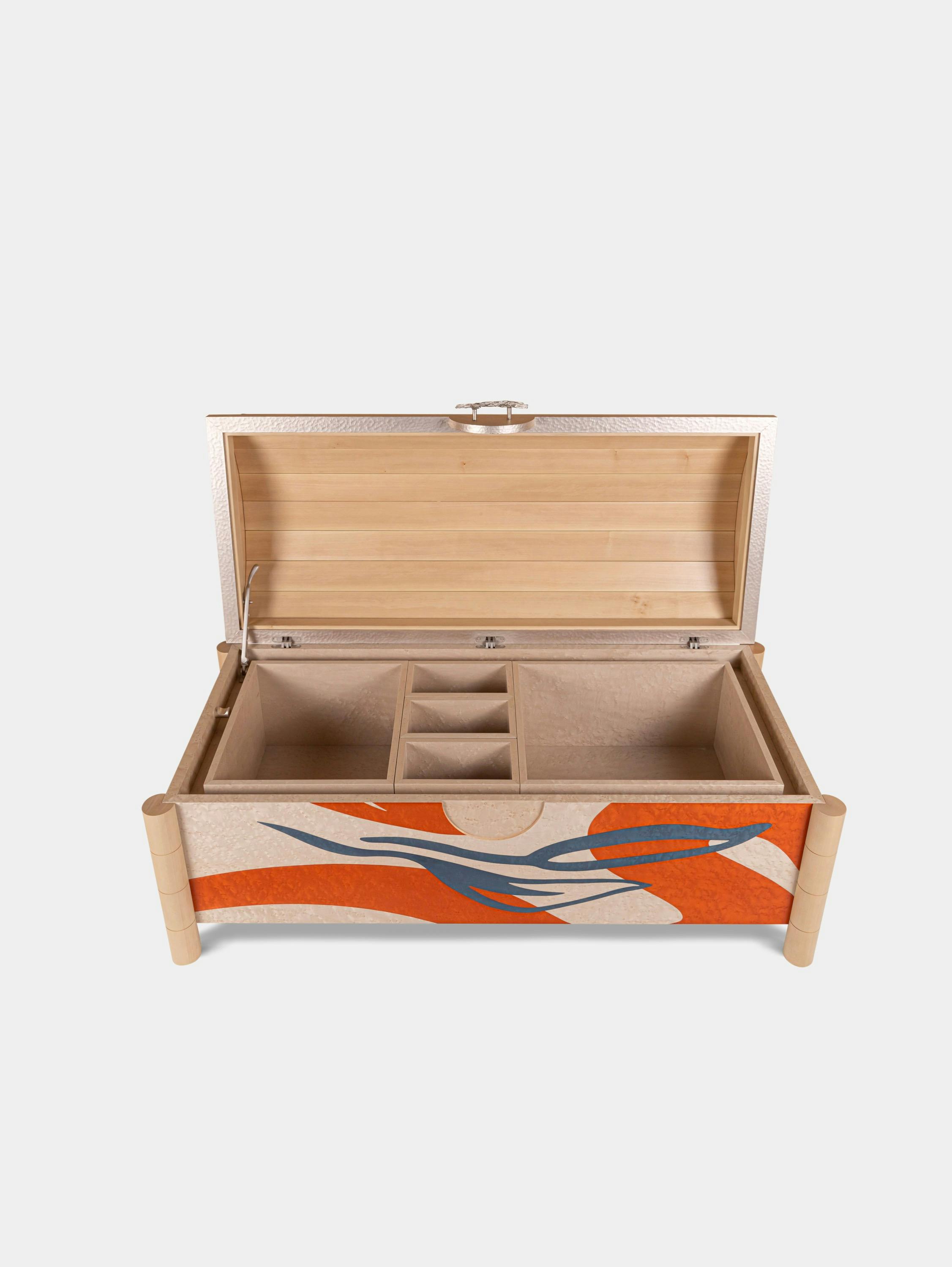 For the Passage collection, Rinck presents its version of the chest, a piece that embodies the very essence of Western cabinetmaking and from which stem all successive evolutions of period furniture. It is a modern, visually striking interpretation combining solid and bird’s eye maple, as well as bronze worked into the ivy-leaf trim and handle. The contemporary marquetry on the façade features abstract touches of color forming an intriguing design that fires the imagination.