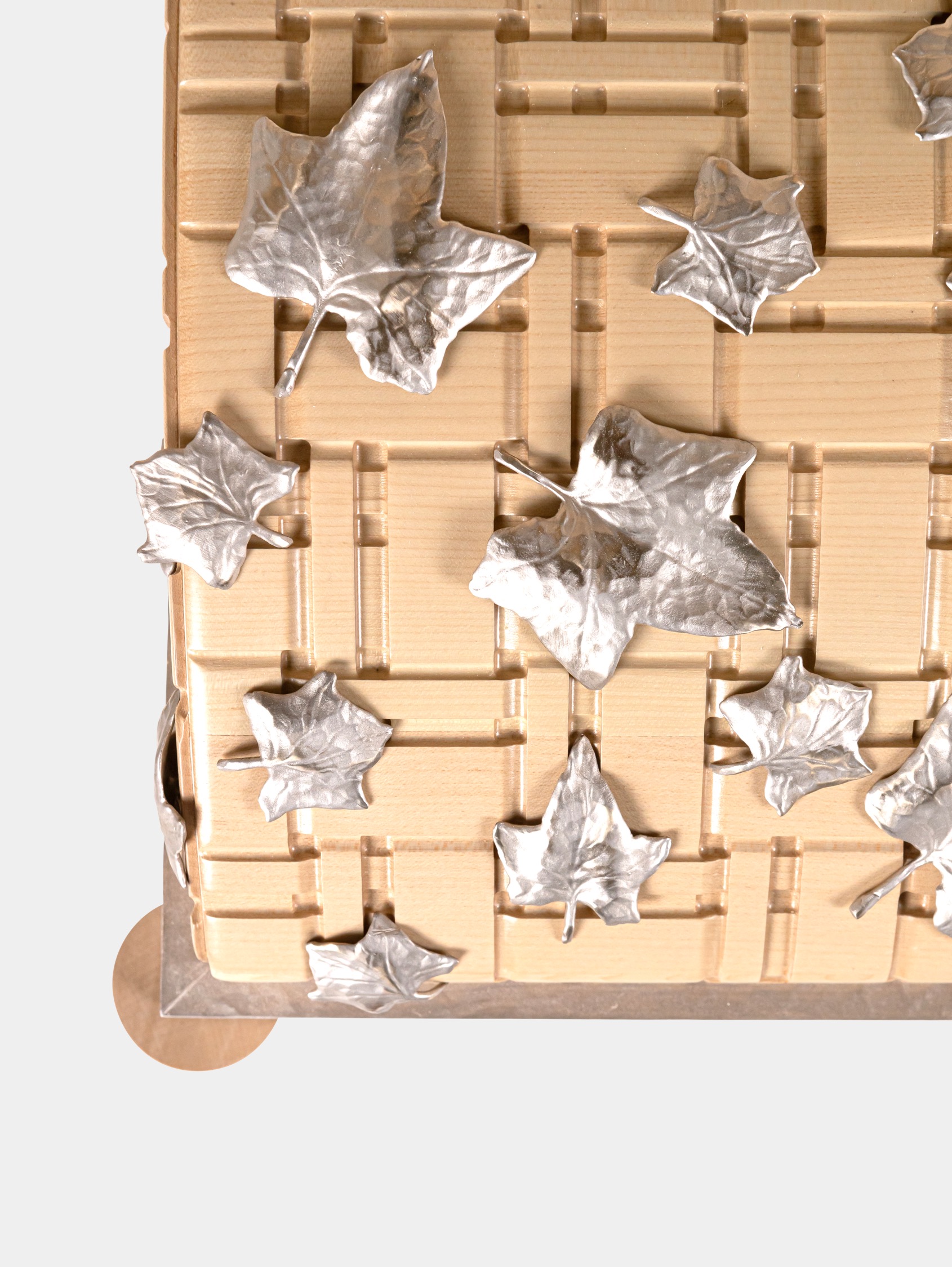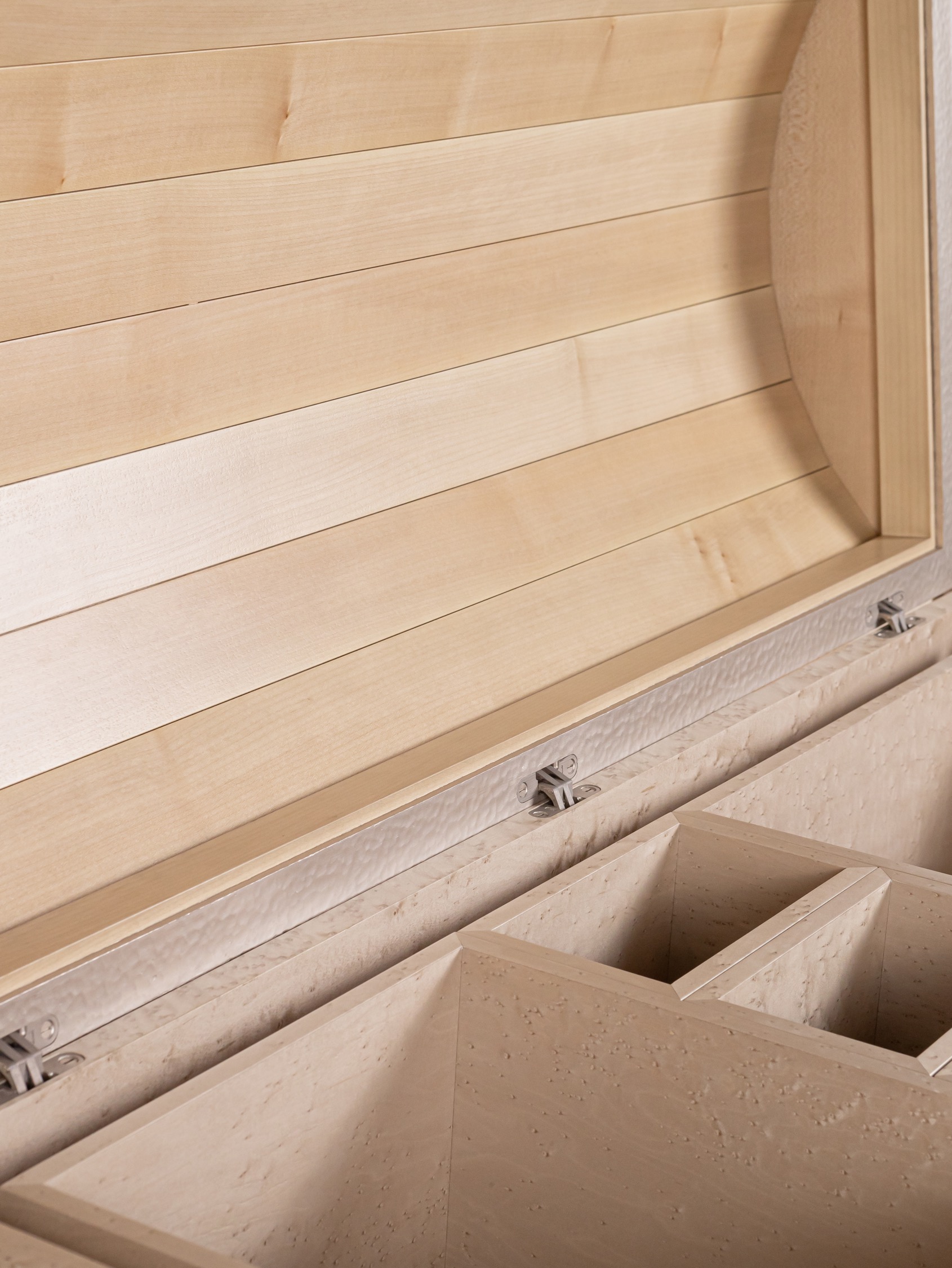 For the Passage collection, Rinck presents its version of the chest, a piece that embodies the very essence of Western cabinetmaking and from which stem all successive evolutions of period furniture. It is a modern, visually striking interpretation combining solid and bird’s eye maple, as well as bronze worked into the ivy-leaf trim and handle. The contemporary marquetry on the façade features abstract touches of color forming an intriguing design that fires the imagination.