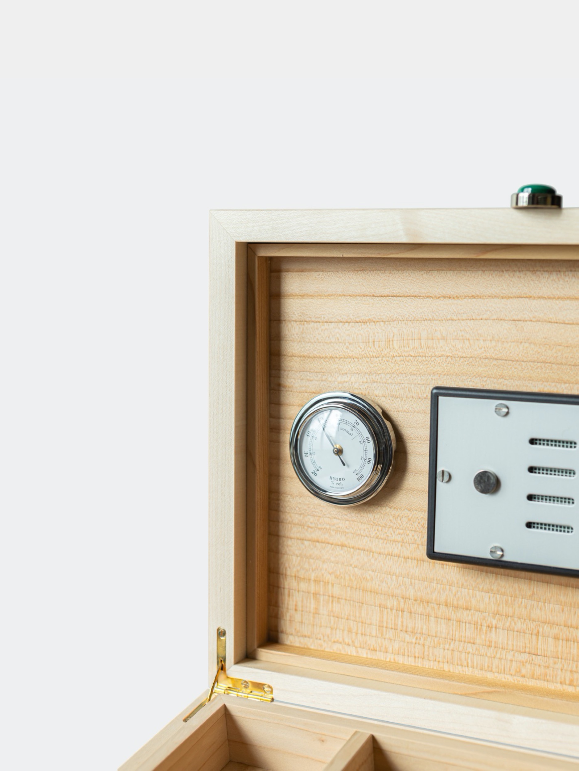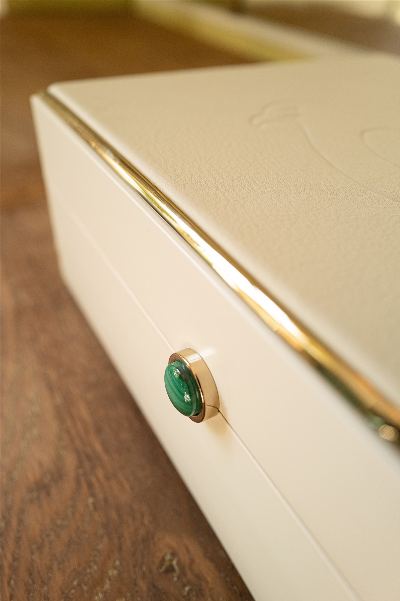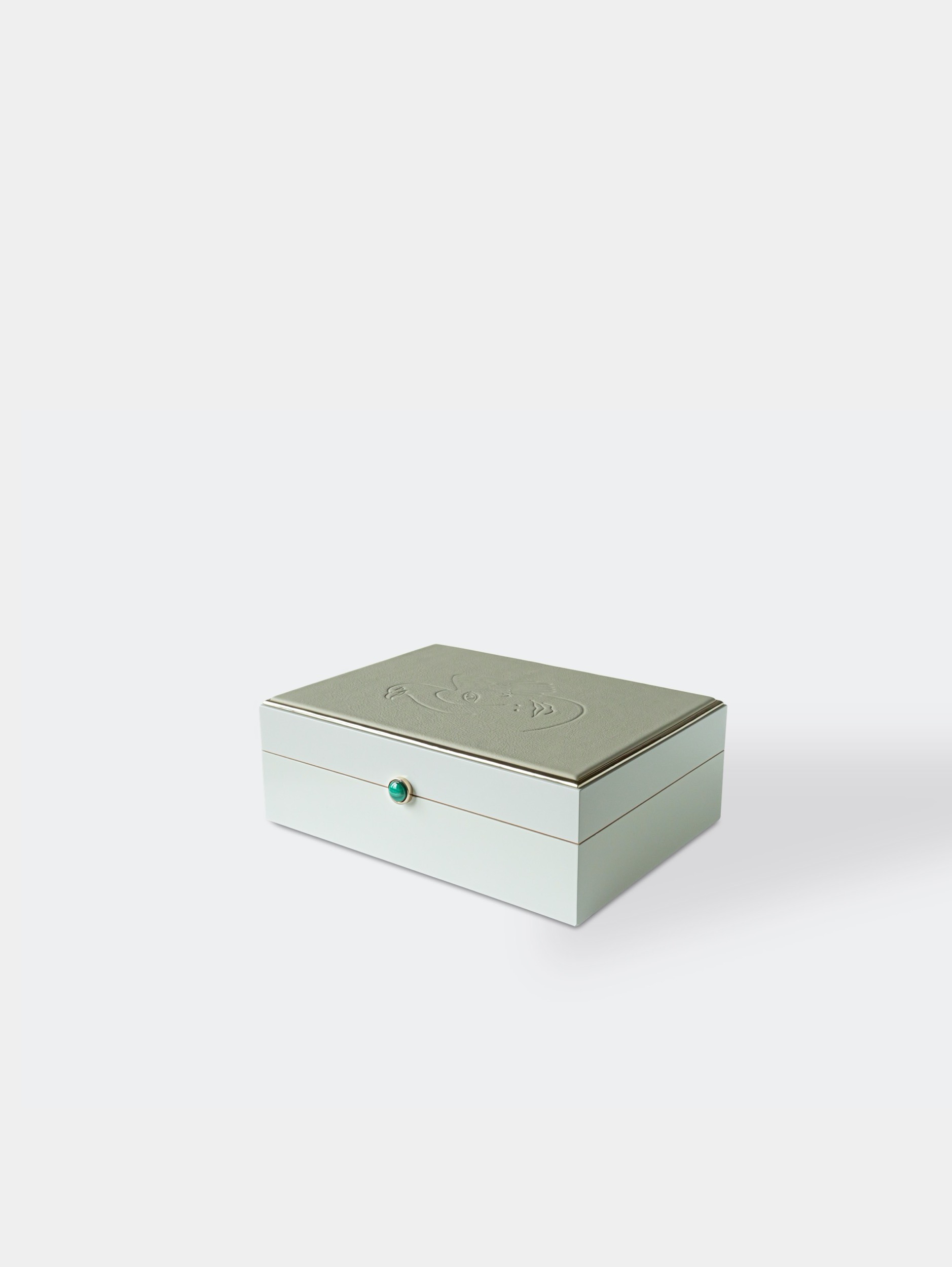 The Hébé collection’s cigar humidor is a miniature showcase, adorned with the face of the Greek goddess in the aesthetics of an artistic sketch. It is also available in a jewelry box version. This piece is handcrafted in the Rinck workshops in France.