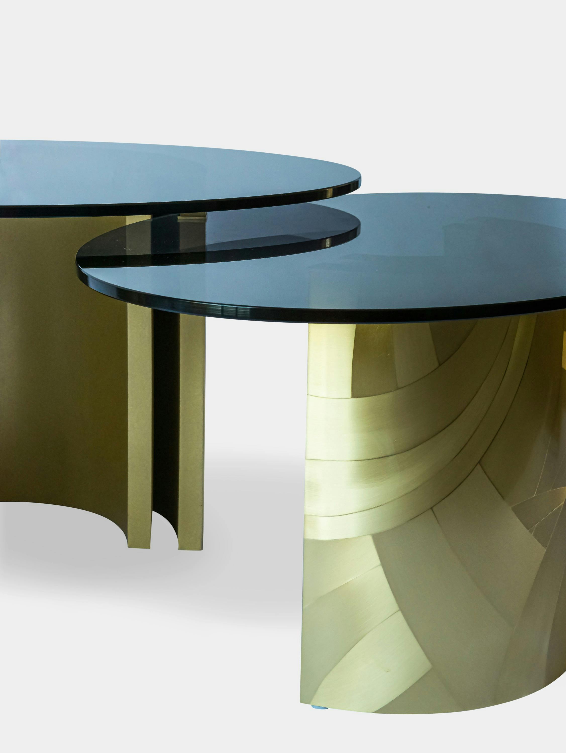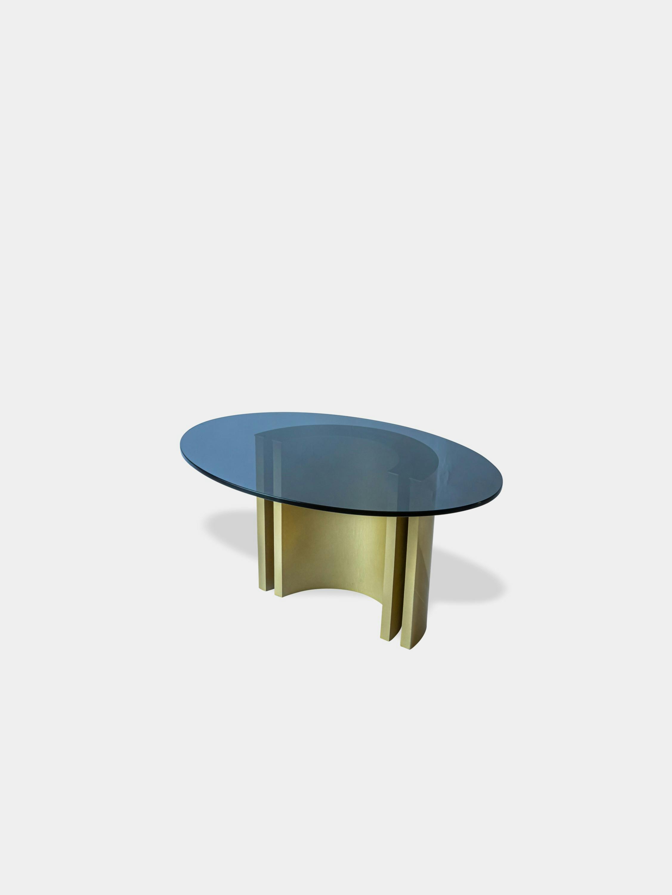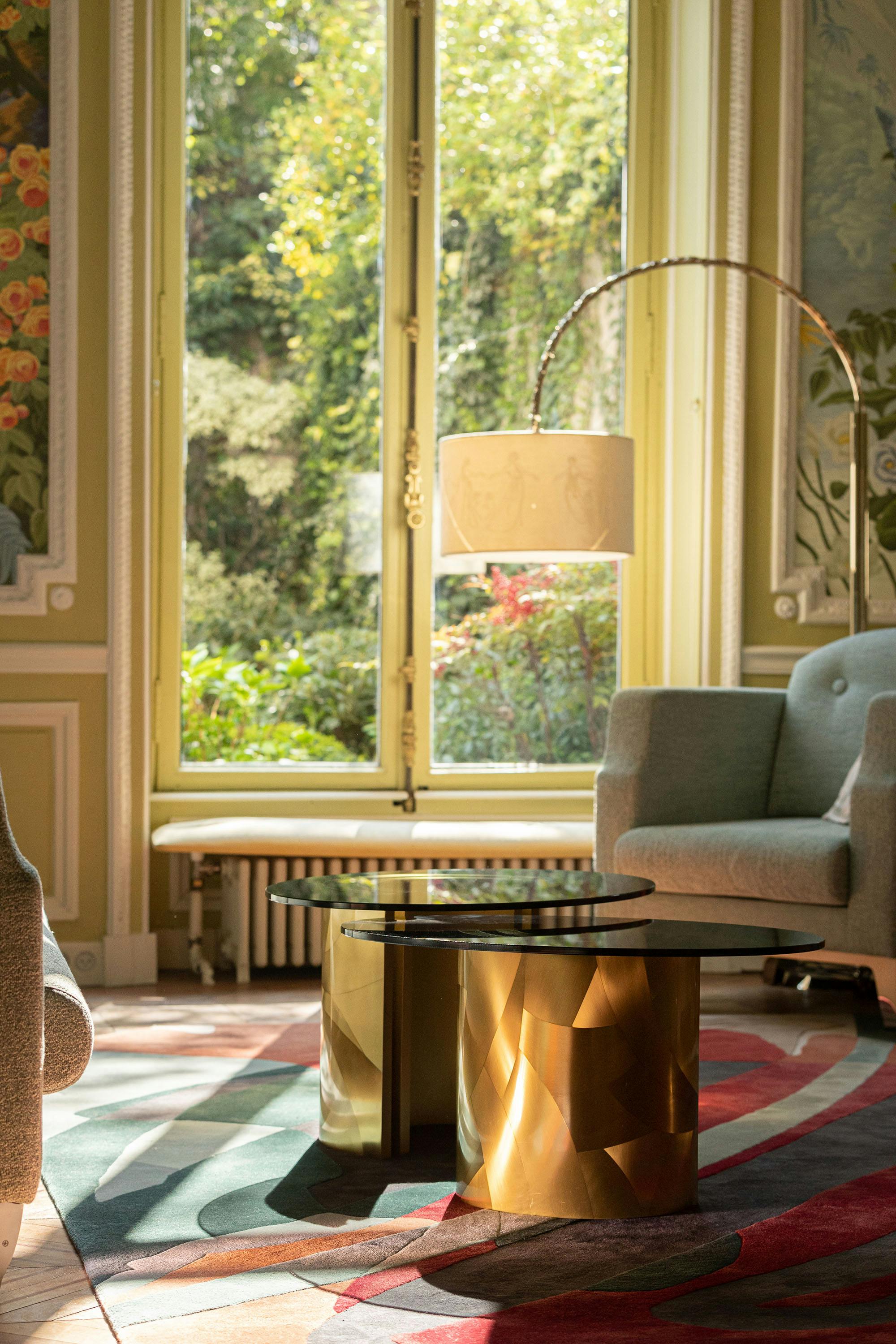 The most contemporary piece in the collection, the Hébé coffee table was designed as a trio, with one large model and two small ones, so that each owner may invent a unique and suitable composition. Visually striking with a brushed finish on brass bases, the set features smoked glass tabletops, creating a striking contrast of materials and inspiring long evenings spent with friends. This piece is handcrafted in the Rinck workshops in France.