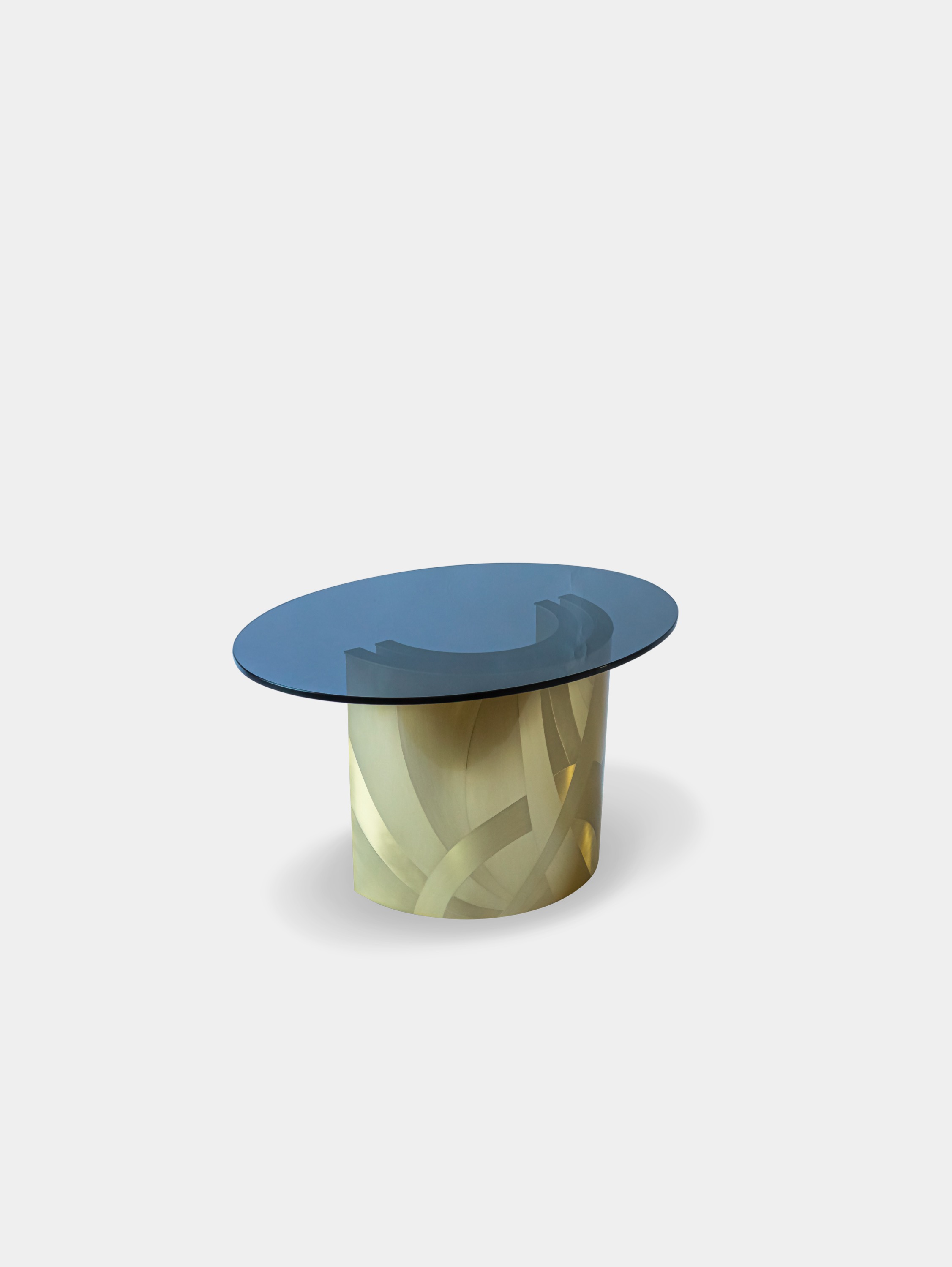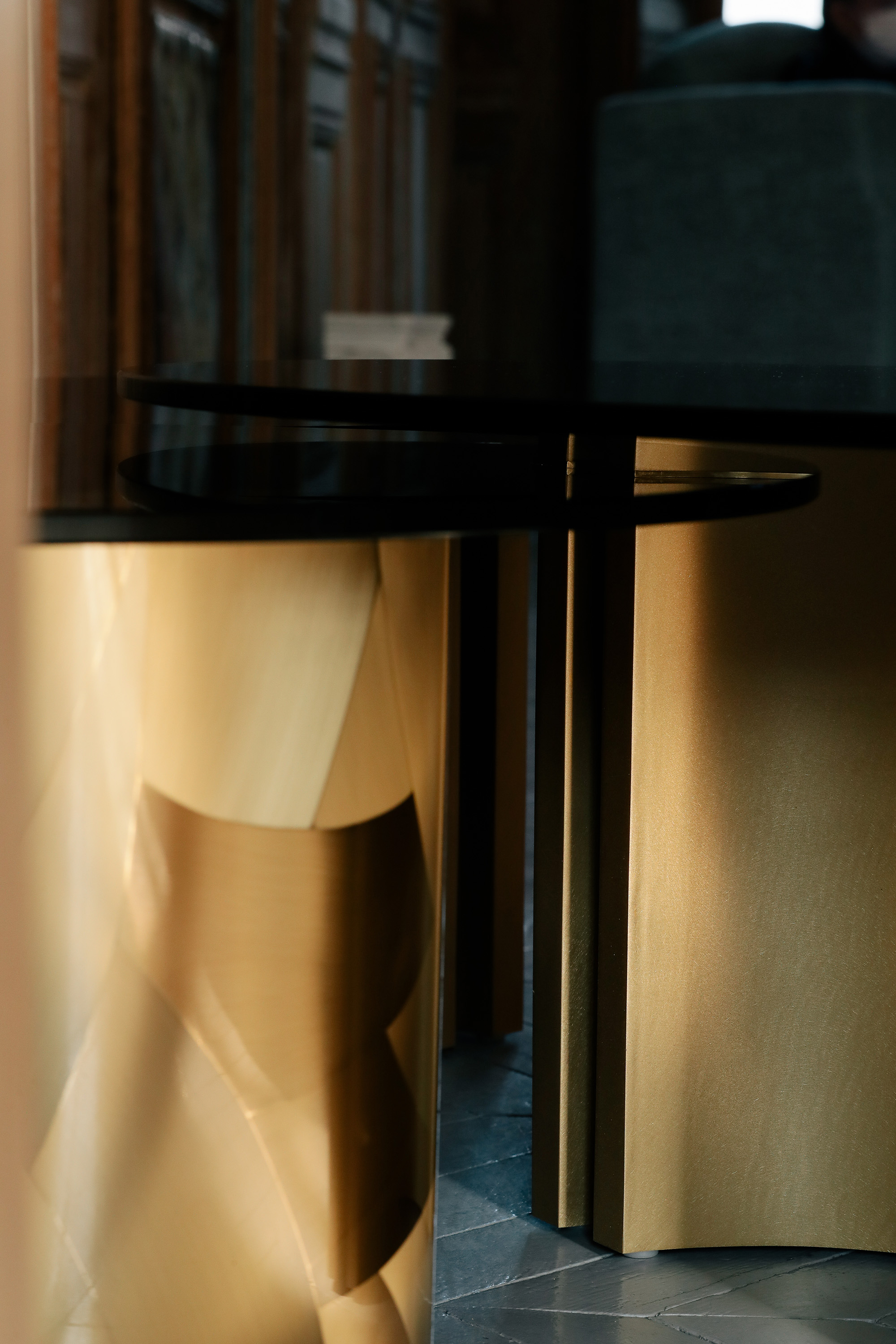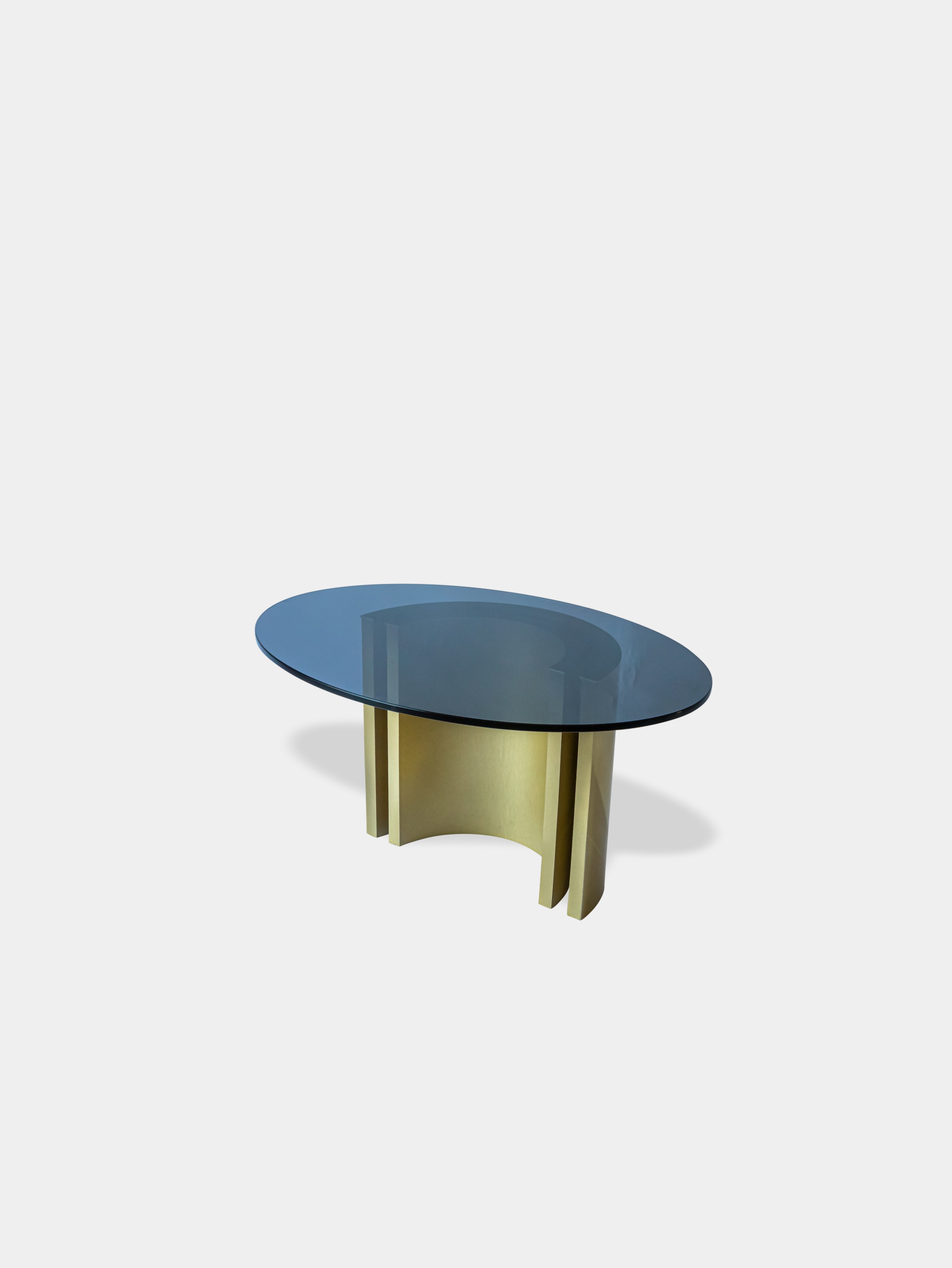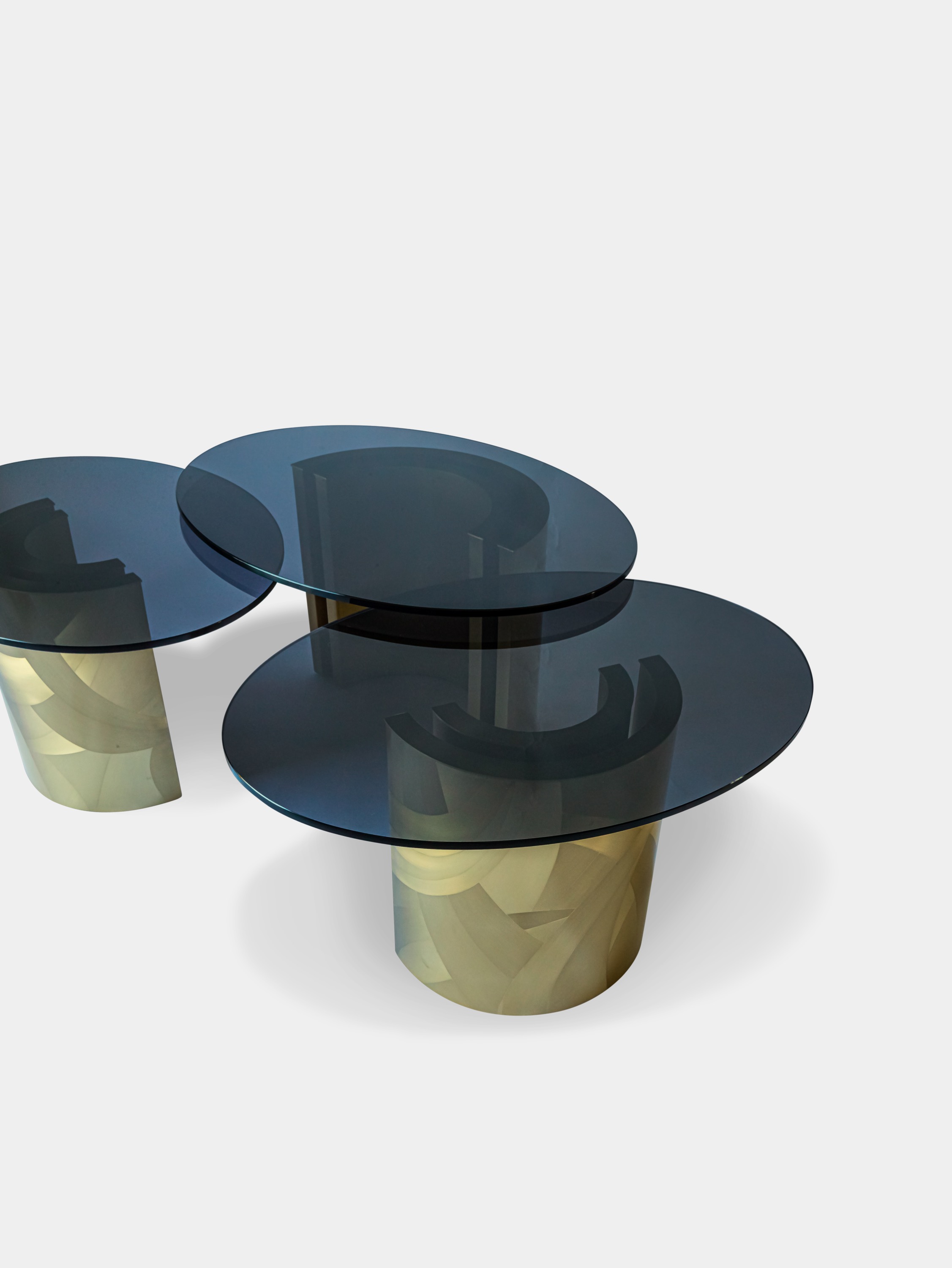 The most contemporary piece in the collection, the Hébé coffee table was designed as a trio, with one large model and two small ones, so that each owner may invent a unique and suitable composition. Visually striking with a brushed finish on brass bases, the set features smoked glass tabletops, creating a striking contrast of materials and inspiring long evenings spent with friends. This piece is handcrafted in the Rinck workshops in France.
