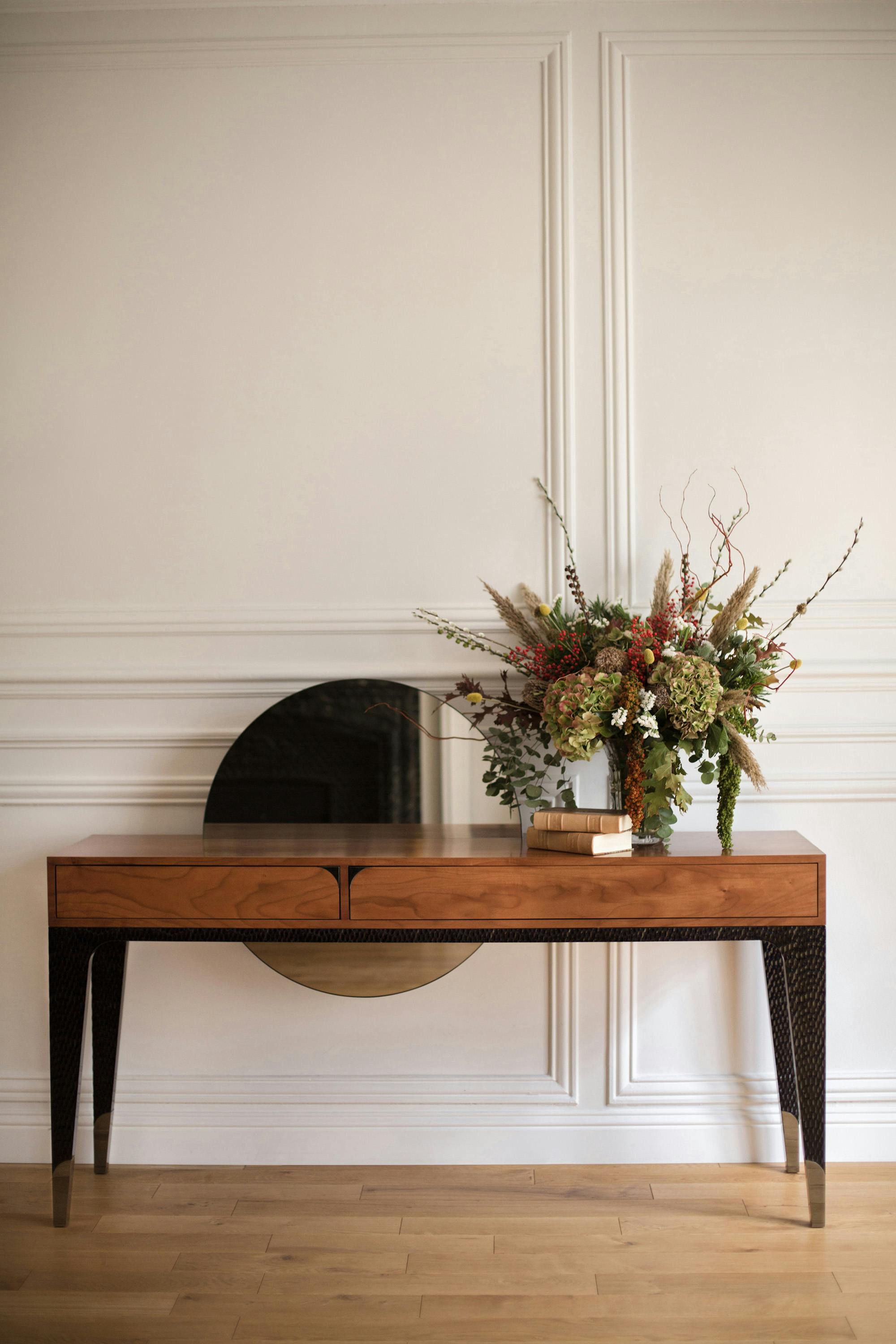 The console, which drew tremendous attention when unveiled with the rest of the Félicité collection, takes its inspiration from a 1937 table's base designed by Maurice Rinck and Lucie Renaudot., but exudes a 1970s-like aesthetic, with an asymmetrical mirror crosspiece rising like the sun over the French walnut top. A truly striking design with precious details, such as leather-lined drawers. This piece is handcrafted in the Rinck workshops in France.