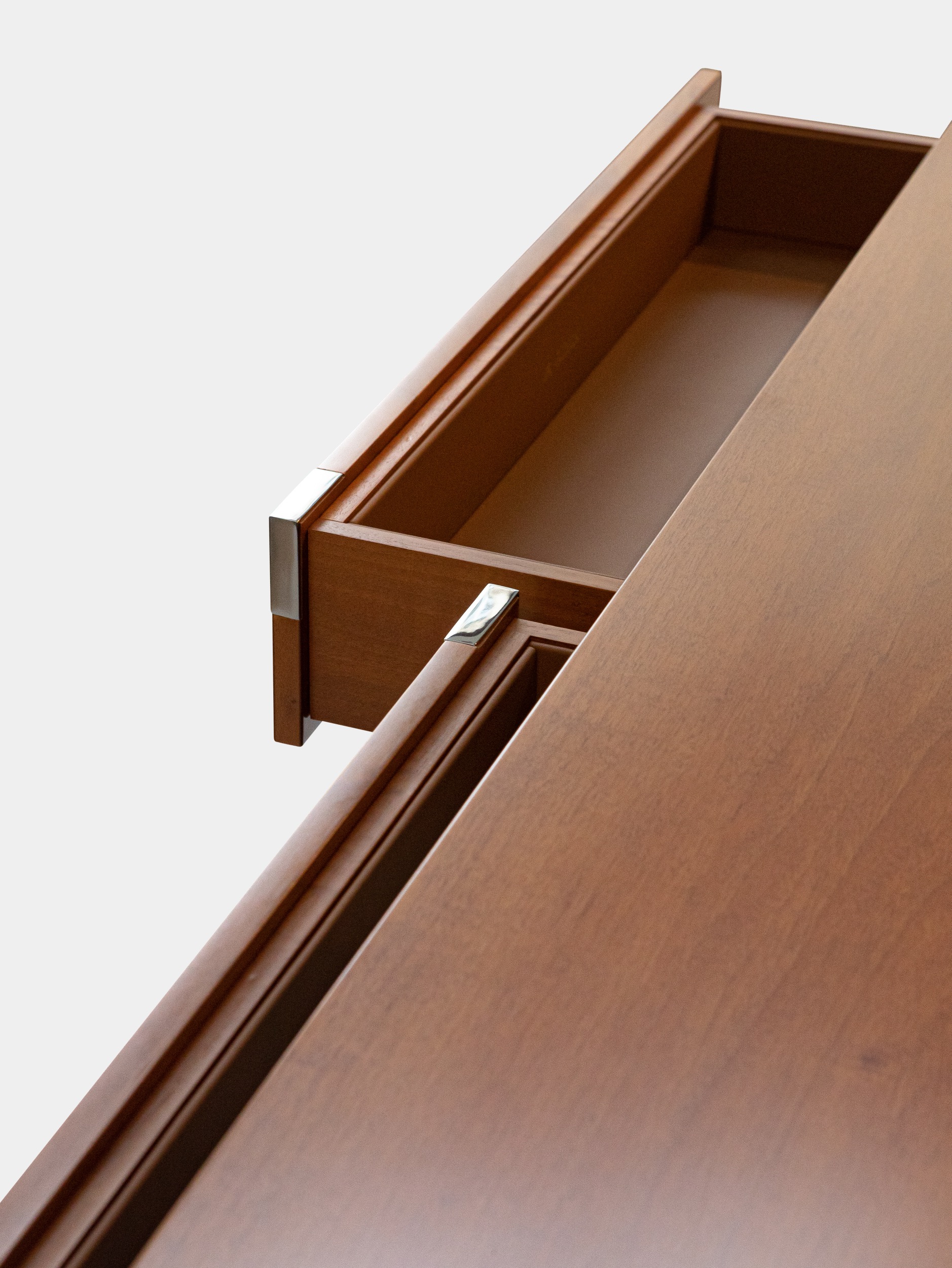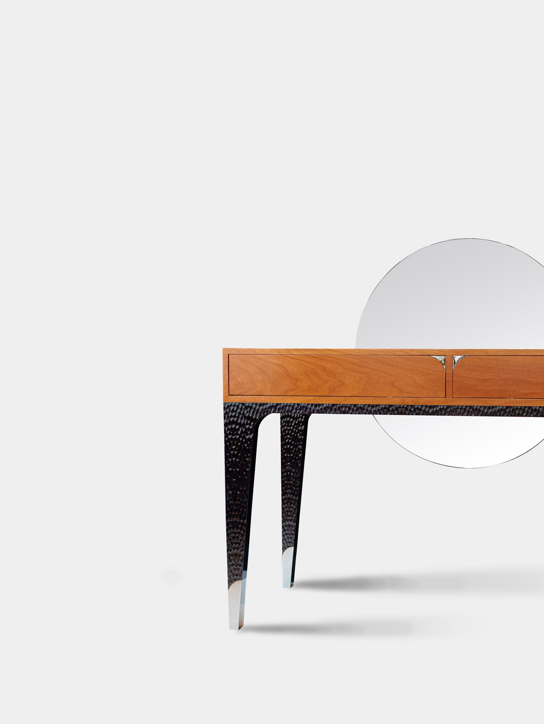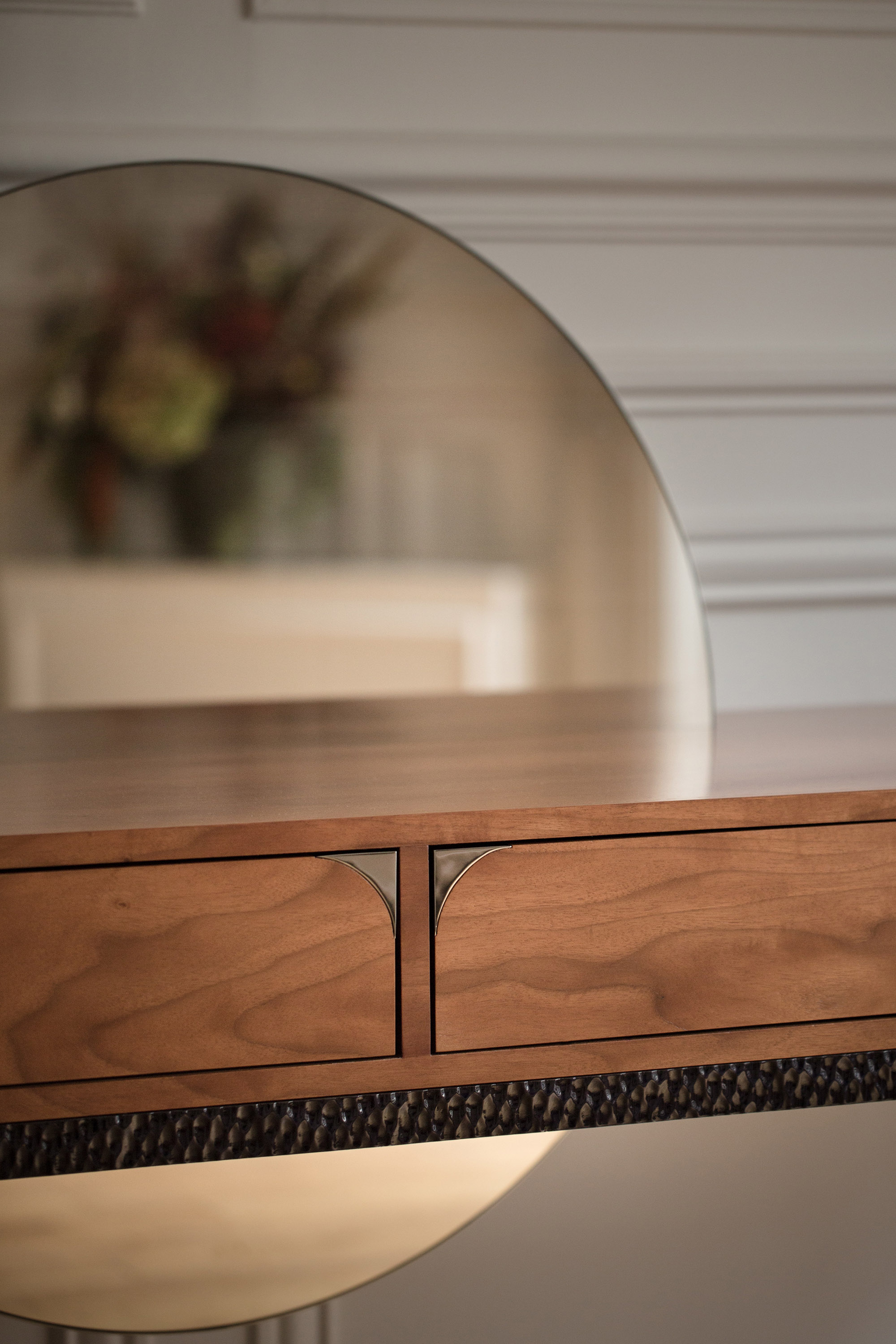 The console, which drew tremendous attention when unveiled with the rest of the Félicité collection, takes its inspiration from a 1937 table's base designed by Maurice Rinck and Lucie Renaudot., but exudes a 1970s-like aesthetic, with an asymmetrical mirror crosspiece rising like the sun over the French walnut top. A truly striking design with precious details, such as leather-lined drawers. This piece is handcrafted in the Rinck workshops in France.