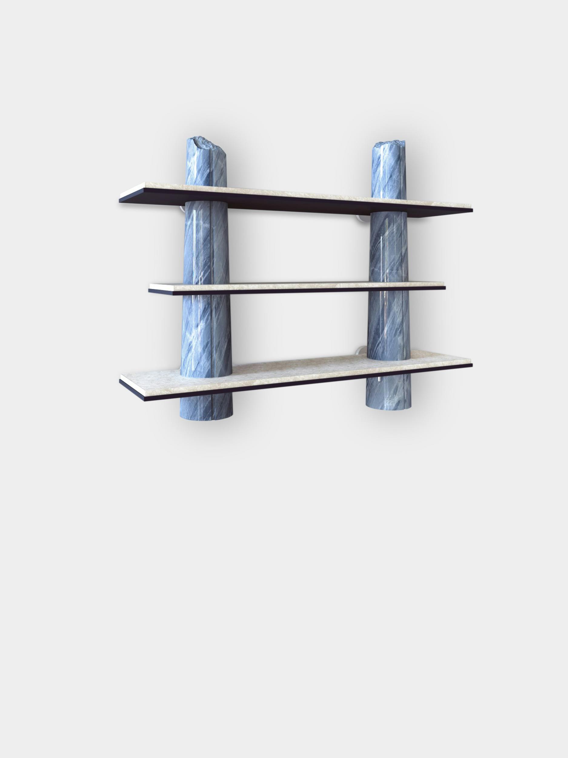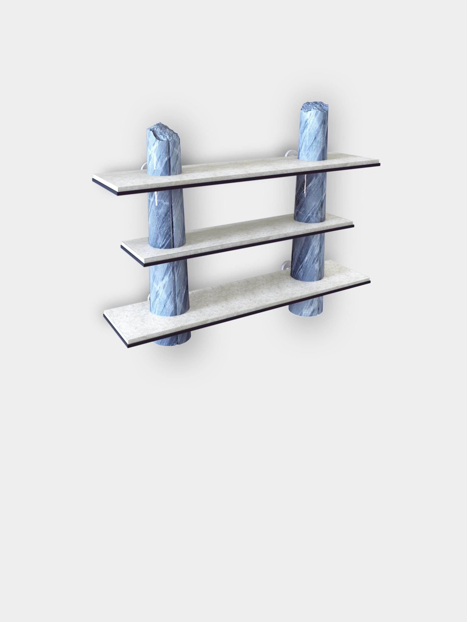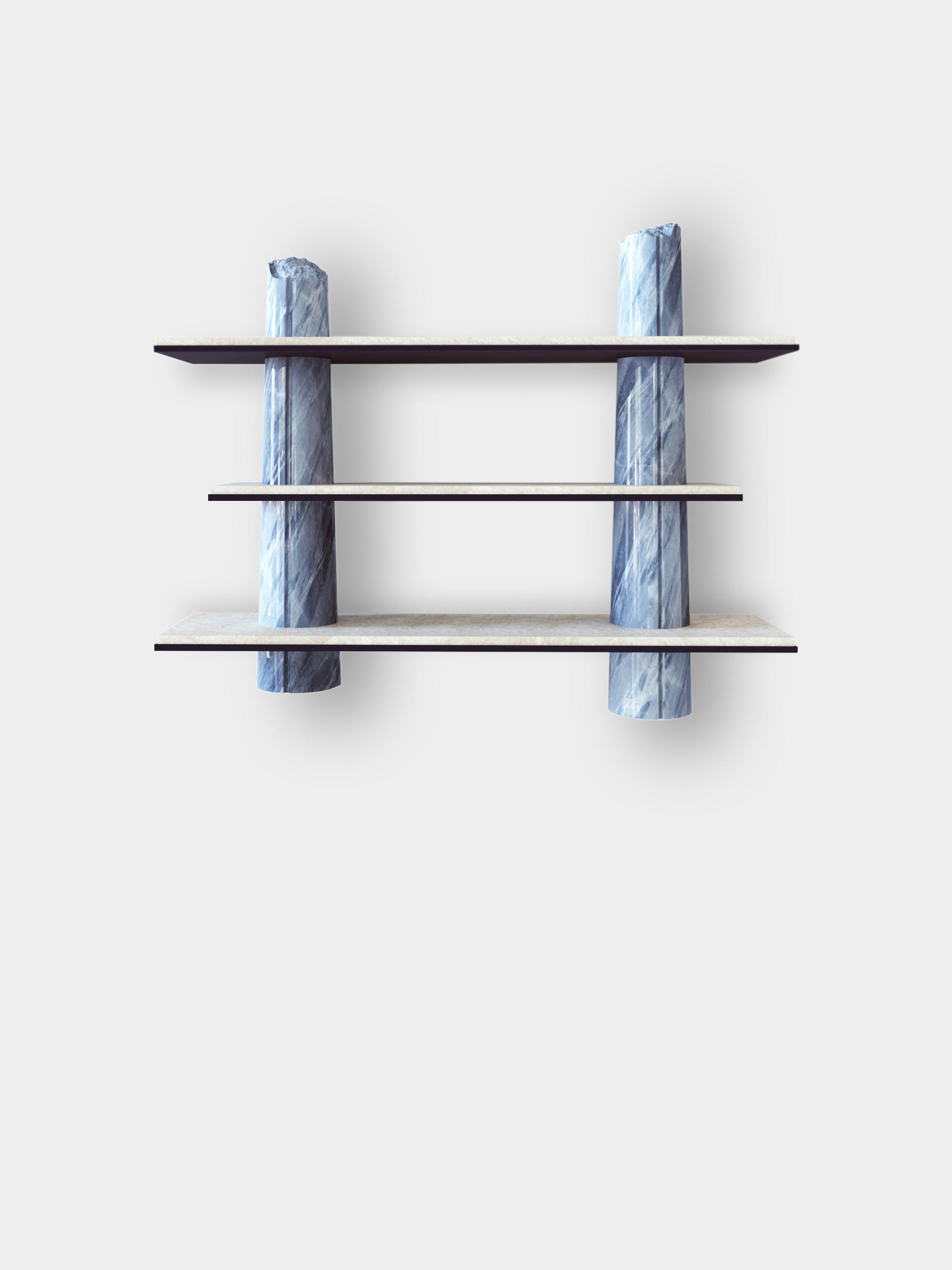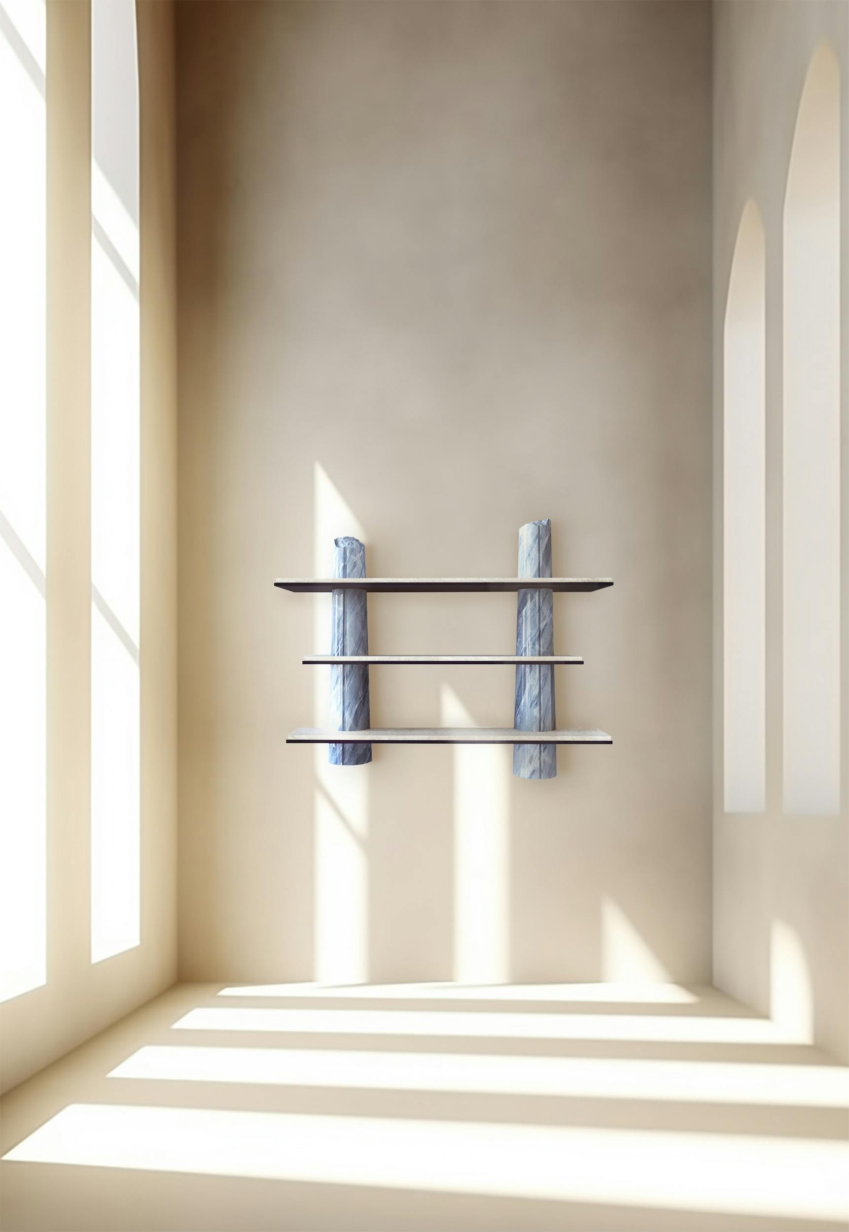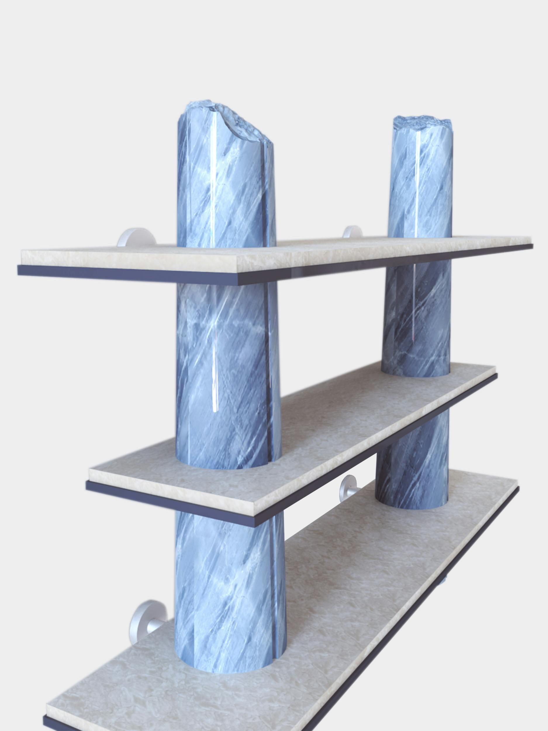 Though the shelves designed for the Passage collection were intended for home use, they also form a sculpture, featuring very precise, deliberate artistic work on the columns that makes them appear broken. This trompe l'oeil is rendered more convincing still by decorative painting that impeccably imitates Bahia blue marble. A discreet commentary on the environmental footprint left by overconsumption of rare marbles in the decor world.