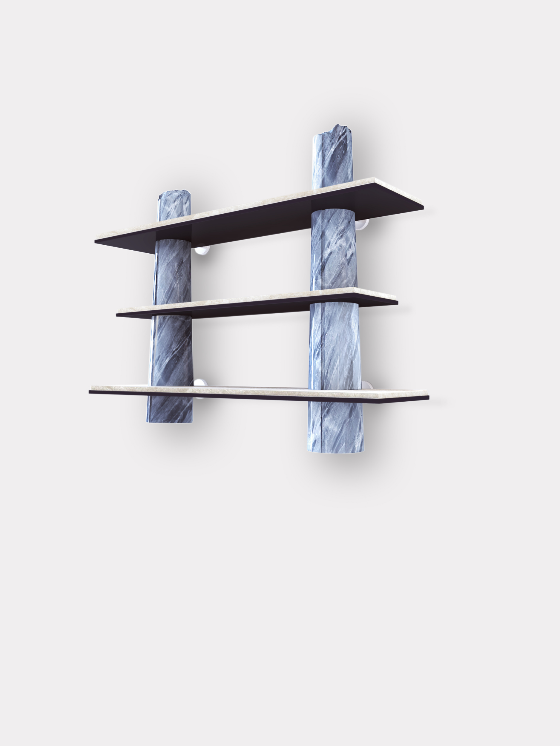 Though the shelves designed for the Passage collection were intended for home use, they also form a sculpture, featuring very precise, deliberate artistic work on the columns that makes them appear broken. This trompe l'oeil is rendered more convincing still by decorative painting that impeccably imitates Bahia blue marble. A discreet commentary on the environmental footprint left by overconsumption of rare marbles in the decor world.