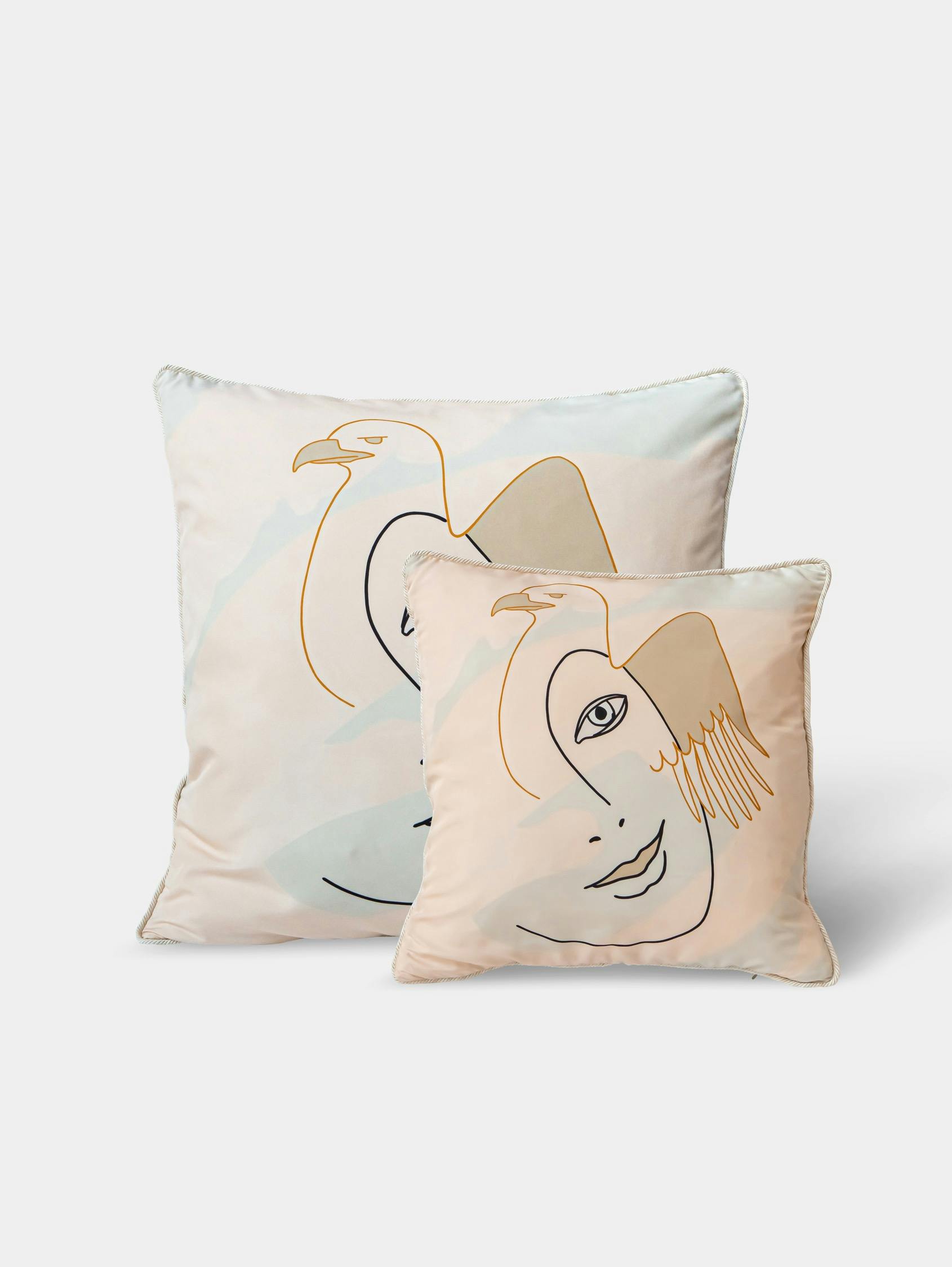 These cushions, designed to coordinate with the collection’s sofa and armchair, reflect the full ornamental language associated with the goddess Hebe, symbolizing the youth and eternity of the gods of Olympus. As the daughter of Zeus, her attributes include her father’s eagle; she is also accompanied by the Three Graces, as in the prologue ofThe Festivities of Hebe, the 18th-century work by French composer Jean-Philippe Rameau, which portrays Hebe’s celebratory feast.