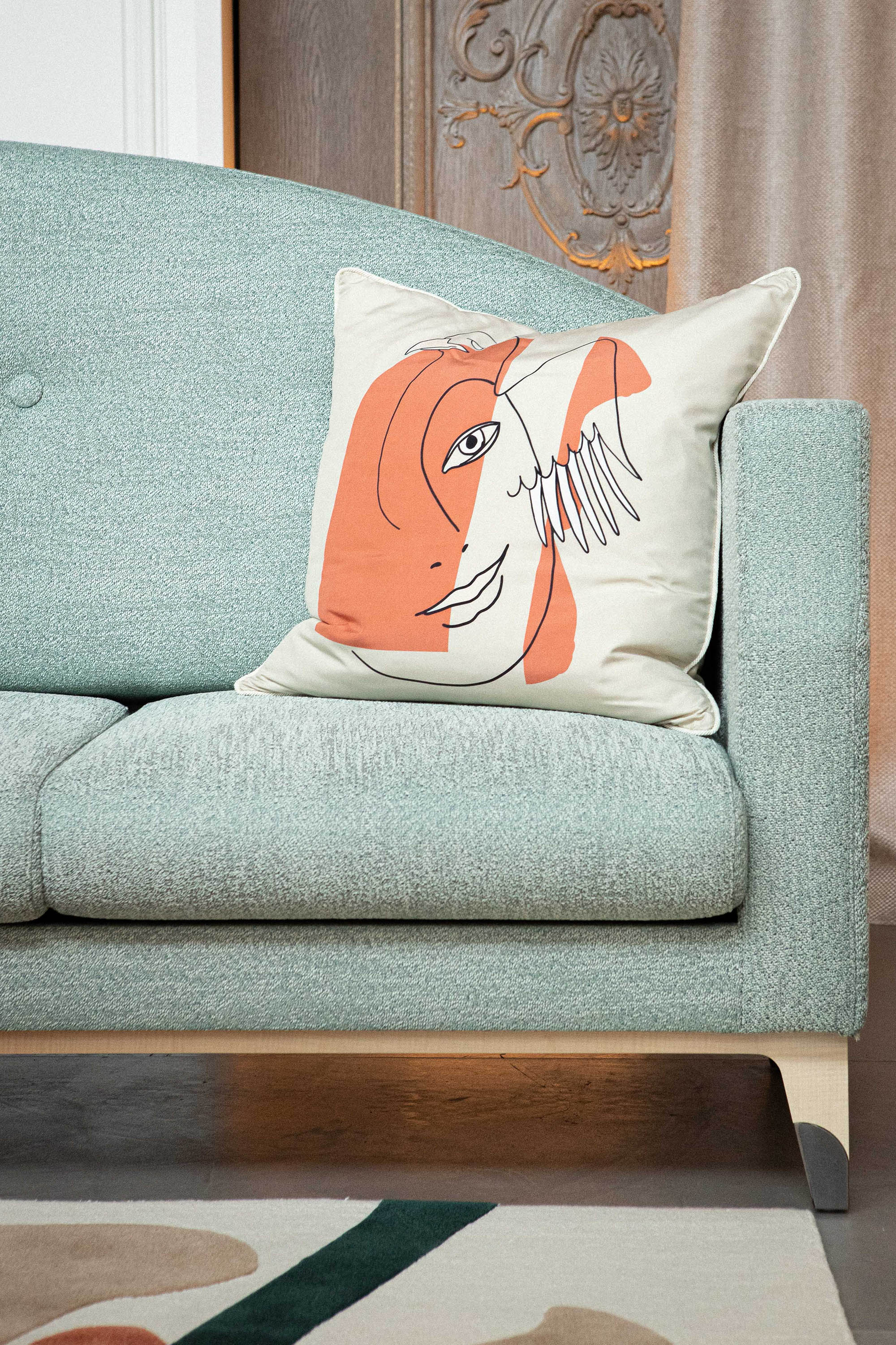 These cushions, designed to coordinate with the collection’s sofa and armchair, reflect the full ornamental language associated with the goddess Hebe, symbolizing the youth and eternity of the gods of Olympus. As the daughter of Zeus, her attributes include her father’s eagle; she is also accompanied by the Three Graces, as in the prologue ofThe Festivities of Hebe, the 18th-century work by French composer Jean-Philippe Rameau, which portrays Hebe’s celebratory feast.