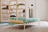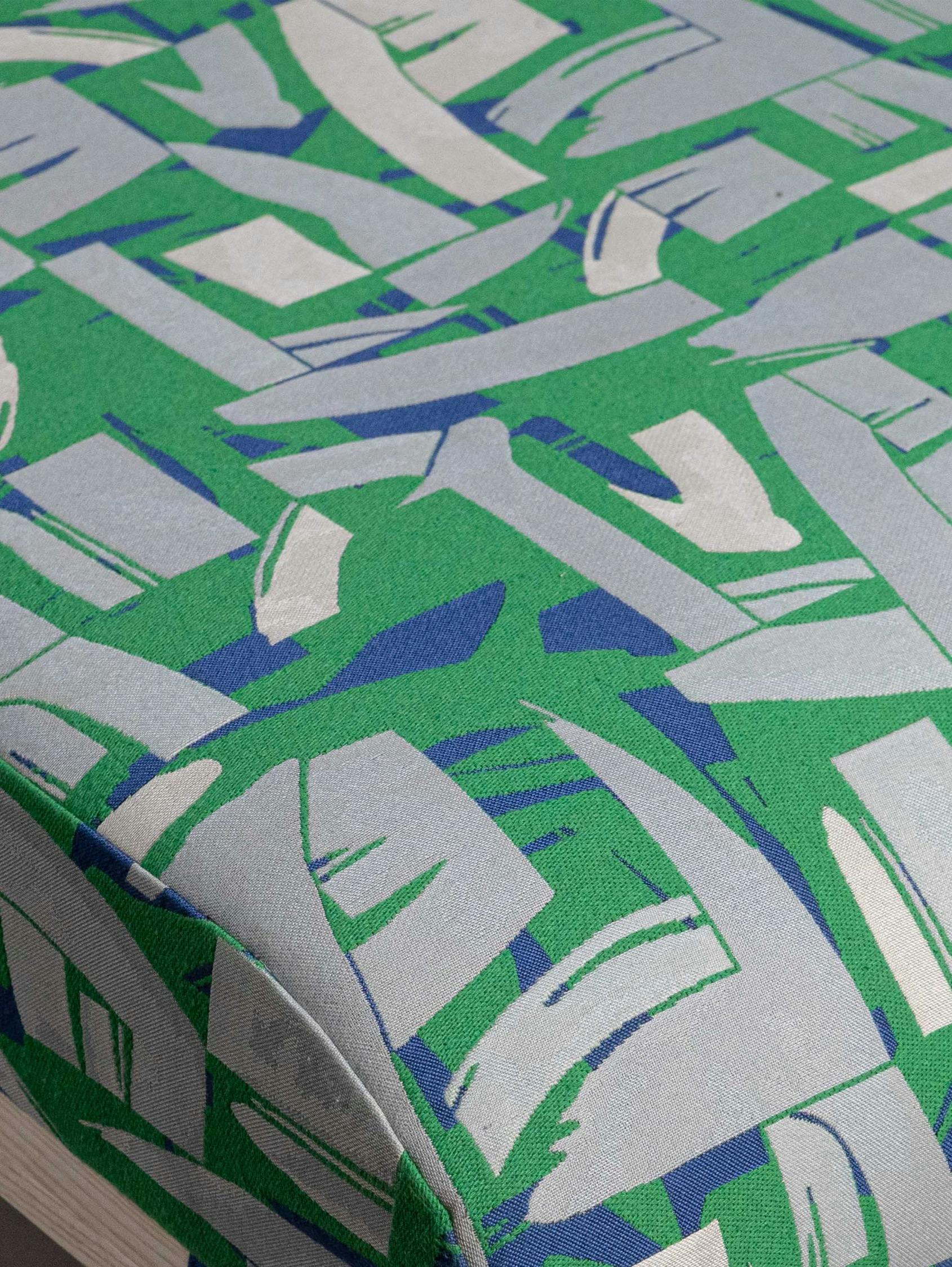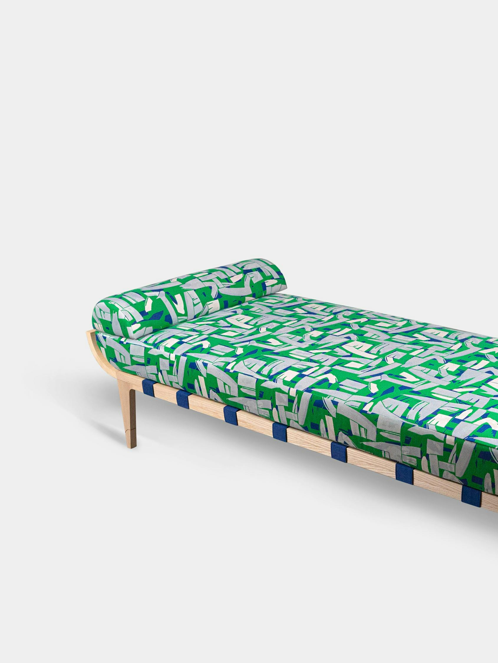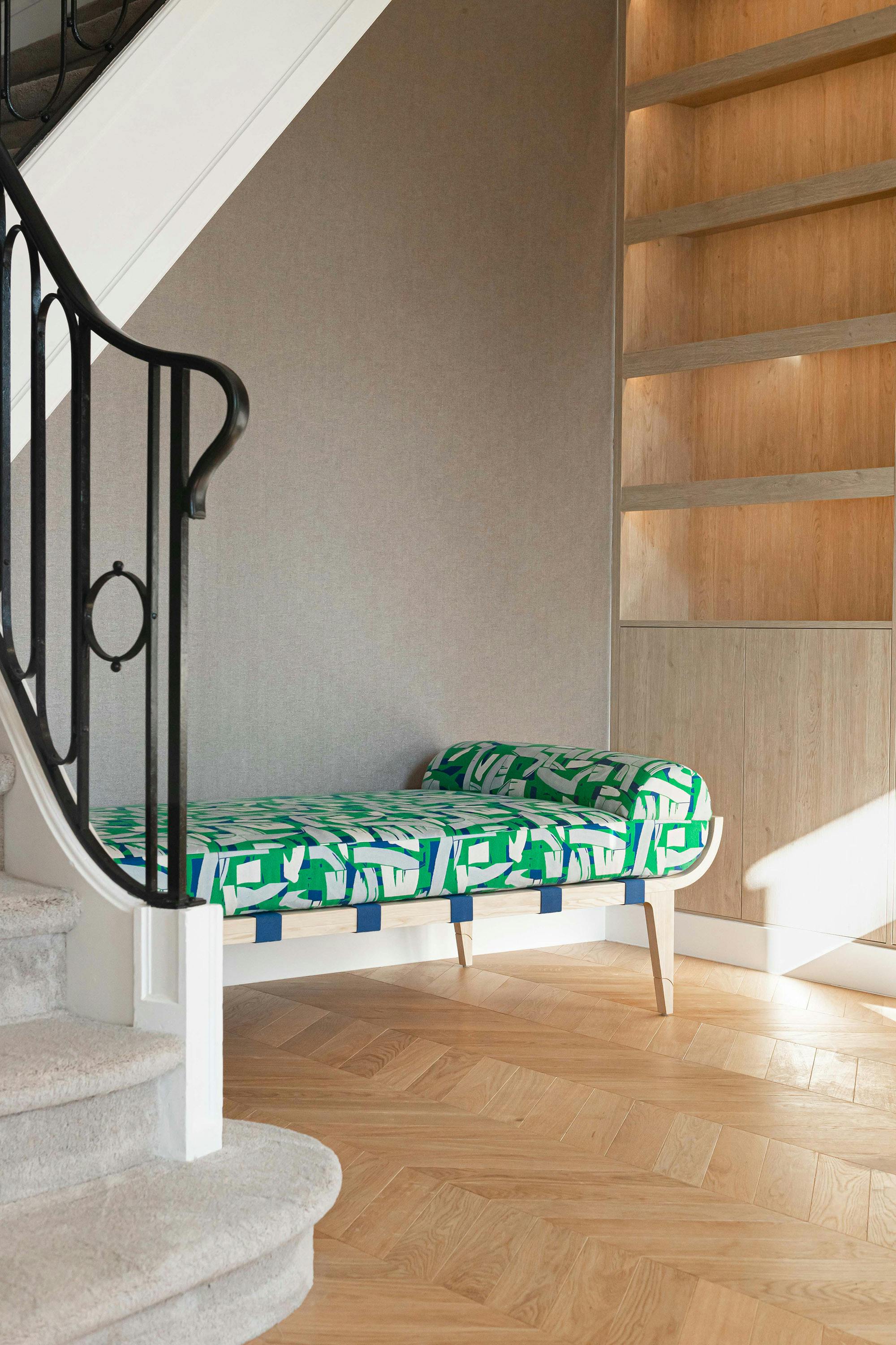 The Amarante collection daybed is a subtle pairing of bold color and streamlined form, softness and exuberance. The curve of its frame – crafted of solid wood, simply oiled – poetically echoes the movements of the natural world. The choice of finish reflects the deep respect our craftspeople hold for the materials they use. The streamlined, decidedly modern lines exude great elegance. They contrast with the textile’s abstract geometric shapes, which give the room character. The fabric’s patterns were inspired by cubist wallpapers found in journals from the 1930s, as well as Rinck’s own archival treasures. These include a panel in verre églomisé representing a bouquet on a sideboard that Rinck presented at the 1939 New York World’s Fair.