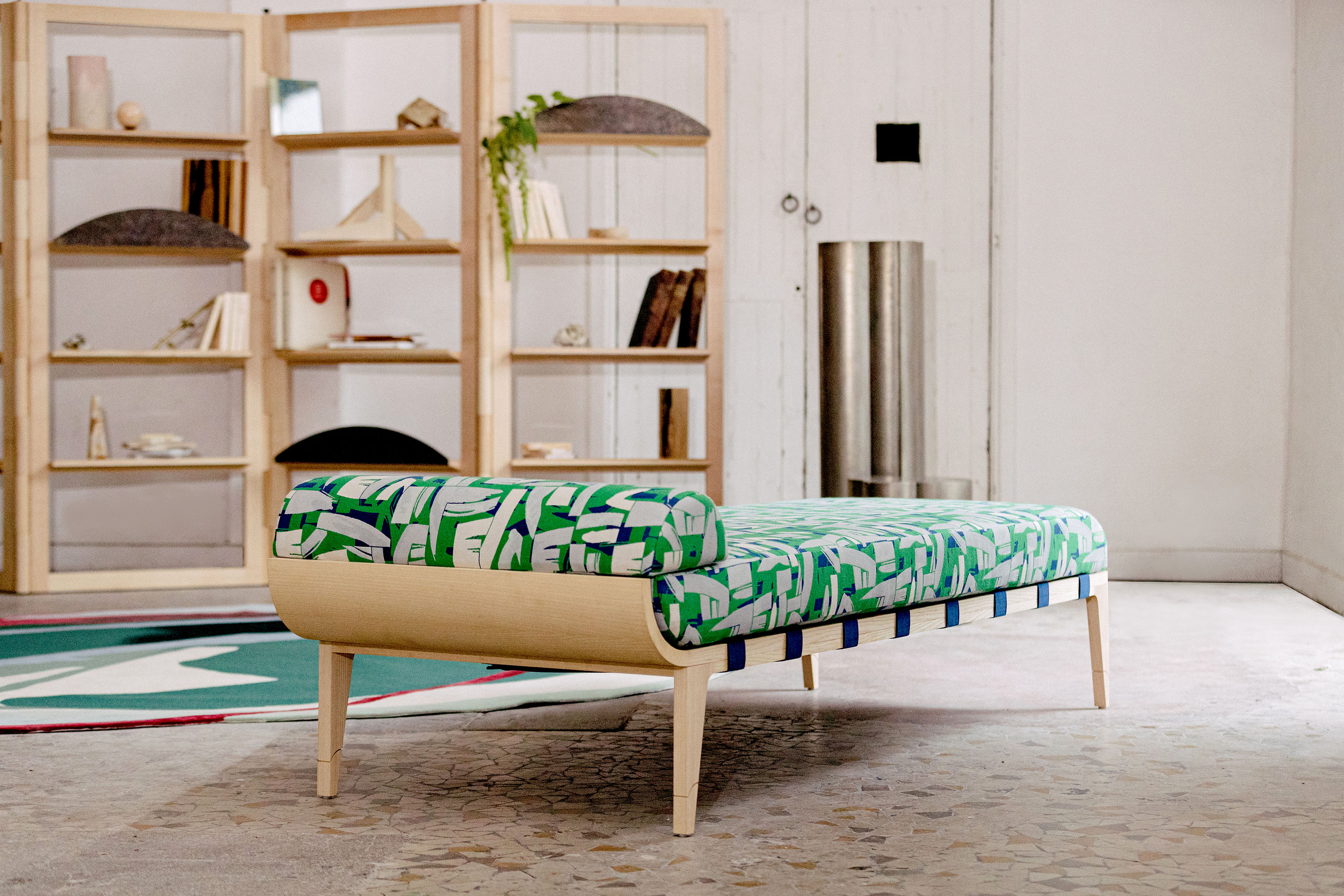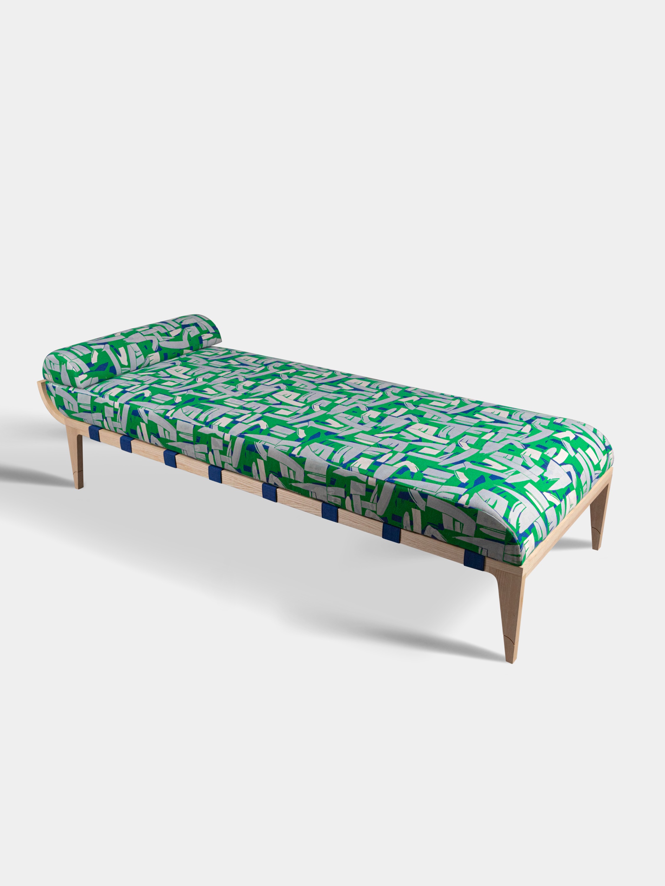 The Amarante collection daybed is a subtle pairing of bold color and streamlined form, softness and exuberance. The curve of its frame – crafted of solid wood, simply oiled – poetically echoes the movements of the natural world. The choice of finish reflects the deep respect our craftspeople hold for the materials they use. The streamlined, decidedly modern lines exude great elegance. They contrast with the textile’s abstract geometric shapes, which give the room character. The fabric’s patterns were inspired by cubist wallpapers found in journals from the 1930s, as well as Rinck’s own archival treasures. These include a panel in verre églomisé representing a bouquet on a sideboard that Rinck presented at the 1939 New York World’s Fair.