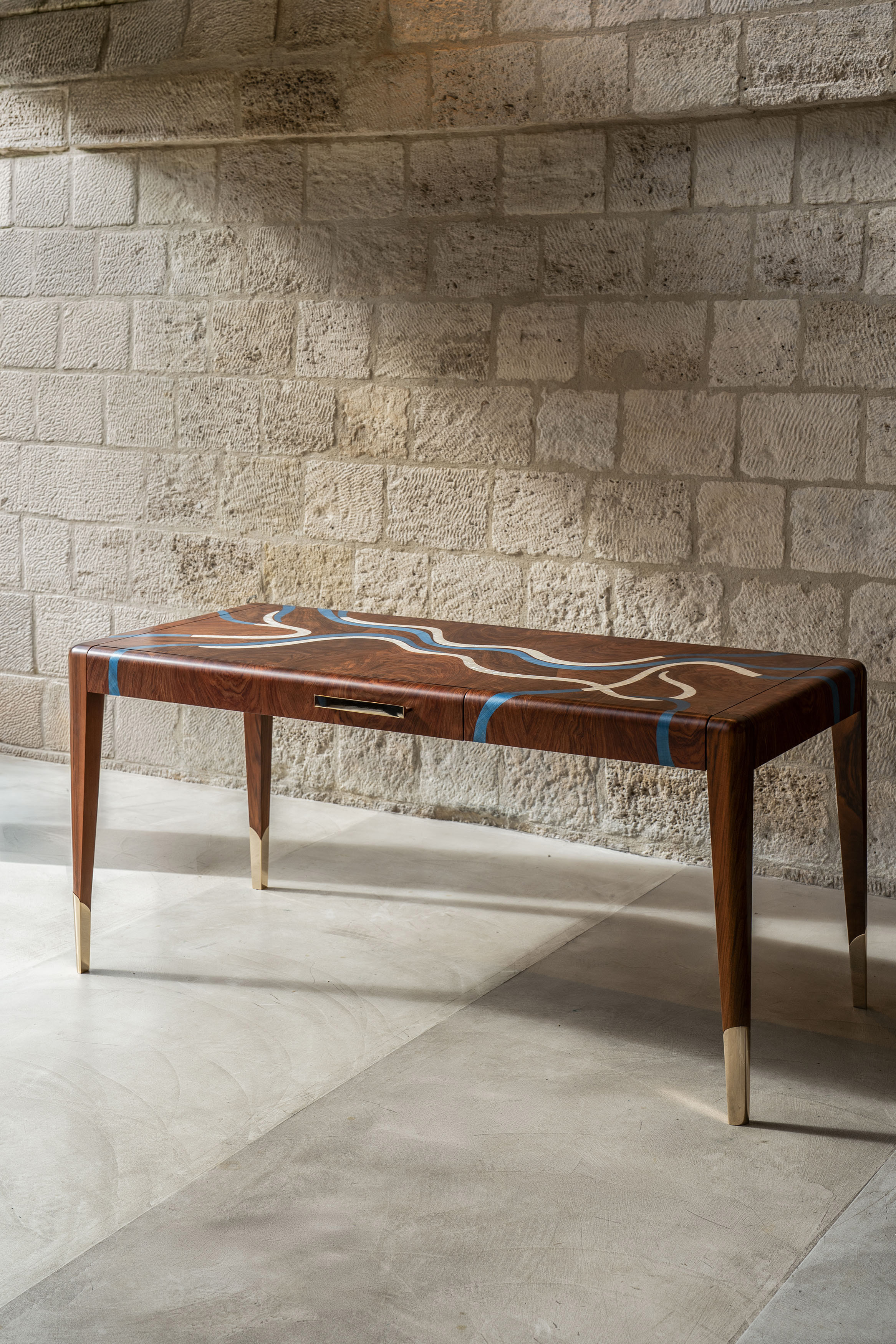 With its fluid lines and turquoise marquetry inlaid with mother-of-pearl, the Nereus desk extends the visual language of the collection. The patterns across the top follow the flow of an invisible current, forming a subtle relief that catches the light. Patinated in a moongold shade, the bronze details highlight the elegance of the structure. Both graphic and organic, this piece brings materials into dialogue, shaping a contemporary design inspired by the marine world.