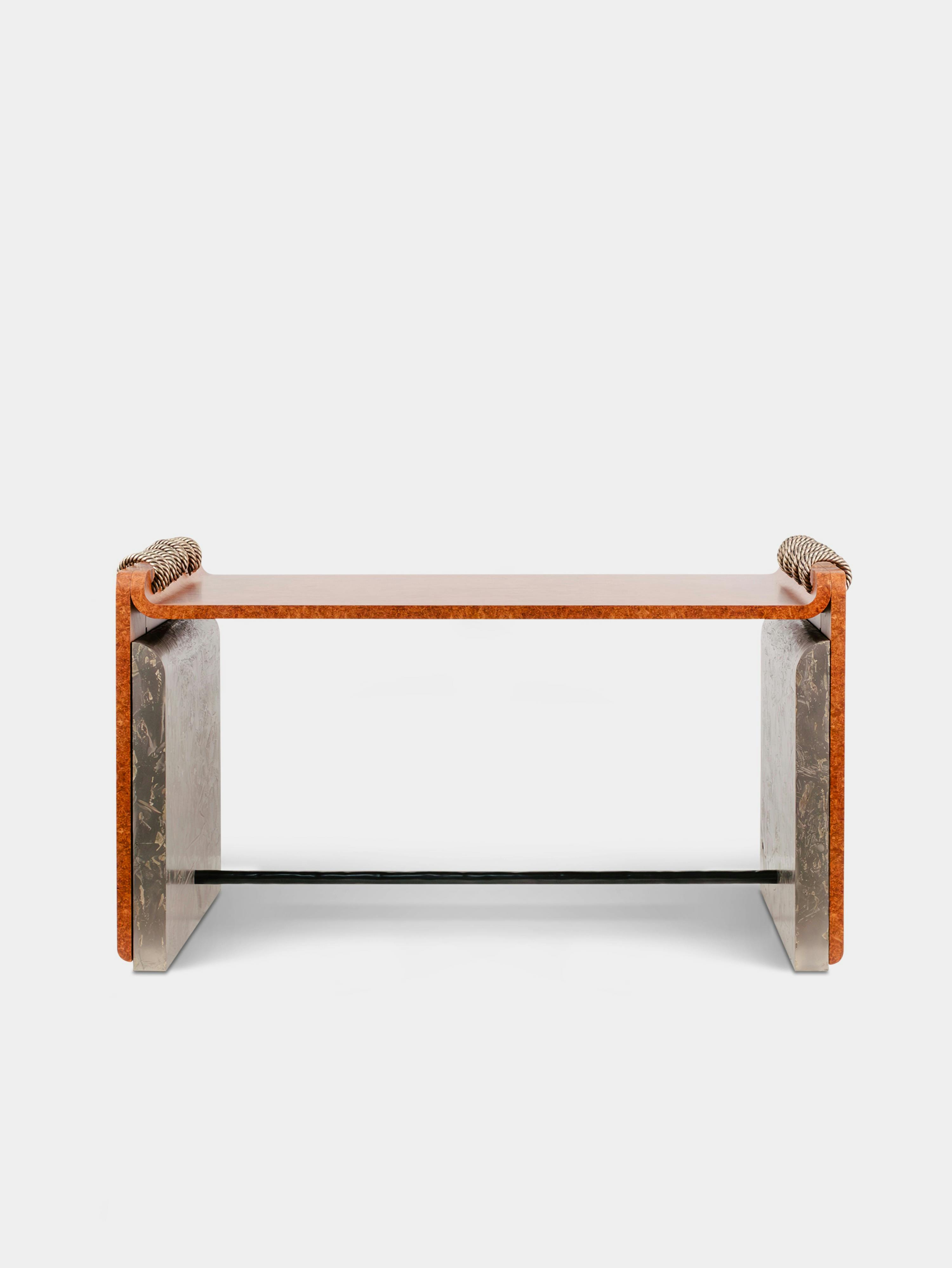 Covered in a sumptuous amboyna-burl veneer, the clean lines of the desk, its delicate touches – whipstitched rope of braided bronze, metallic side panels with gold leaf inlays – make it a functional masterpiece providing an elegant and inspiring workspace. A perfect blend of ergonomics and aesthetics.