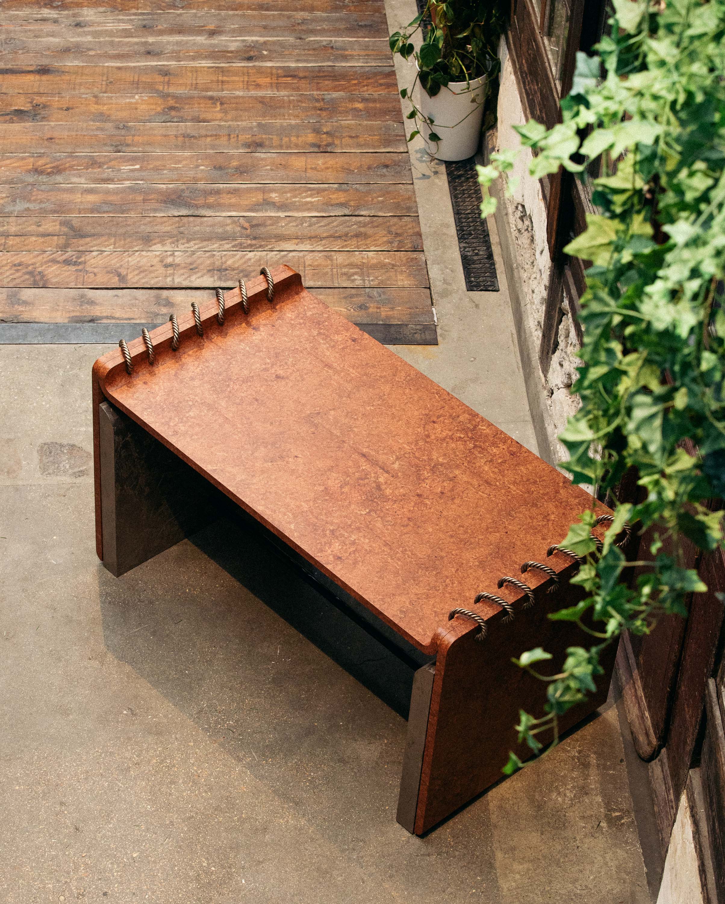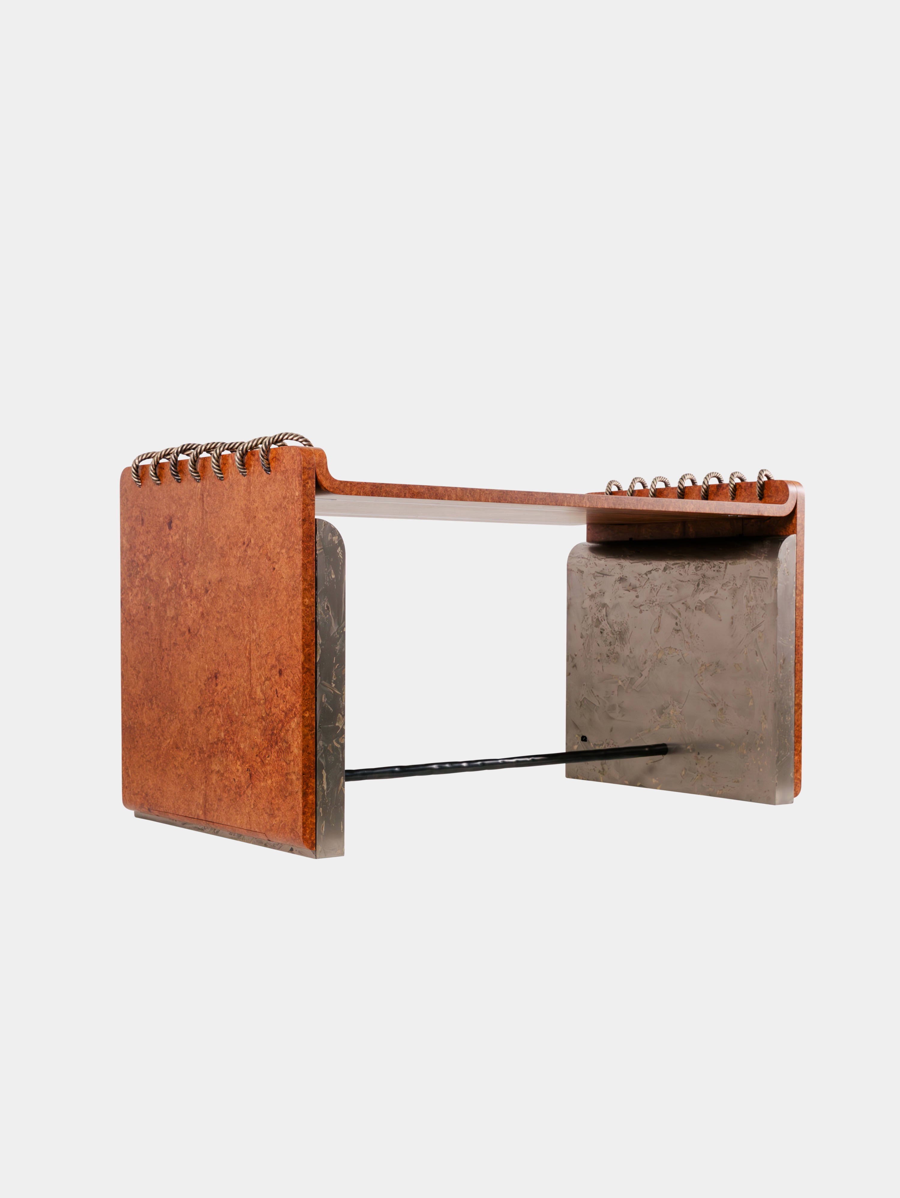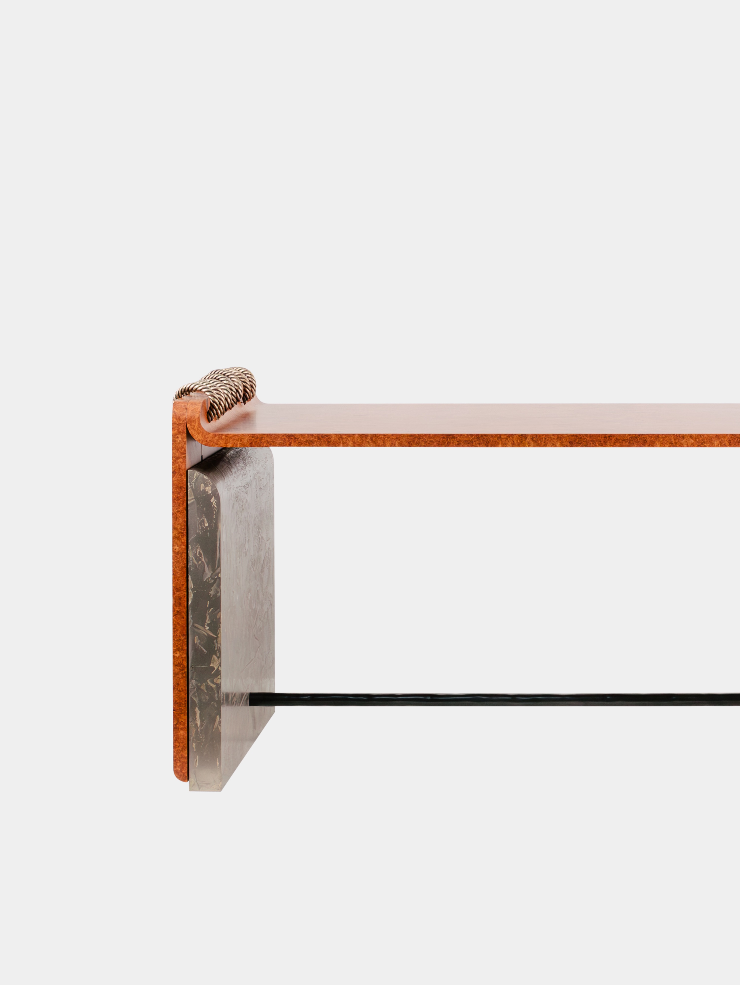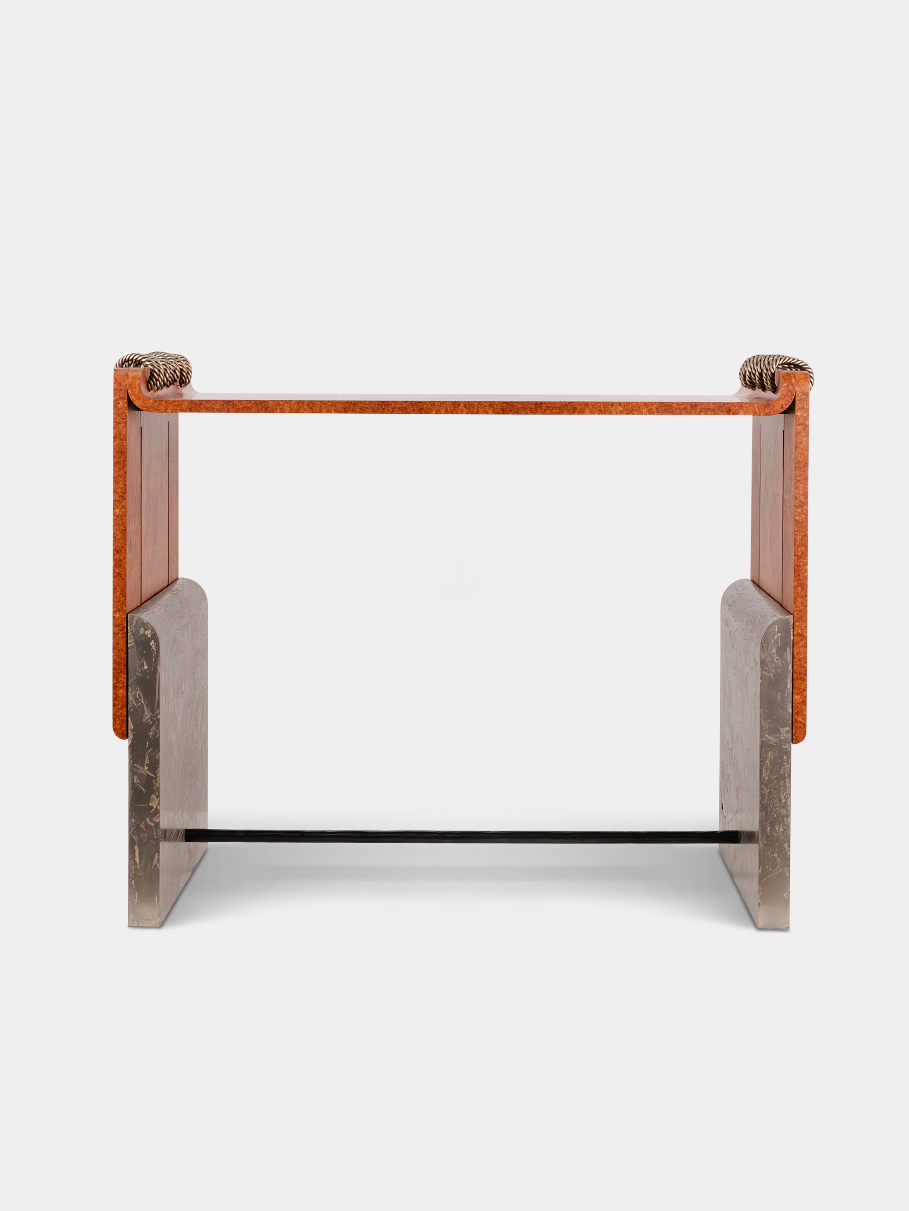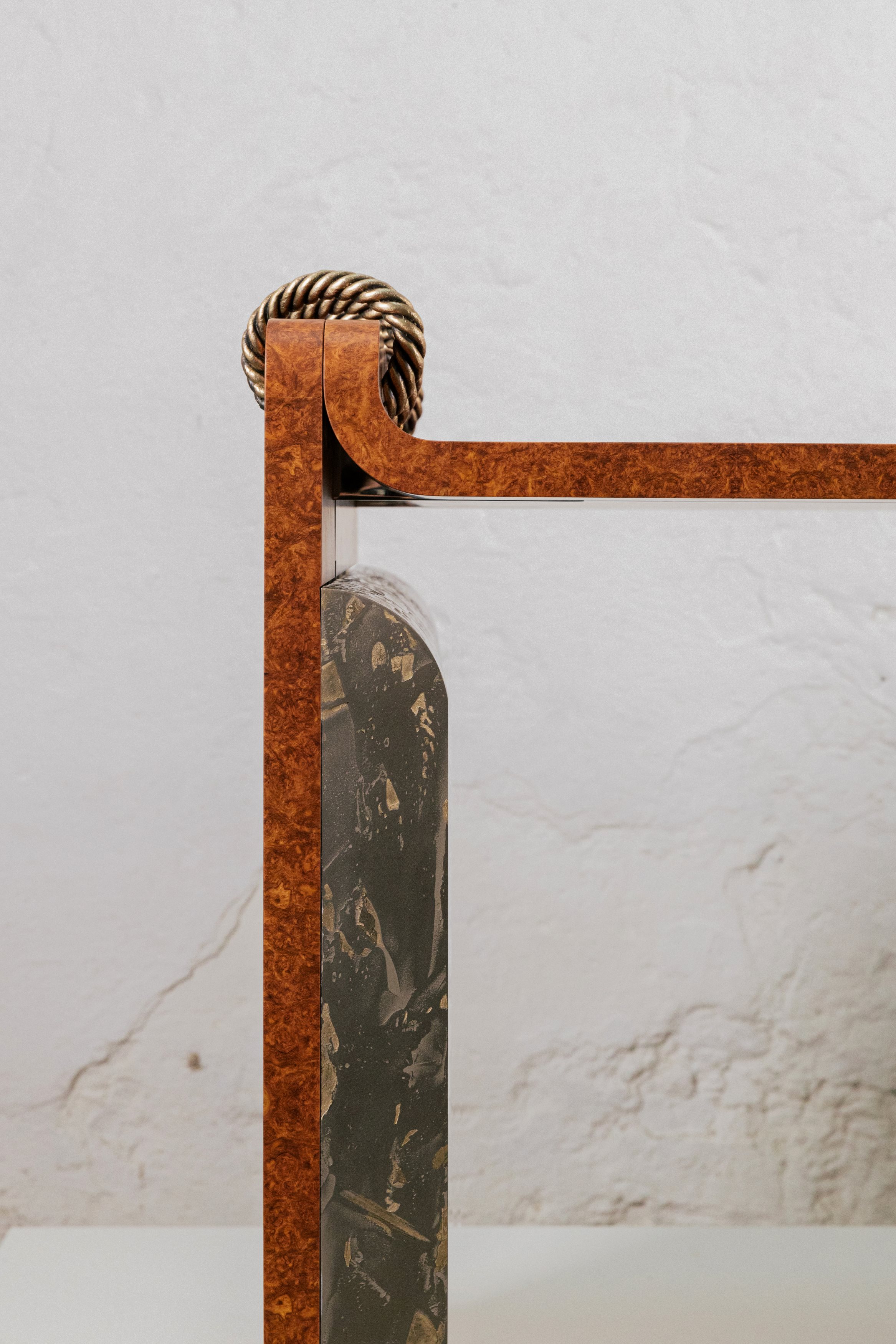 Covered in a sumptuous amboyna-burl veneer, the clean lines of the desk, its delicate touches – whipstitched rope of braided bronze, metallic side panels with gold leaf inlays – make it a functional masterpiece providing an elegant and inspiring workspace. A perfect blend of ergonomics and aesthetics.