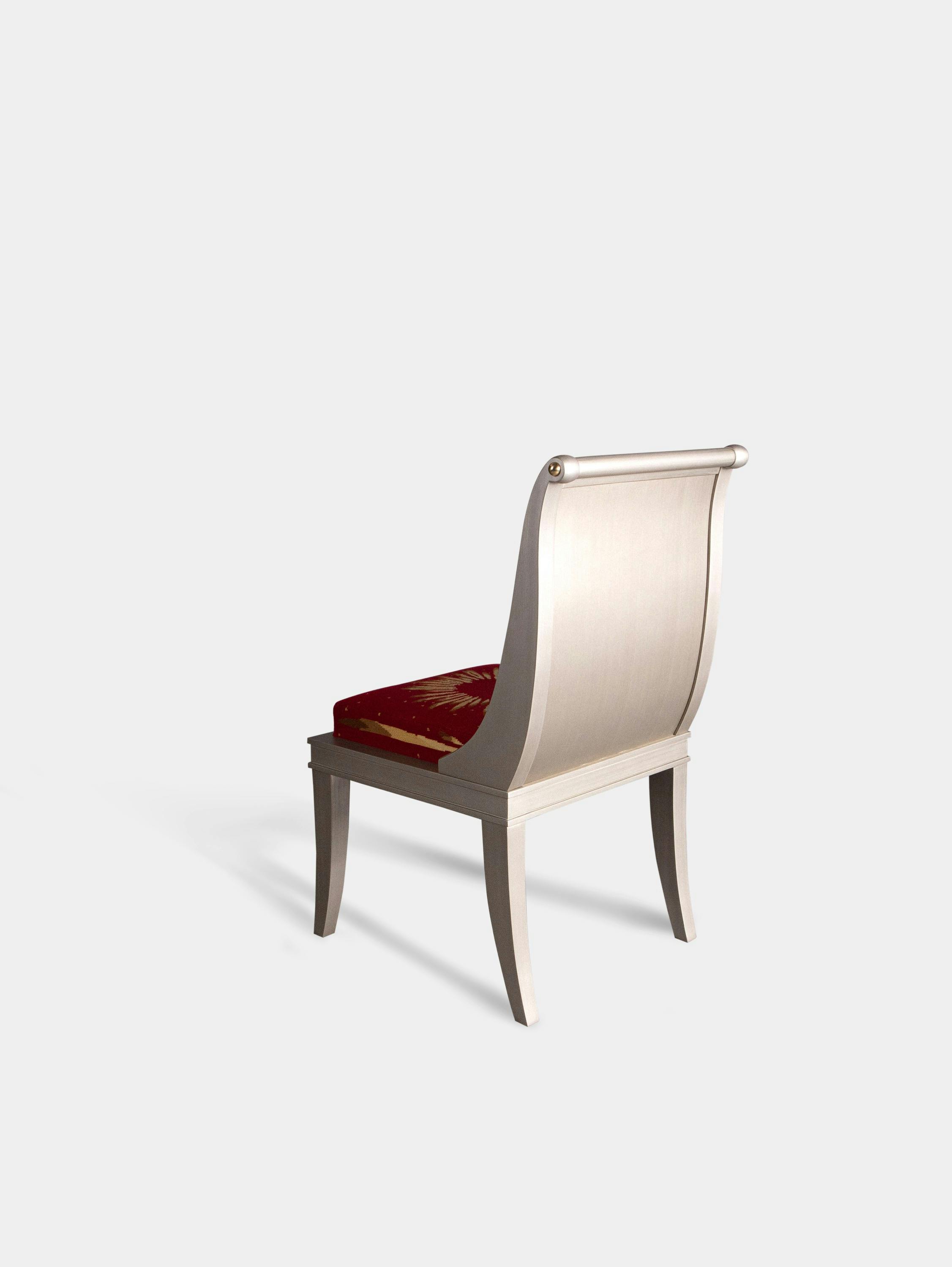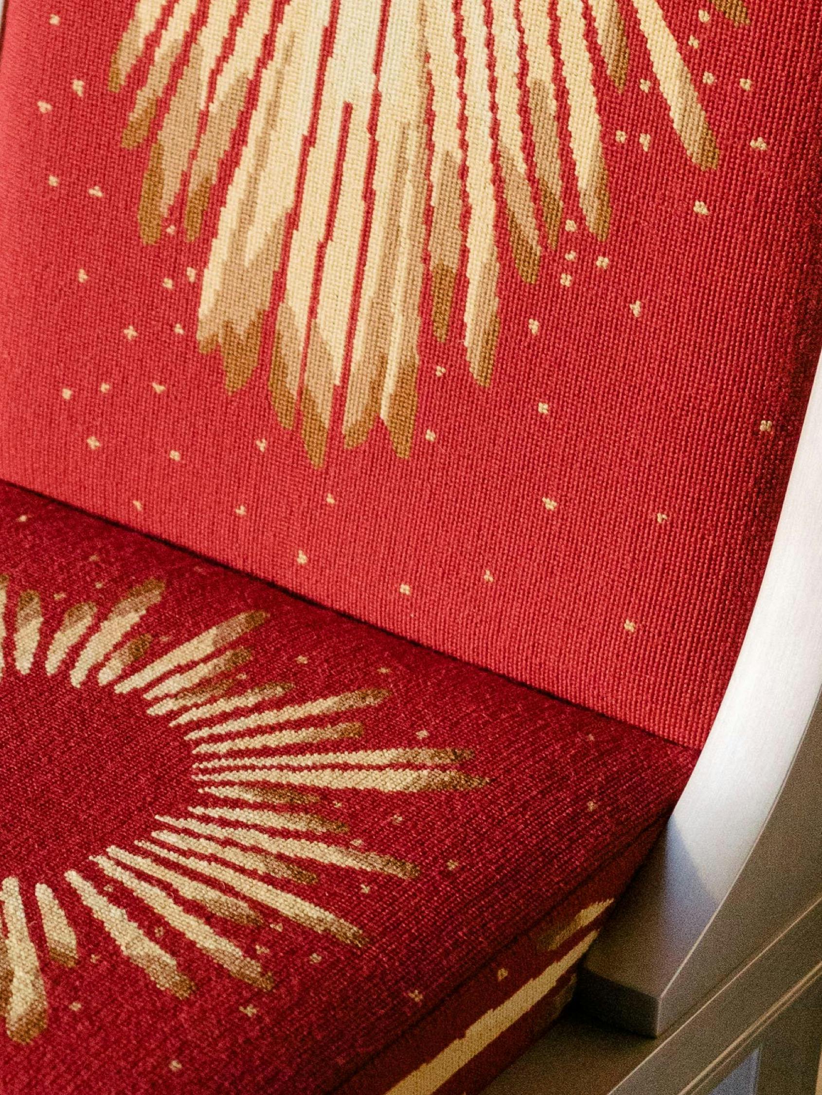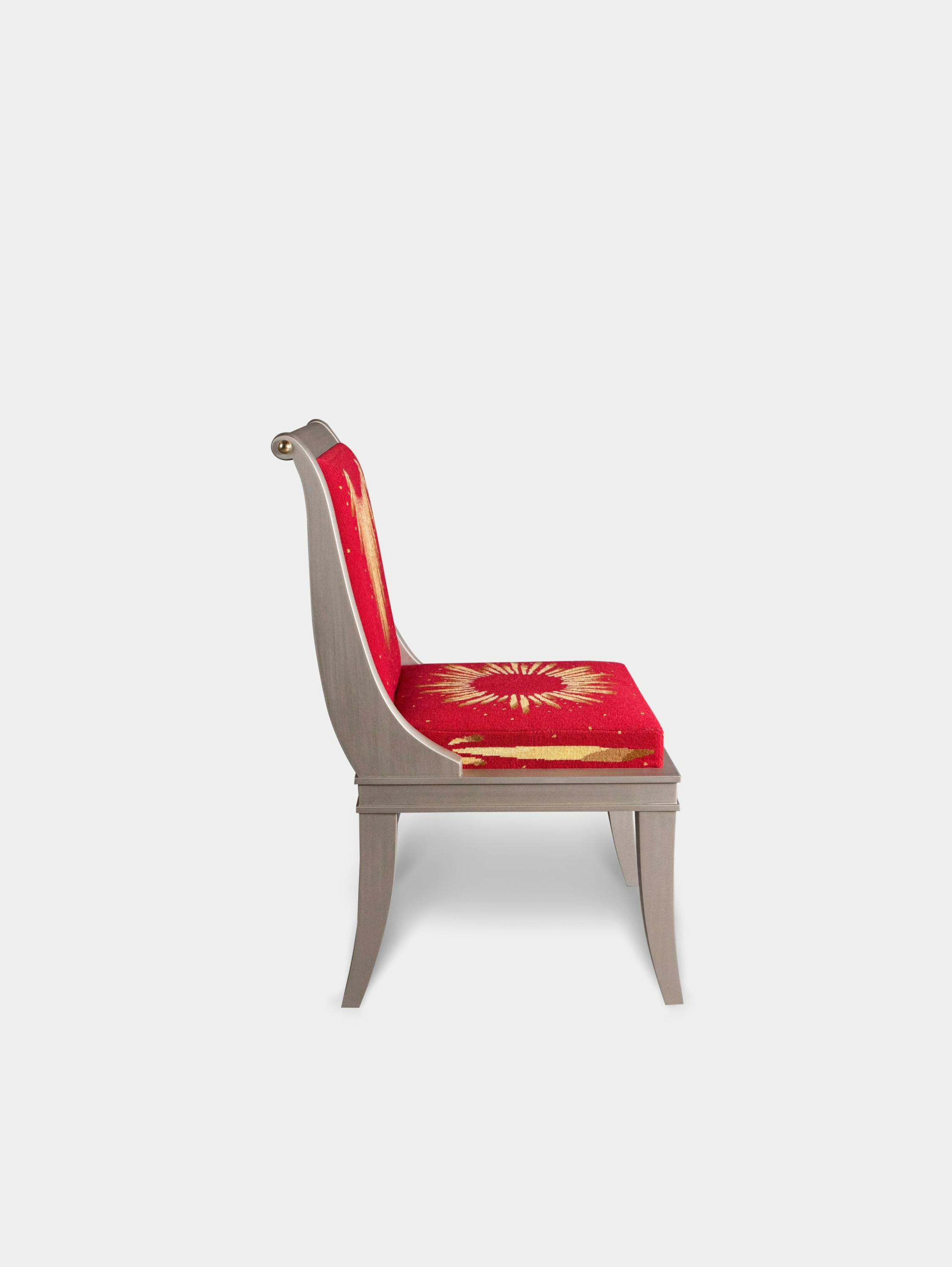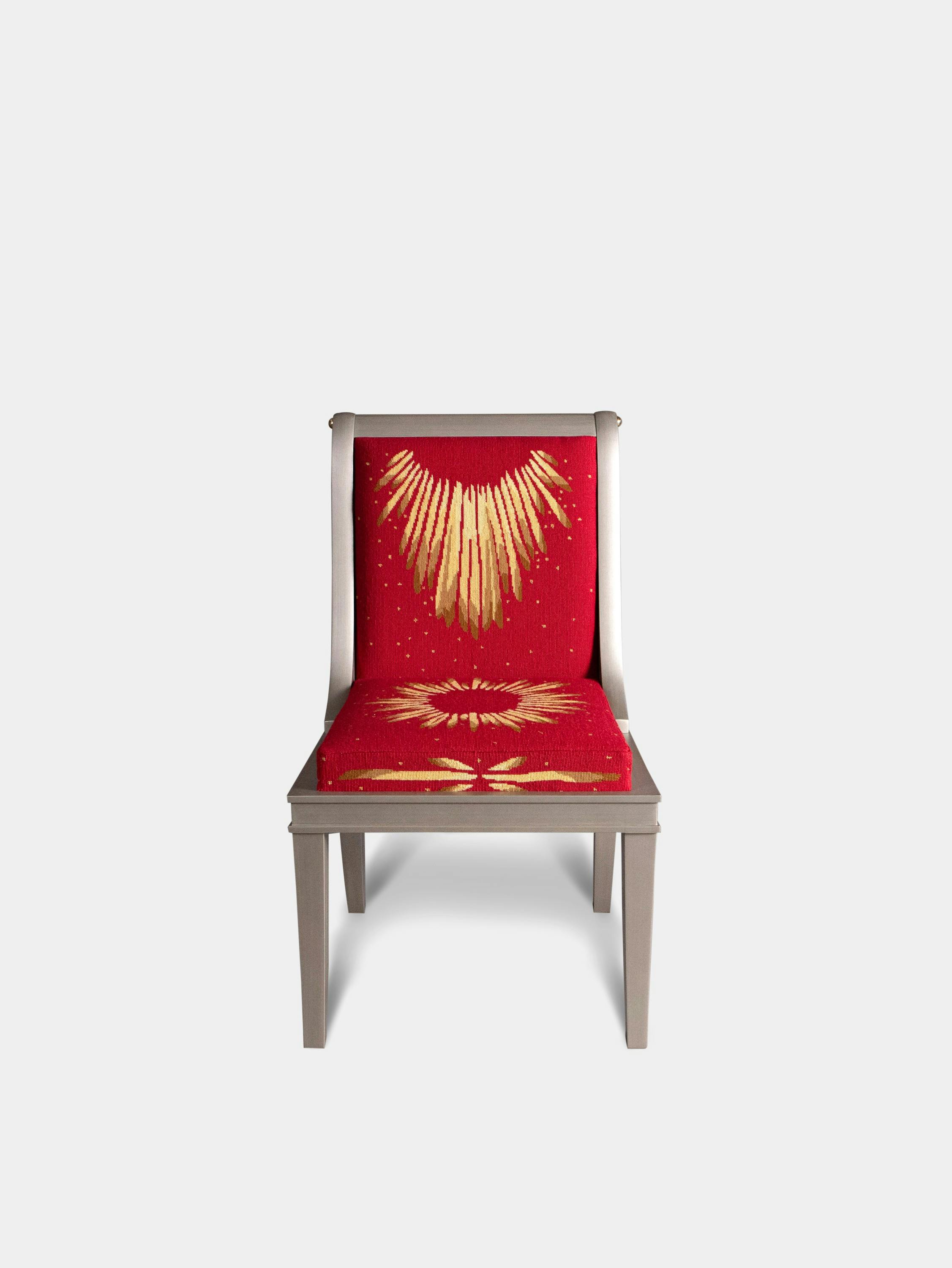 For those who are obsessed with chairs—and who among us isn’t? Rendered in fine petit point needlework, the formal sunburst design has a ceremonial feel that fortifies the piece’s Empire style. The Beauvais red colour was a favourite of the Gobelins weavers throughout history. Just off blood red, it offers warmth and strength, projecting power.