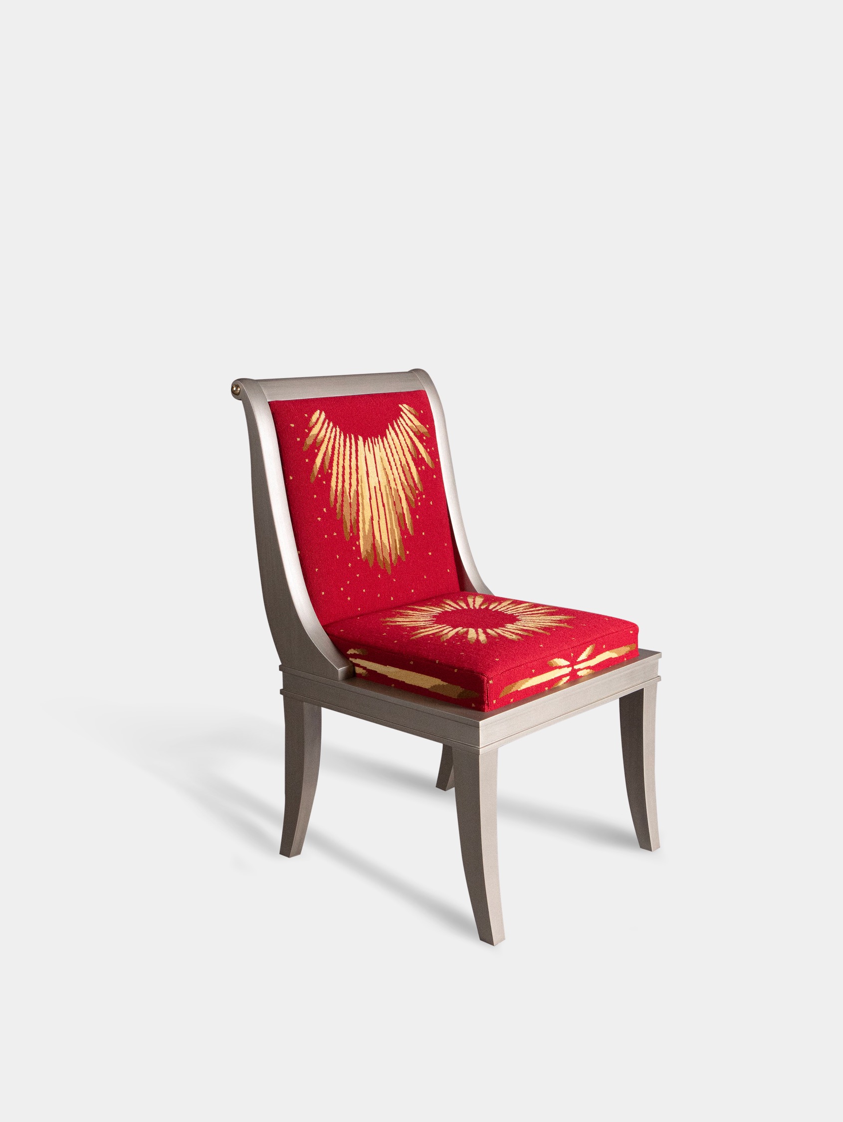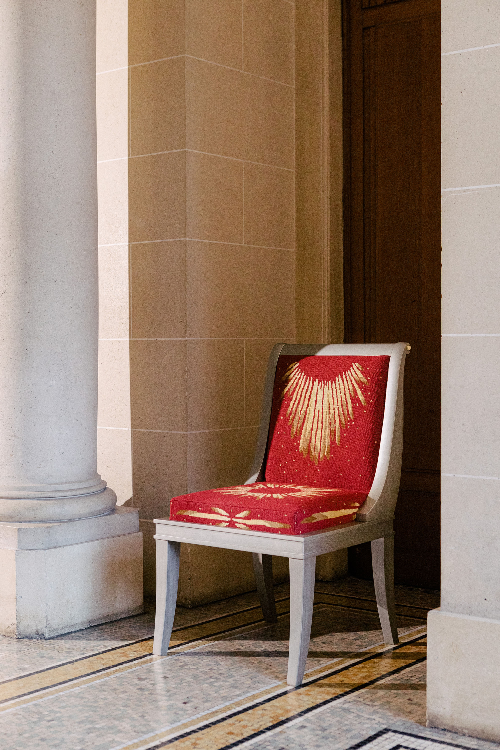 For those who are obsessed with chairs—and who among us isn’t? Rendered in fine petit point needlework, the formal sunburst design has a ceremonial feel that fortifies the piece’s Empire style. The Beauvais red colour was a favourite of the Gobelins weavers throughout history. Just off blood red, it offers warmth and strength, projecting power.