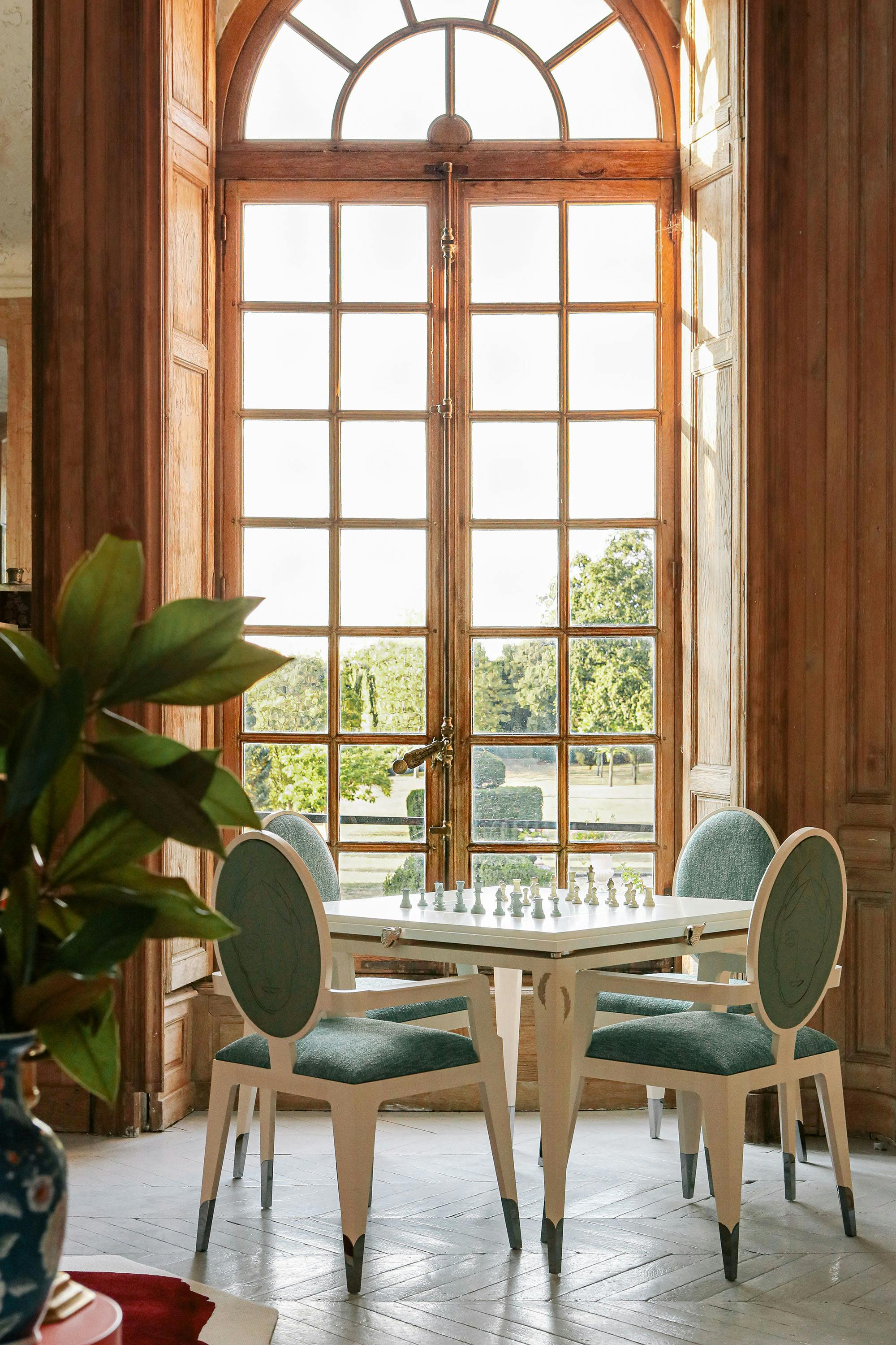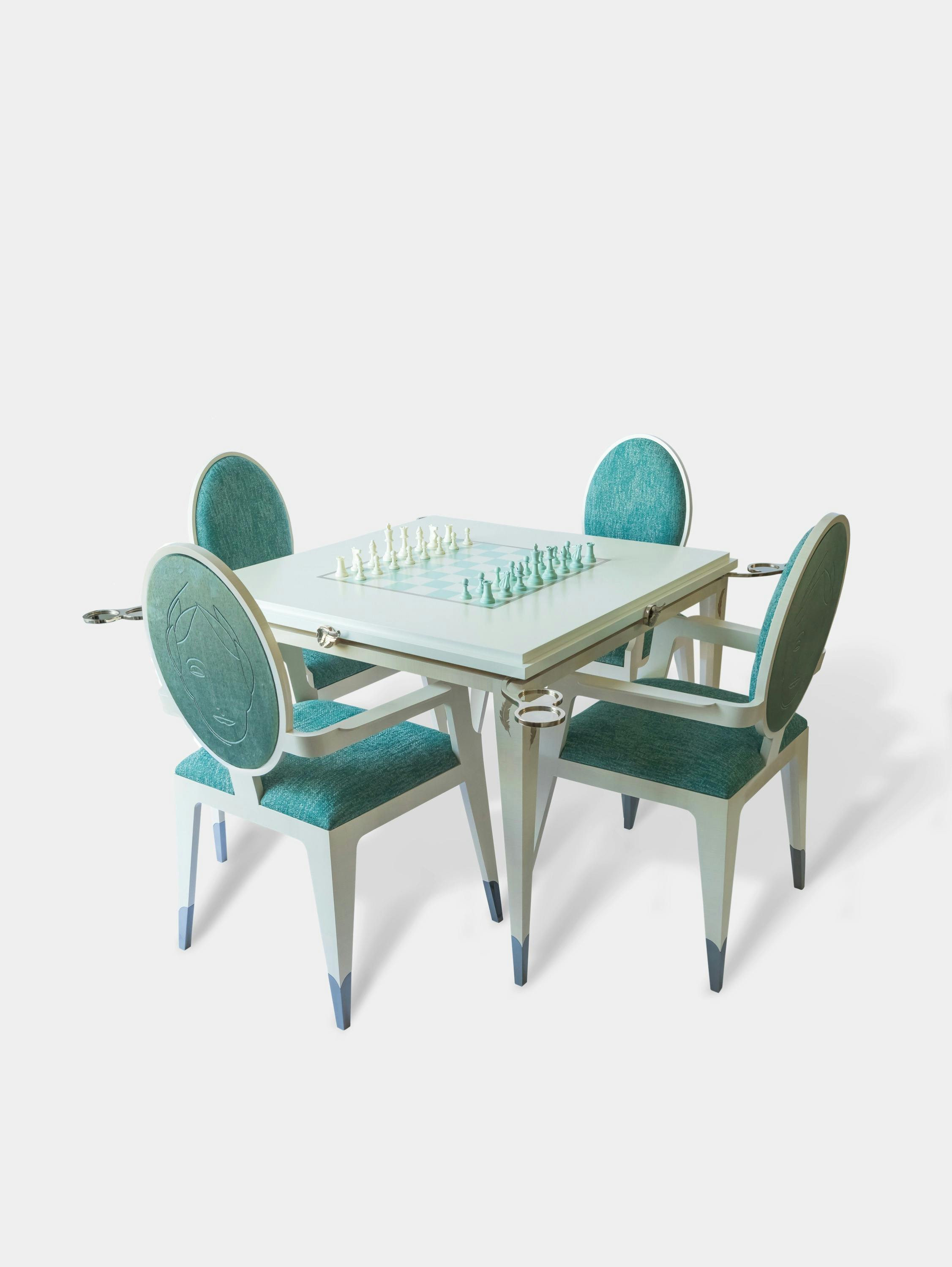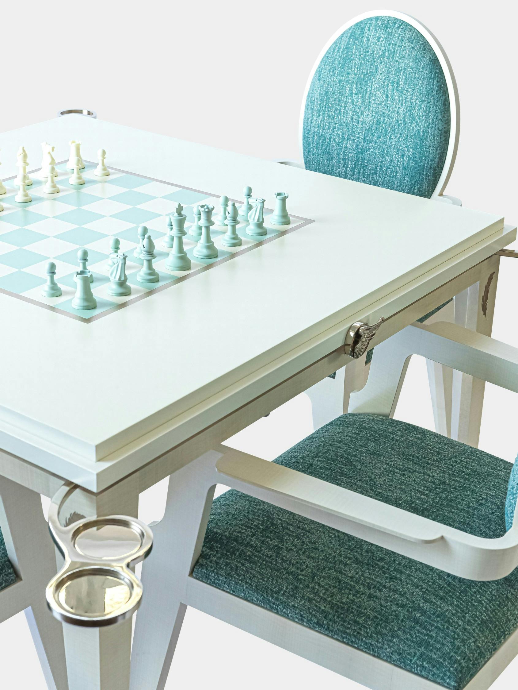 The games table is a unique creation that savvy players will appreciate. Being wider than more traditional models, it provides superior comfort over long evenings of play. Every corner features a manual system, patented by Rinck in the 1950s, that quickly causes a glass holder and ashtray holder to appear. As for the actual games, the table has a reversible top, one side designed for chess, the other with a special surface for card games. A set of matching chairs is also available.