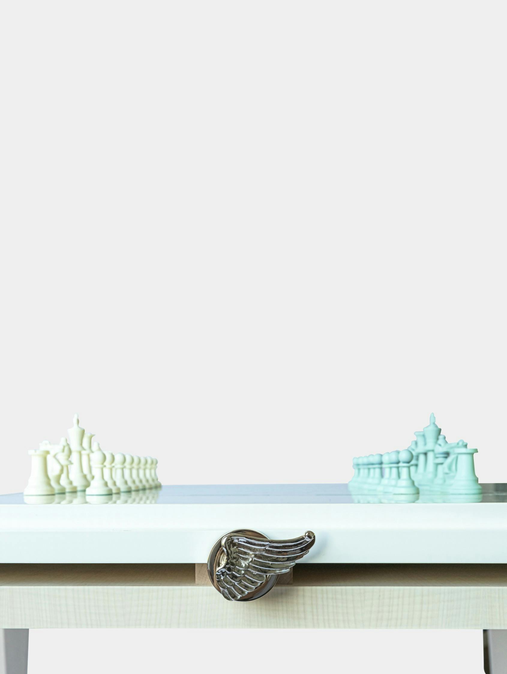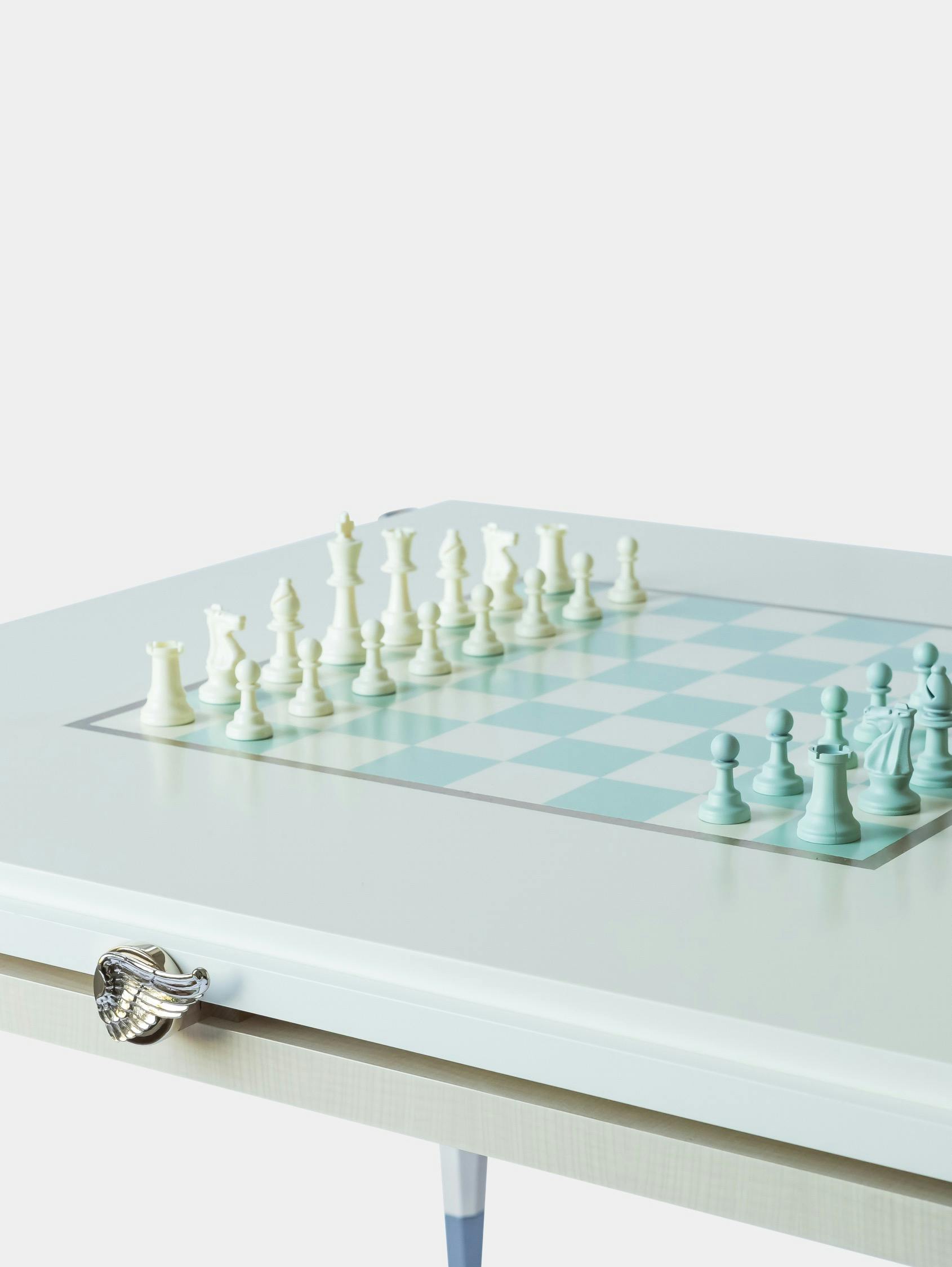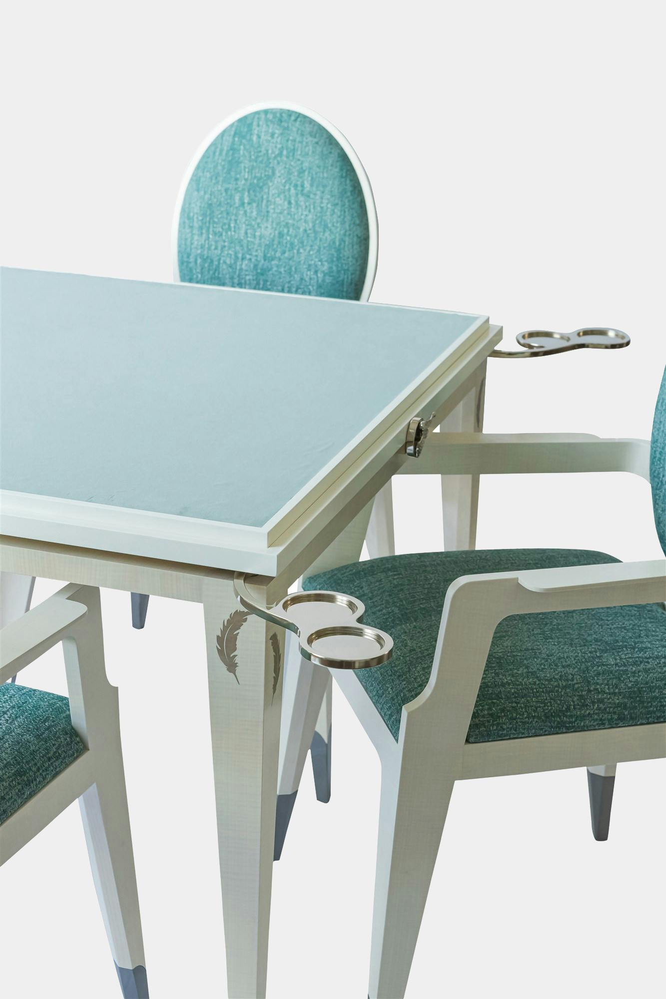 The games table is a unique creation that savvy players will appreciate. Being wider than more traditional models, it provides superior comfort over long evenings of play. Every corner features a manual system, patented by Rinck in the 1950s, that quickly causes a glass holder and ashtray holder to appear. As for the actual games, the table has a reversible top, one side designed for chess, the other with a special surface for card games. A set of matching chairs is also available.