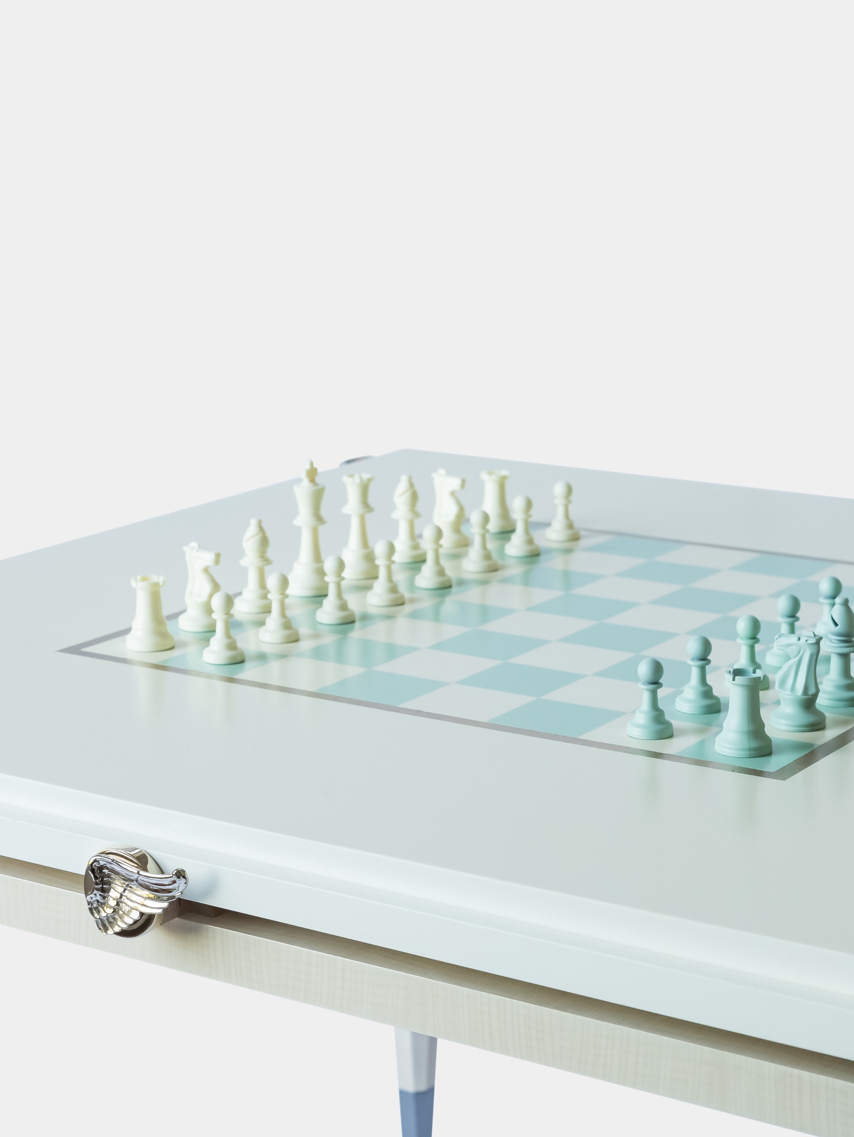The games table is a unique creation that savvy players will appreciate. Being wider than more traditional models, it provides superior comfort over long evenings of play. Every corner features a manual system, patented by Rinck in the 1950s, that quickly causes a glass holder and ashtray holder to appear. As for the actual games, the table has a reversible top, one side designed for chess, the other with a special surface for card games. A set of matching chairs is also available.