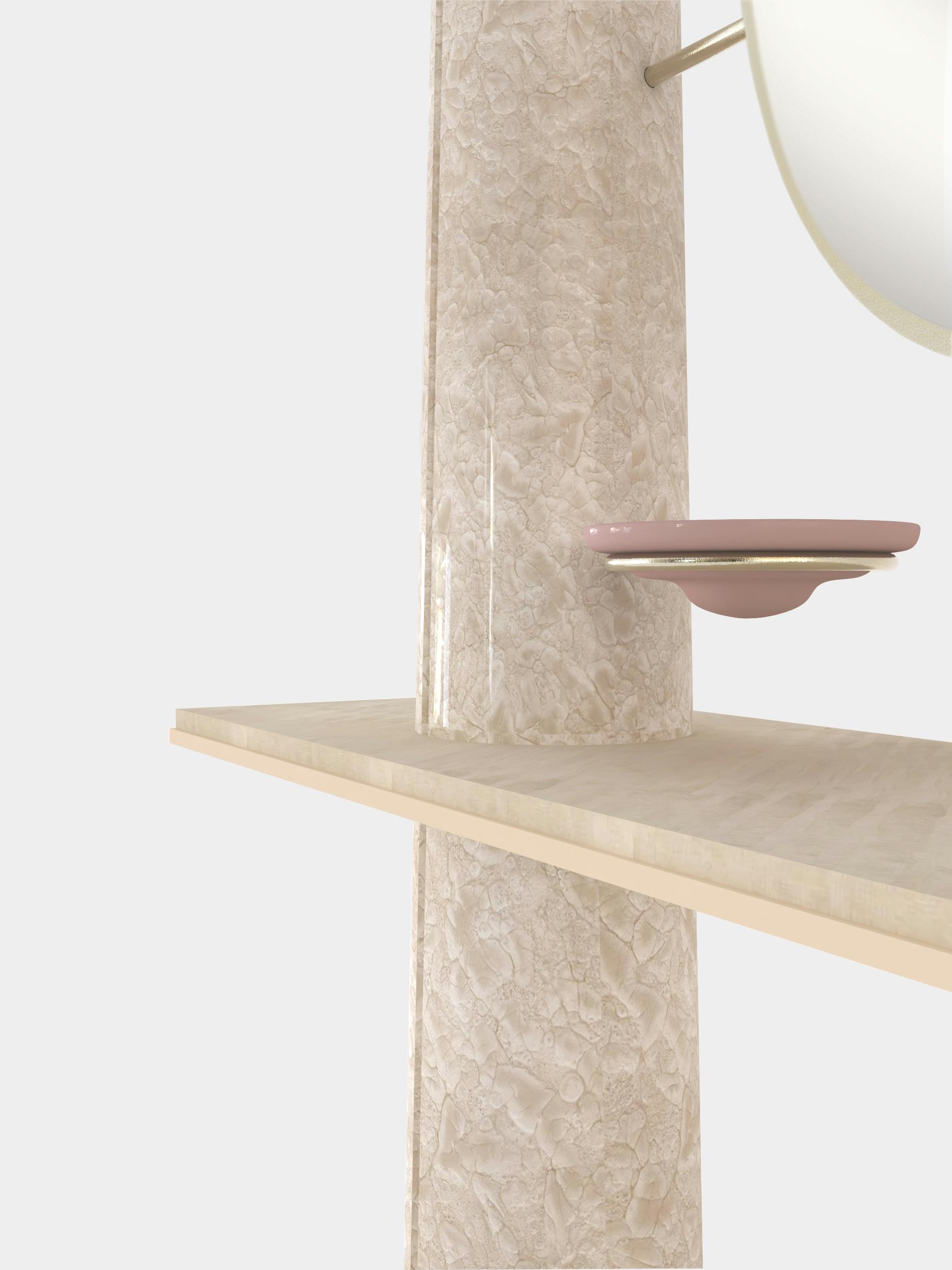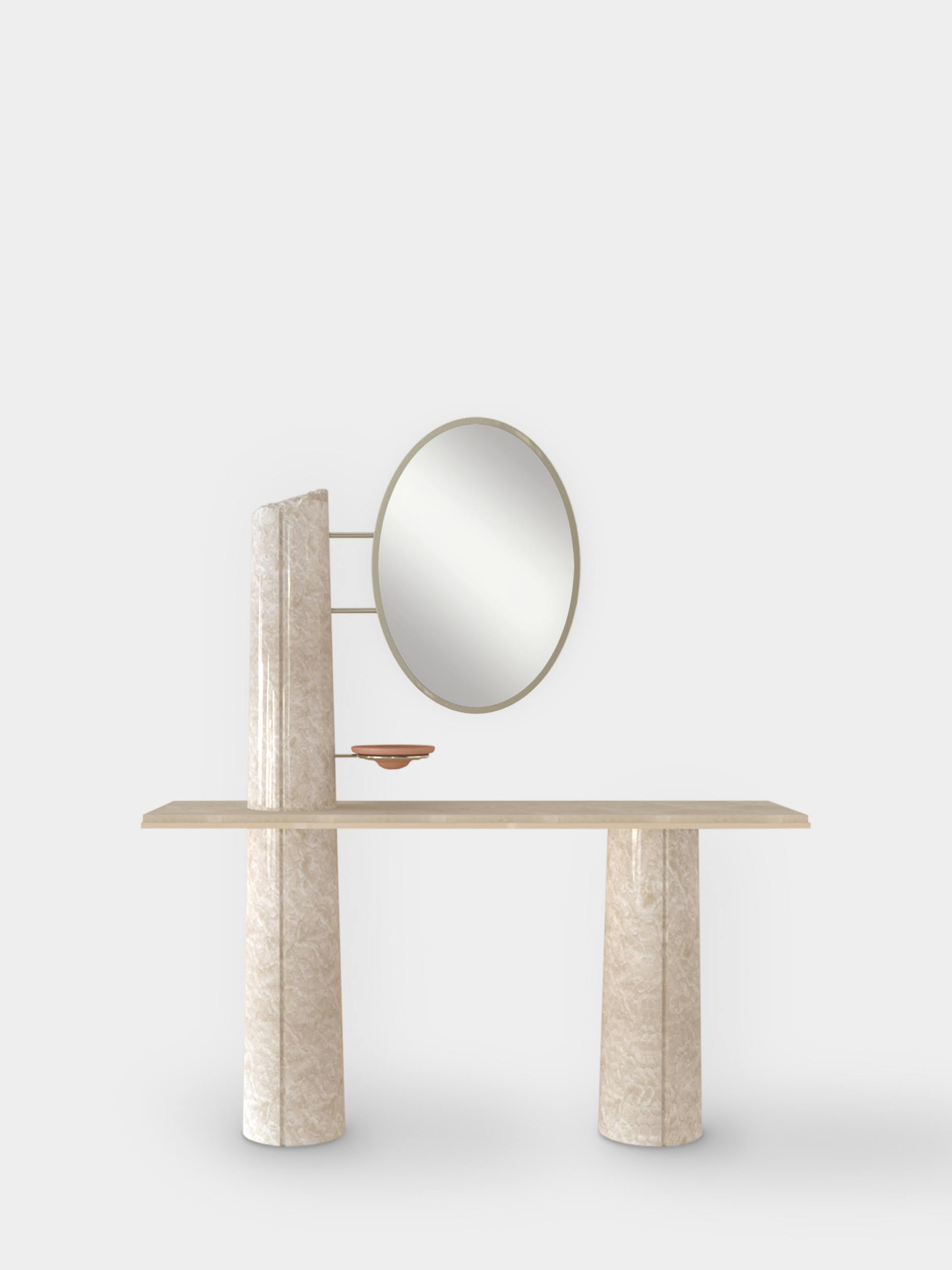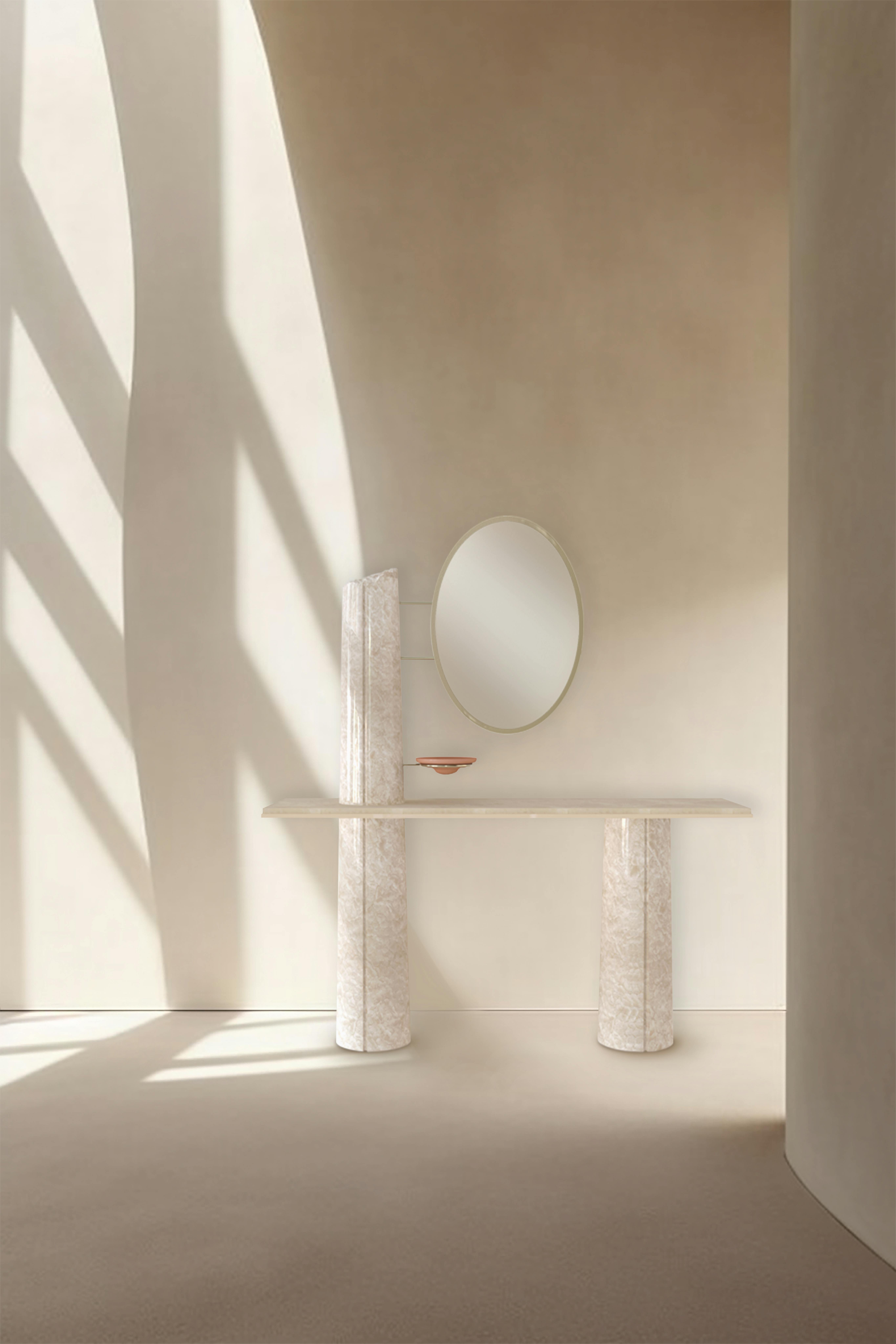 The Passage collection’s console table, as imagined by Rinck’s design experts, is an uncommon interpretation of the ravages of time as seen in a pair of antique-inspired columns that are made to appear aged and worn. With its two-tone tabletop in maple and colored lacquer, this piece serves a dual purpose, functioning as both furniture for everyday use, such as in a mudroom or bedroom, and a work of art in its own right.