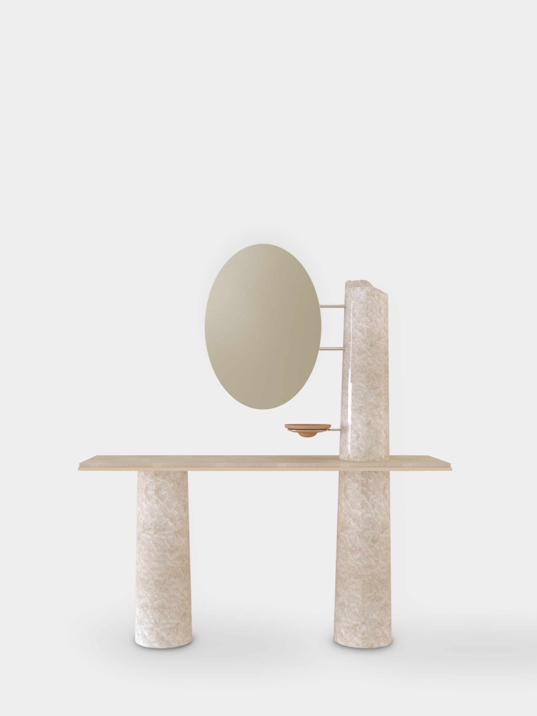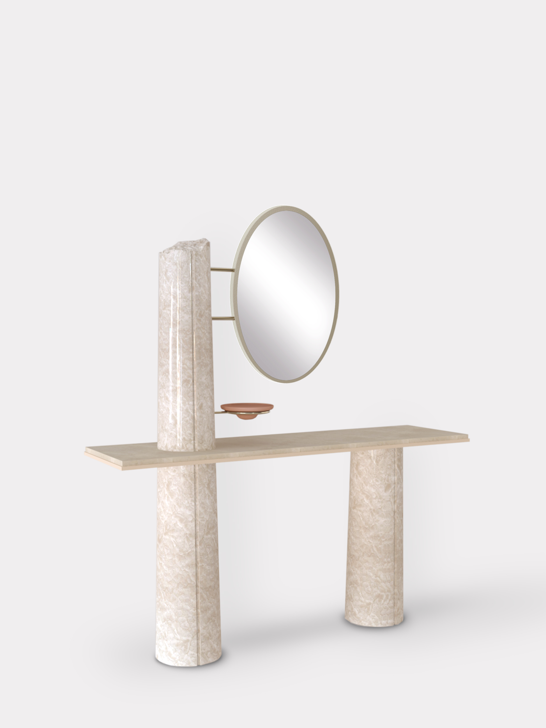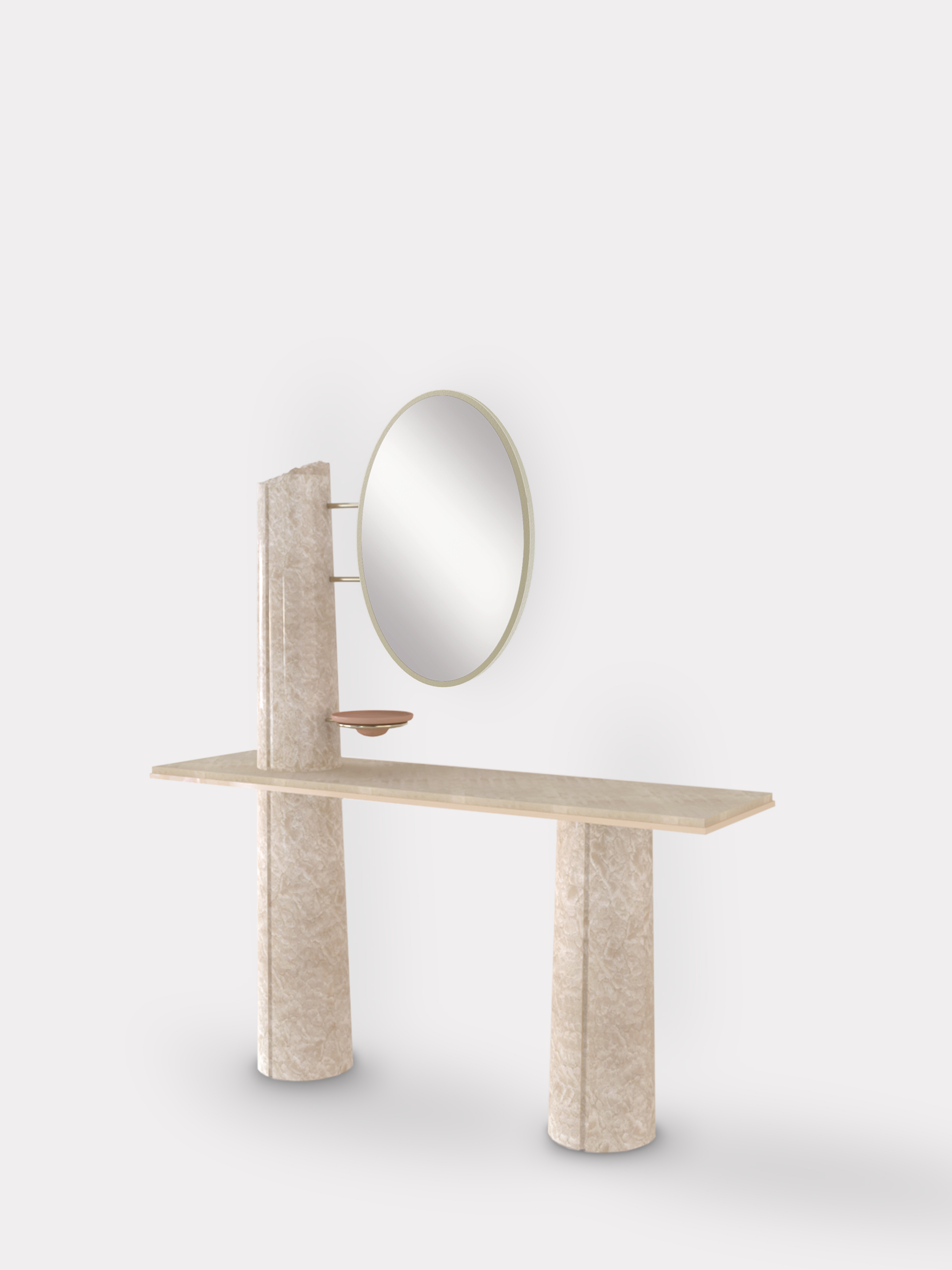The Passage collection’s console table, as imagined by Rinck’s design experts, is an uncommon interpretation of the ravages of time as seen in a pair of antique-inspired columns that are made to appear aged and worn. With its two-tone tabletop in maple and colored lacquer, this piece serves a dual purpose, functioning as both furniture for everyday use, such as in a mudroom or bedroom, and a work of art in its own right.